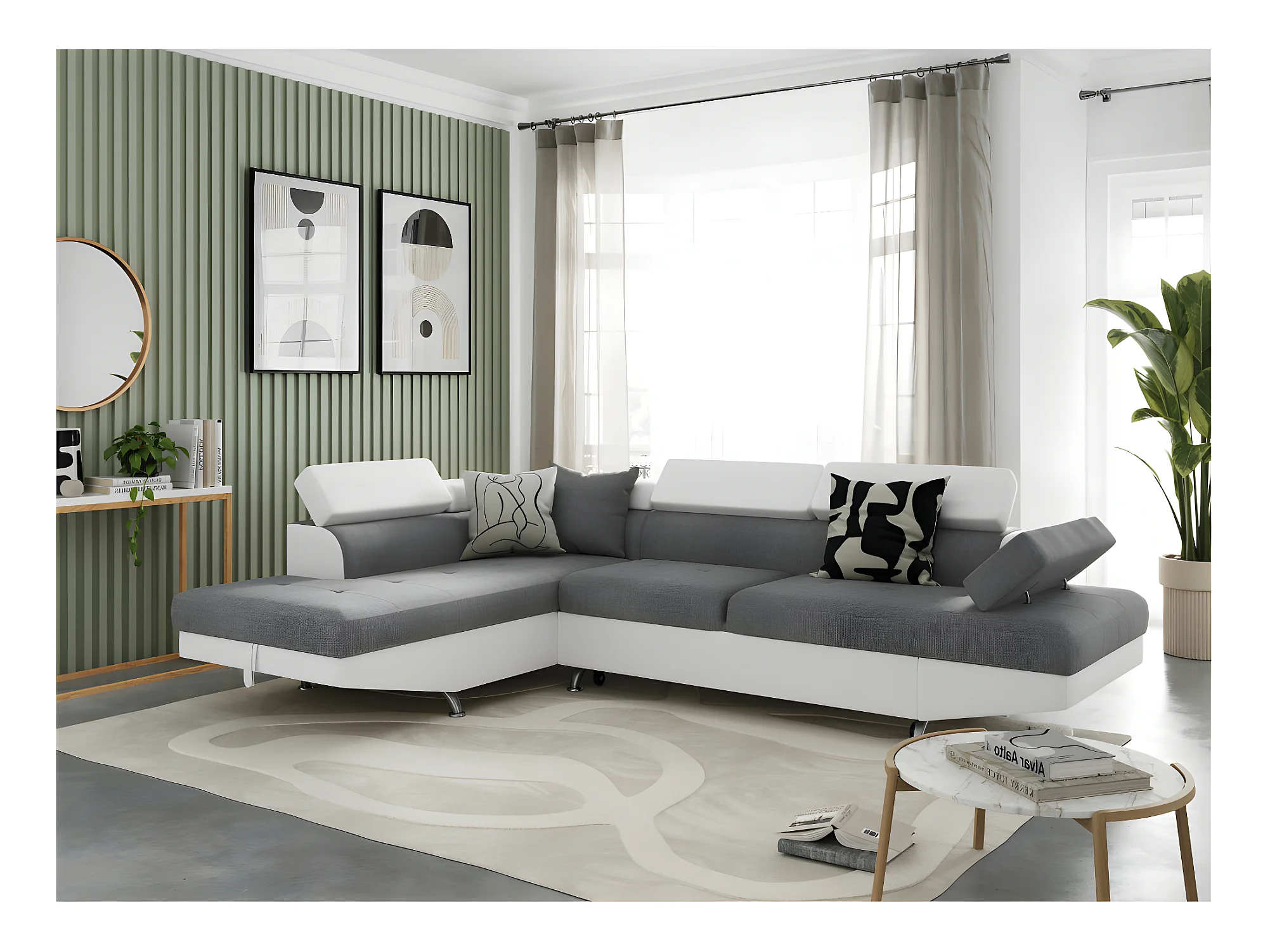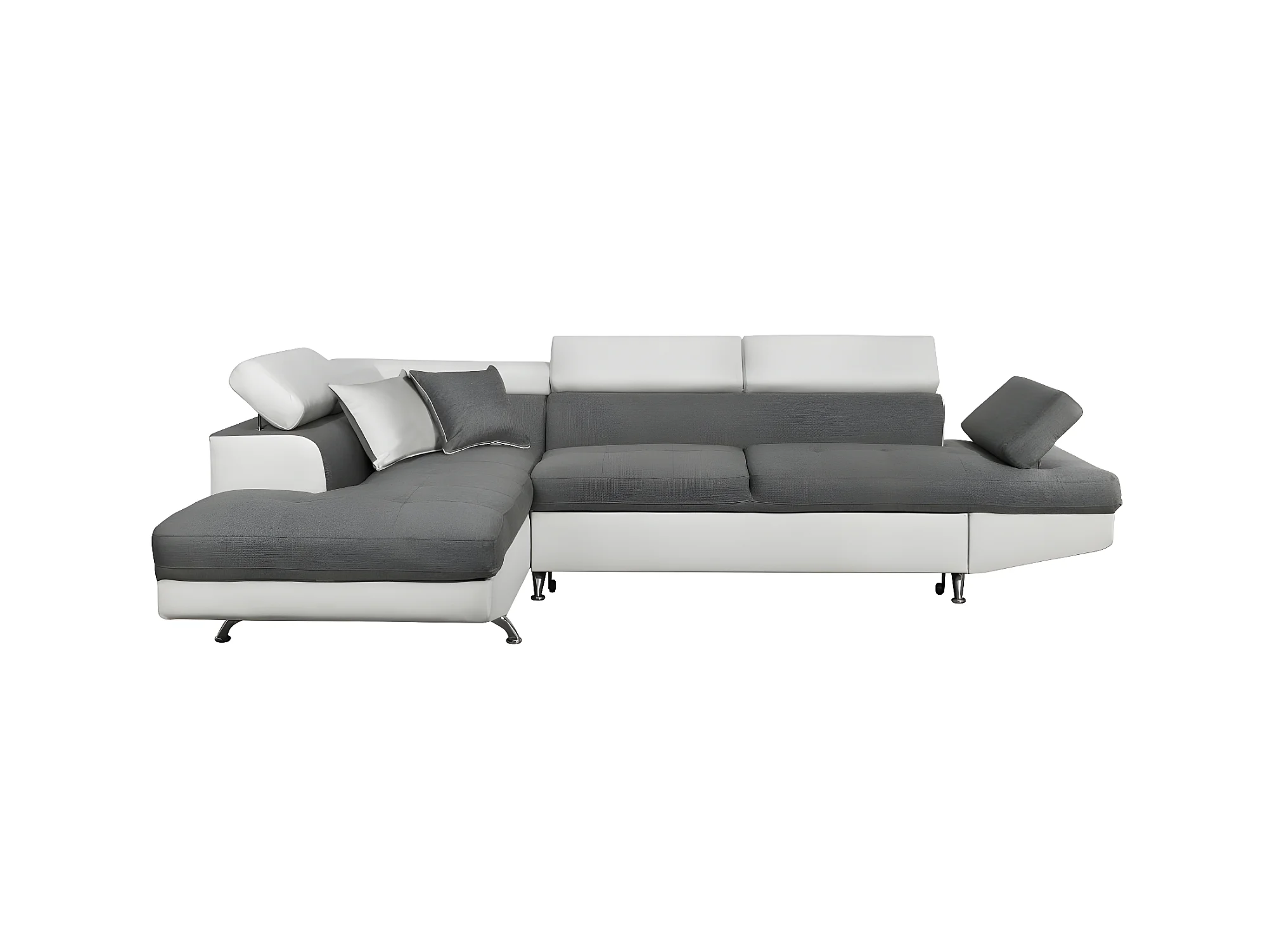 Canapé d'angle gauche 5 places Rio Convertible avec coffre en tissu et simili - Blanc/Gris - L271 x P192 x H70cm - Loungitude