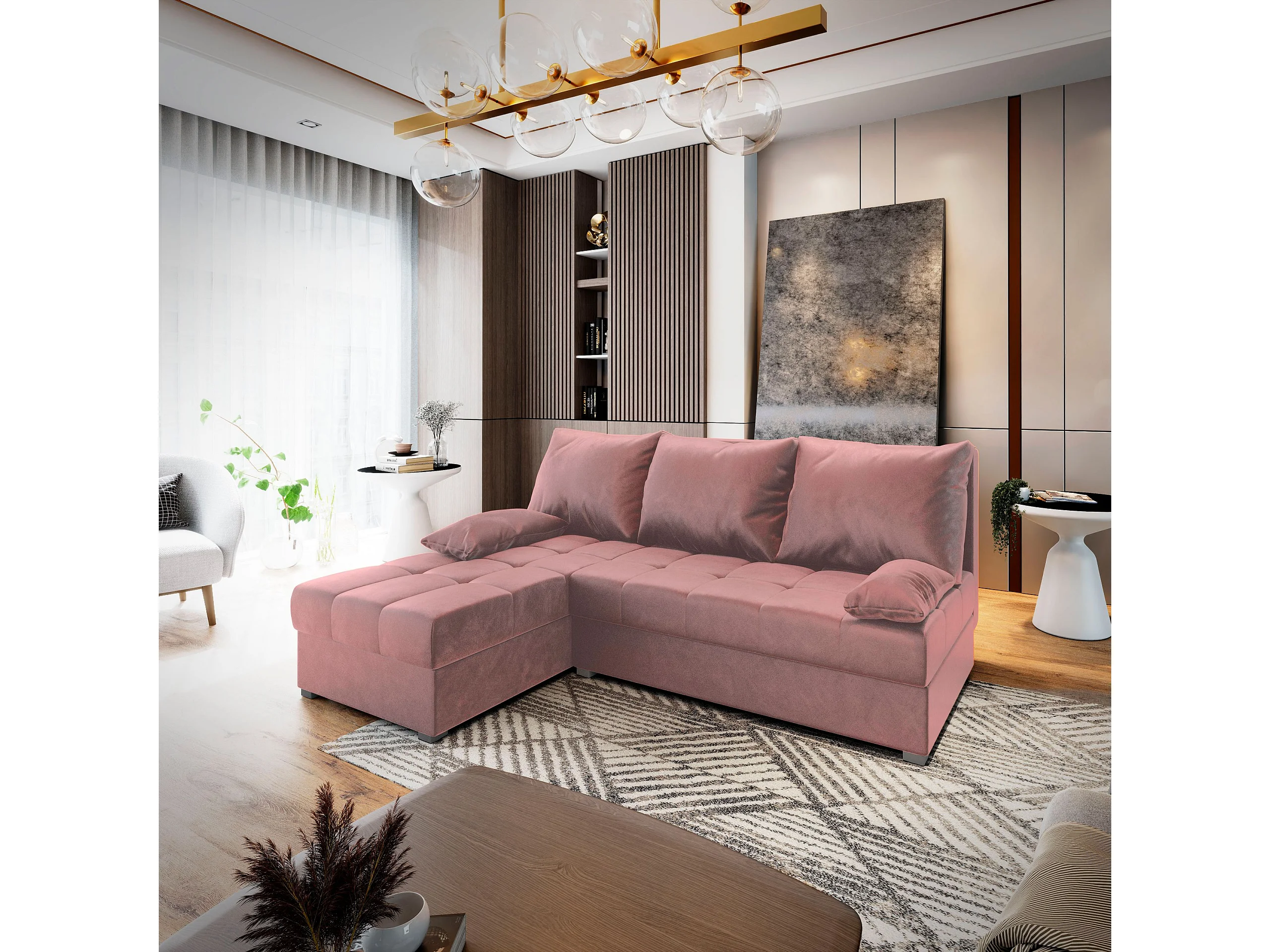 Canapé d'angle RITA Rose poudré en peluche avec fonction de couchage