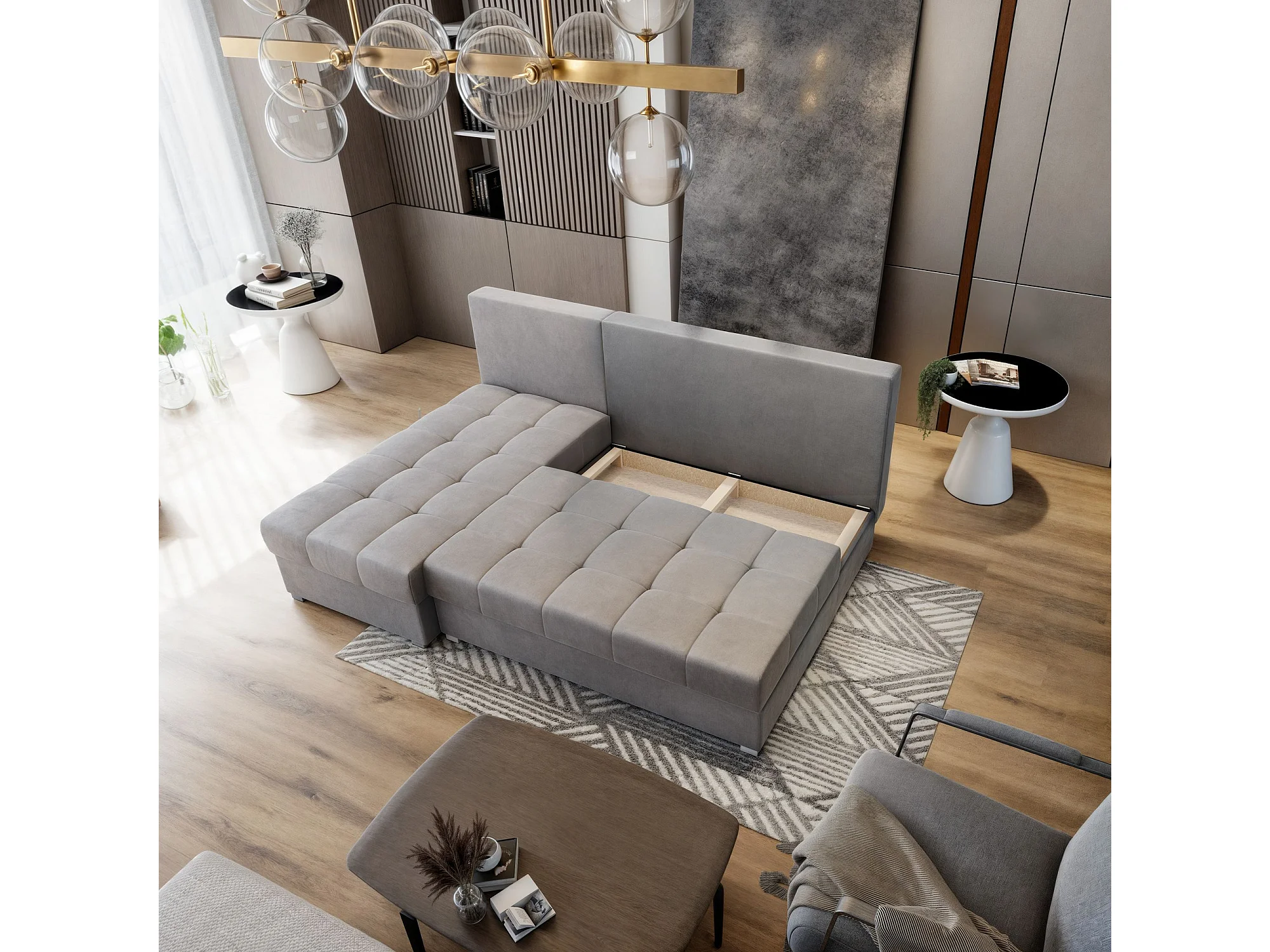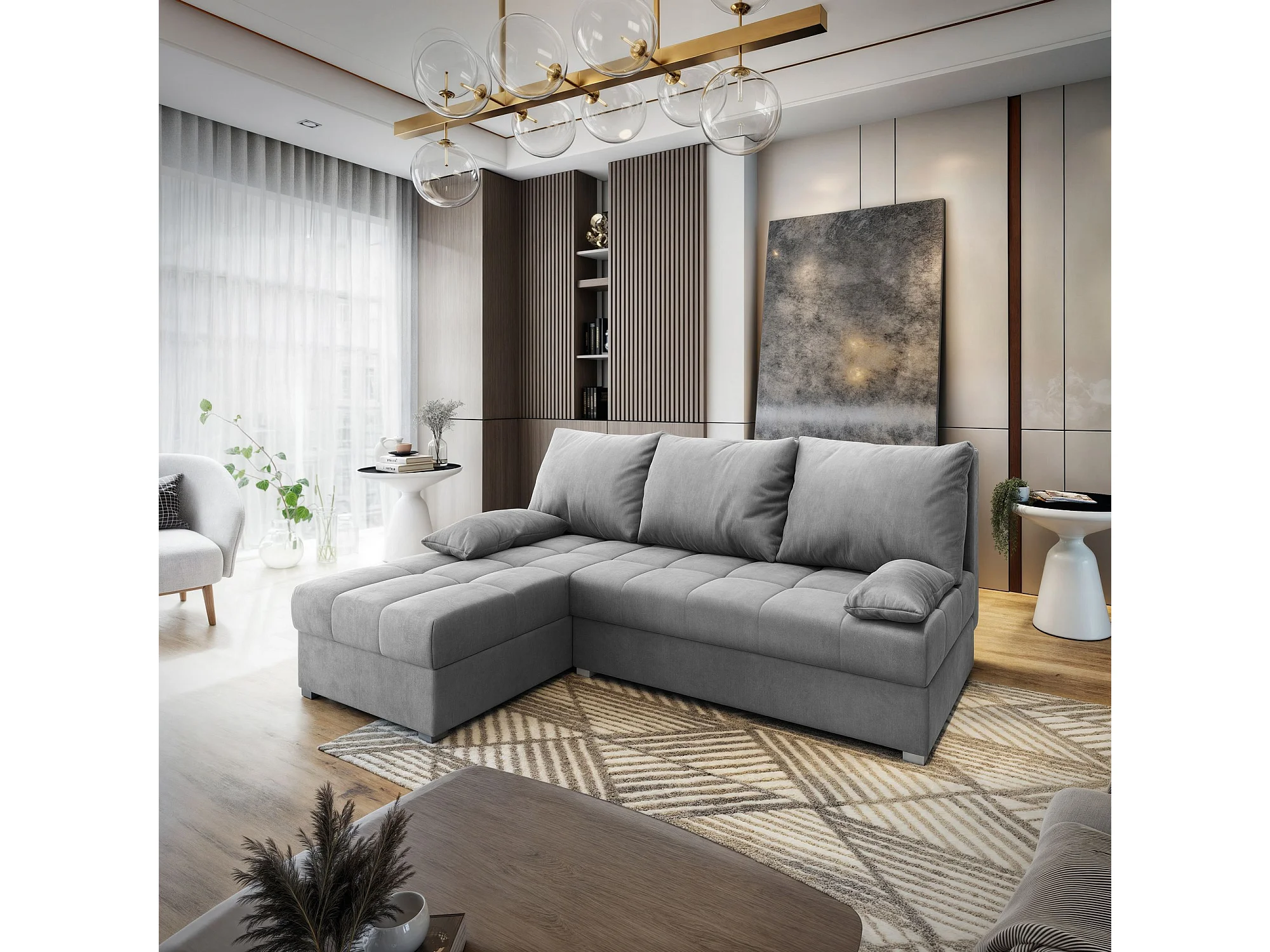 Canapé d'angle RITA Gris clair en velours avec fonction de couchage