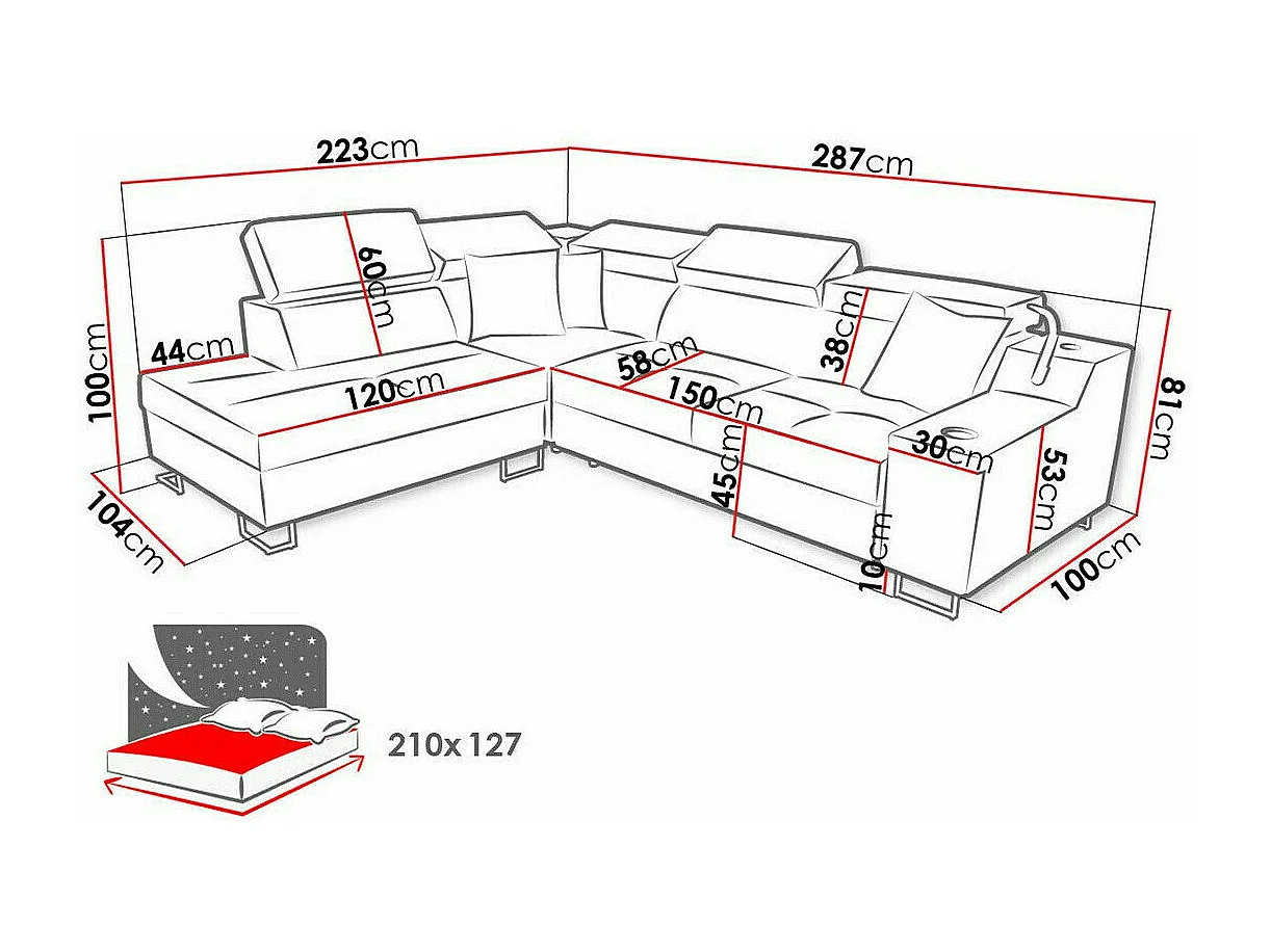 Canapé d'angle Sarasota 138, Noir, Fonction de couchage, Boîte de literie, 287x223x100cm