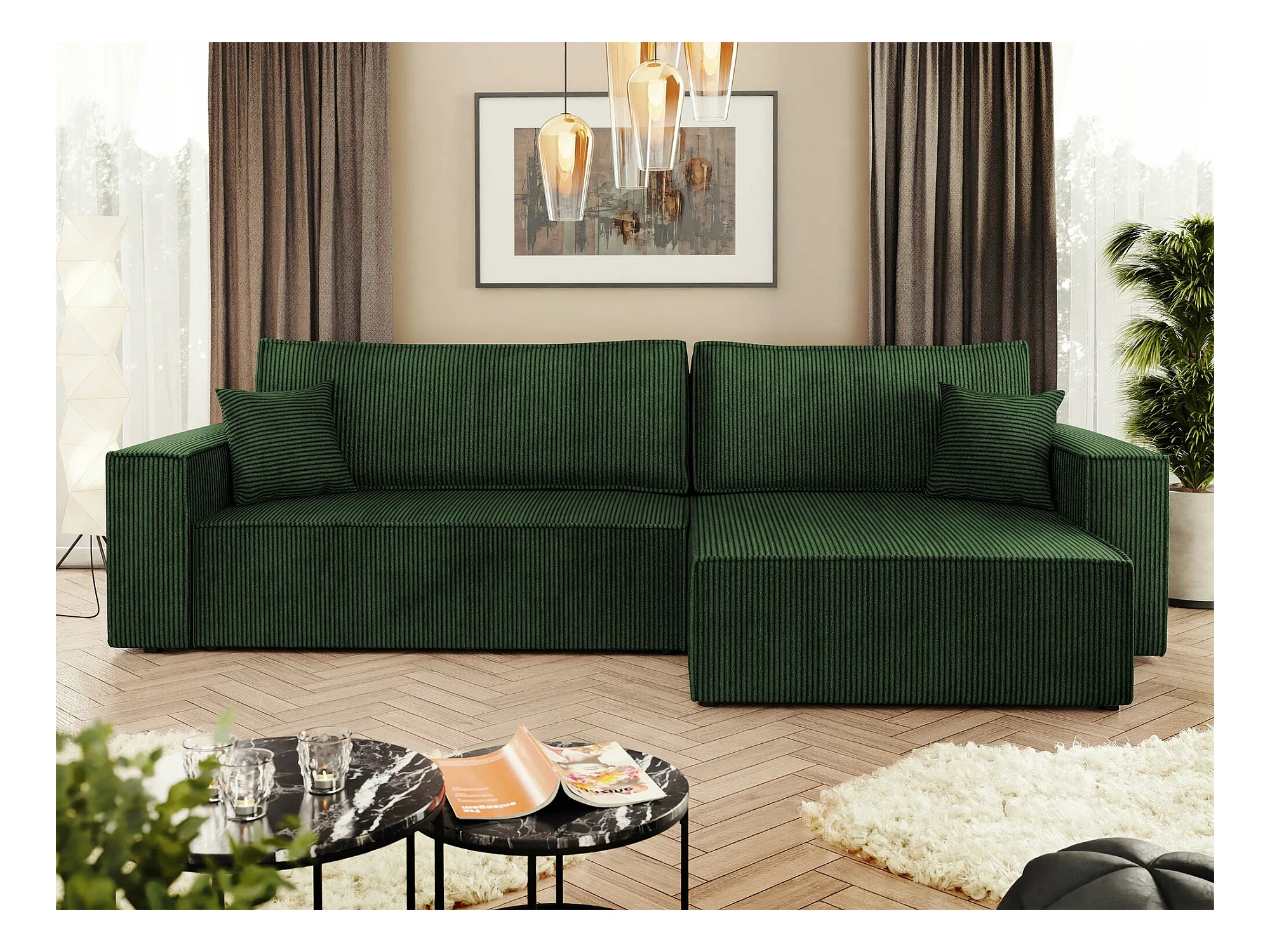 Canapé d'angle Shelton 107, Vert, Fonction de couchage, Boîte de literie, 272x145x82cm