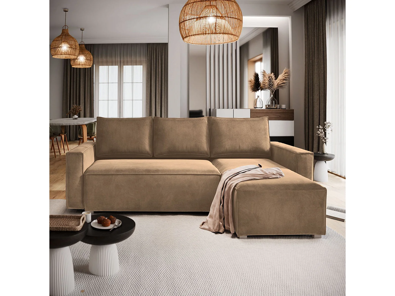 Canapé d'angle SILES Beige en velours avec fonction de couchage