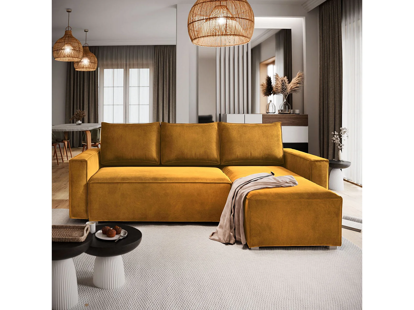 Canapé d'angle SILES Jaune en velours avec fonction de couchage