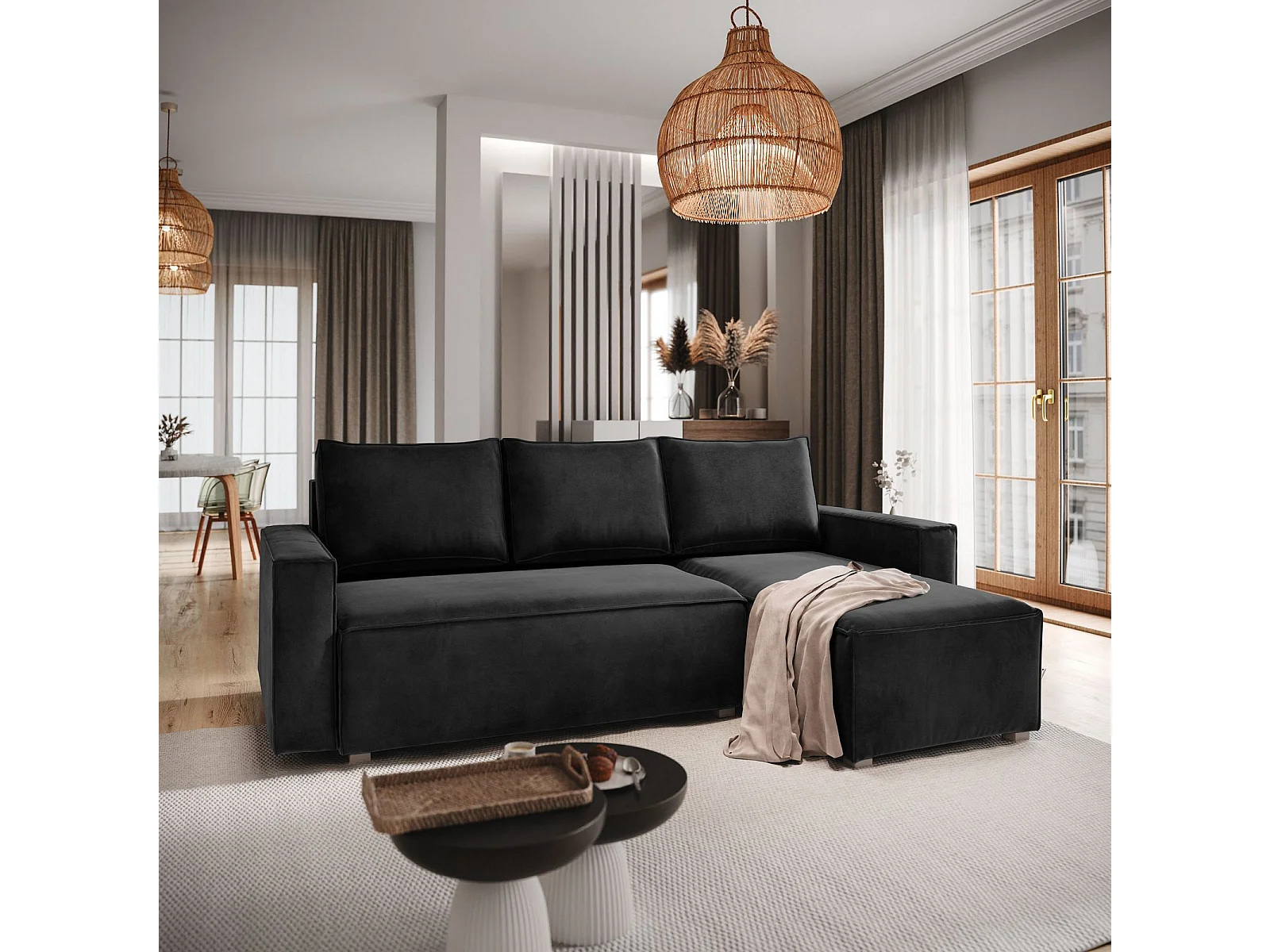 Canapé d'angle SILES Noir en velours avec fonction de couchage