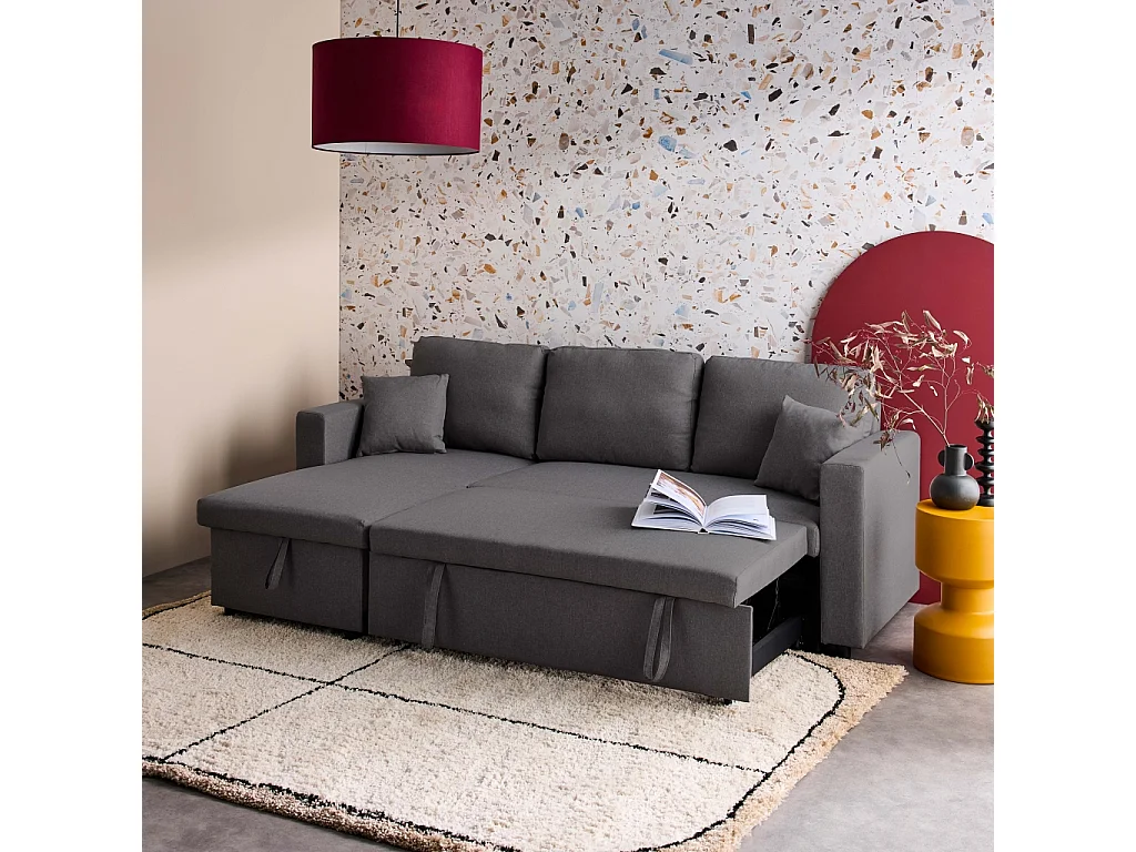 Canapé d'angle SMILE convertible réversible compact 3 places en tissu gris foncé. L 213.5 x P 136.5 x H 83cm. avec coffre de rangement