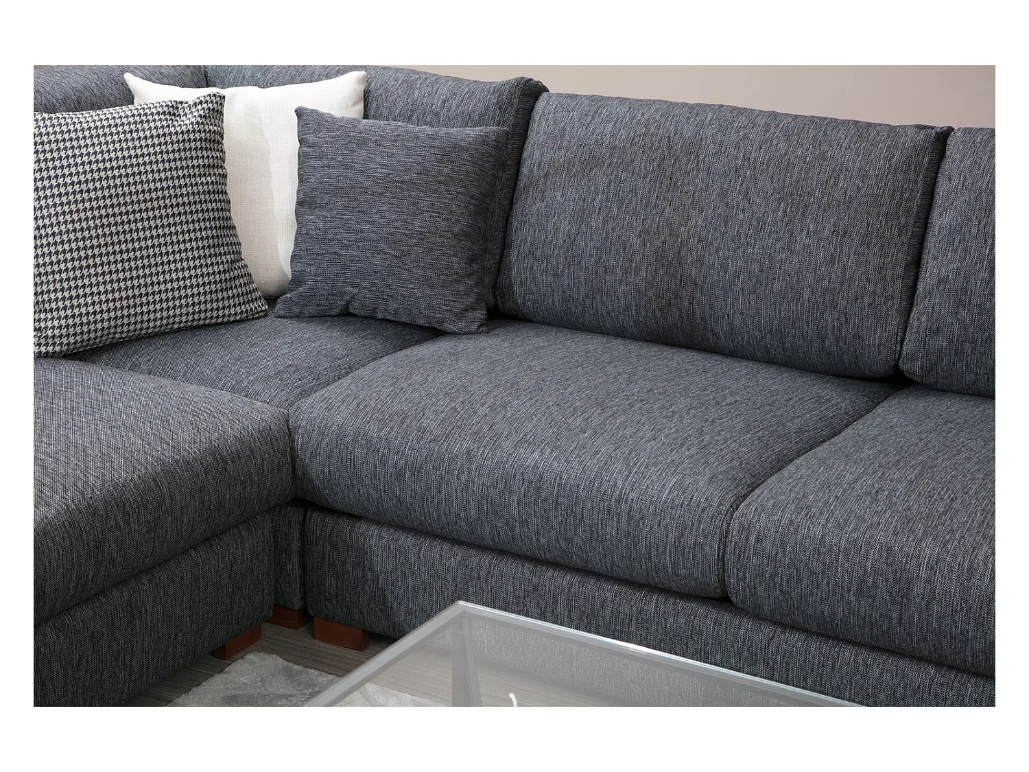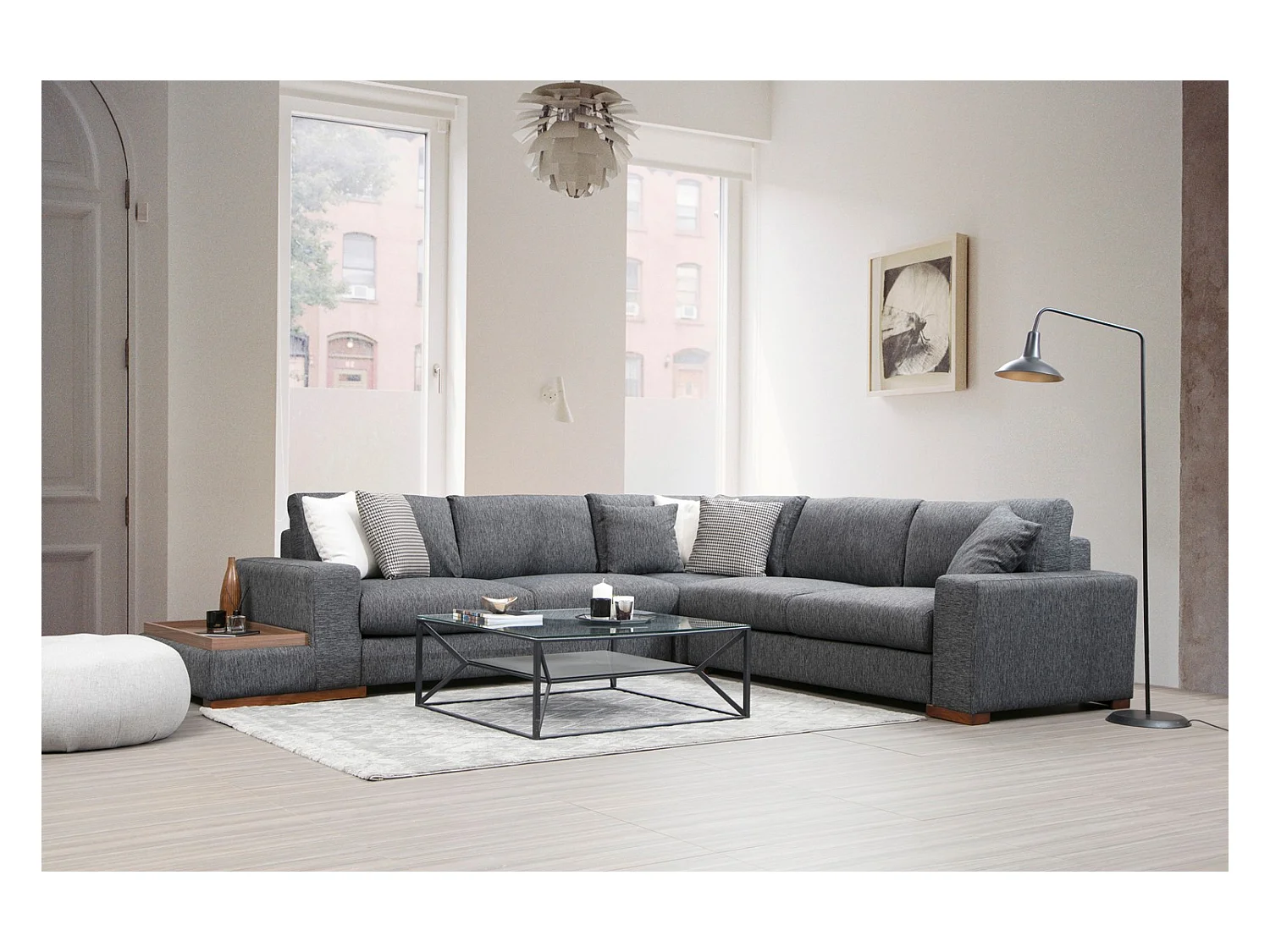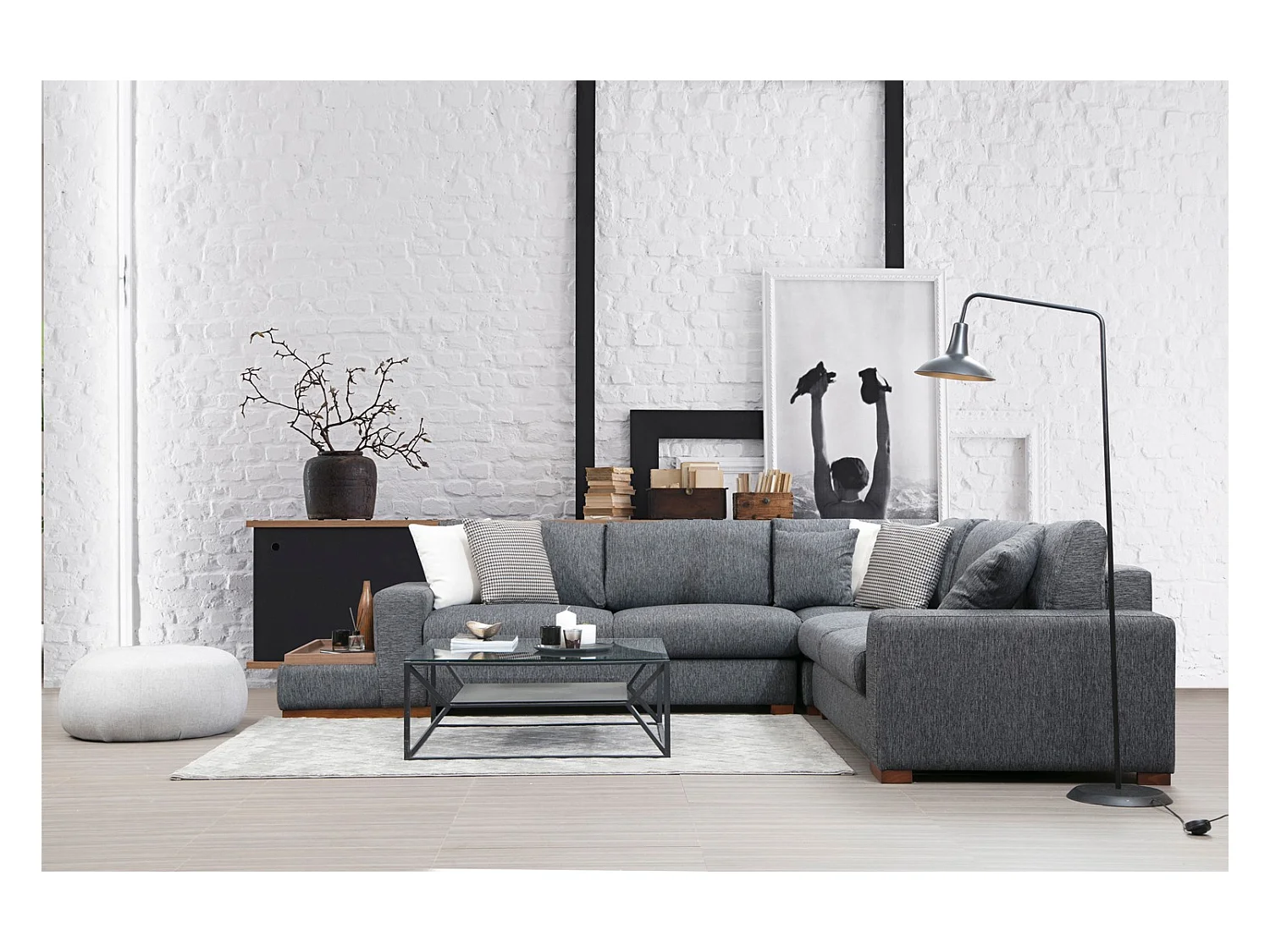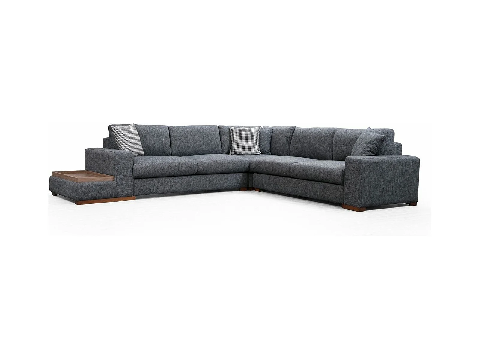 Canapé d'angle tissu anthracite avec étagère en bois sur la gauche Kaloé 323cm