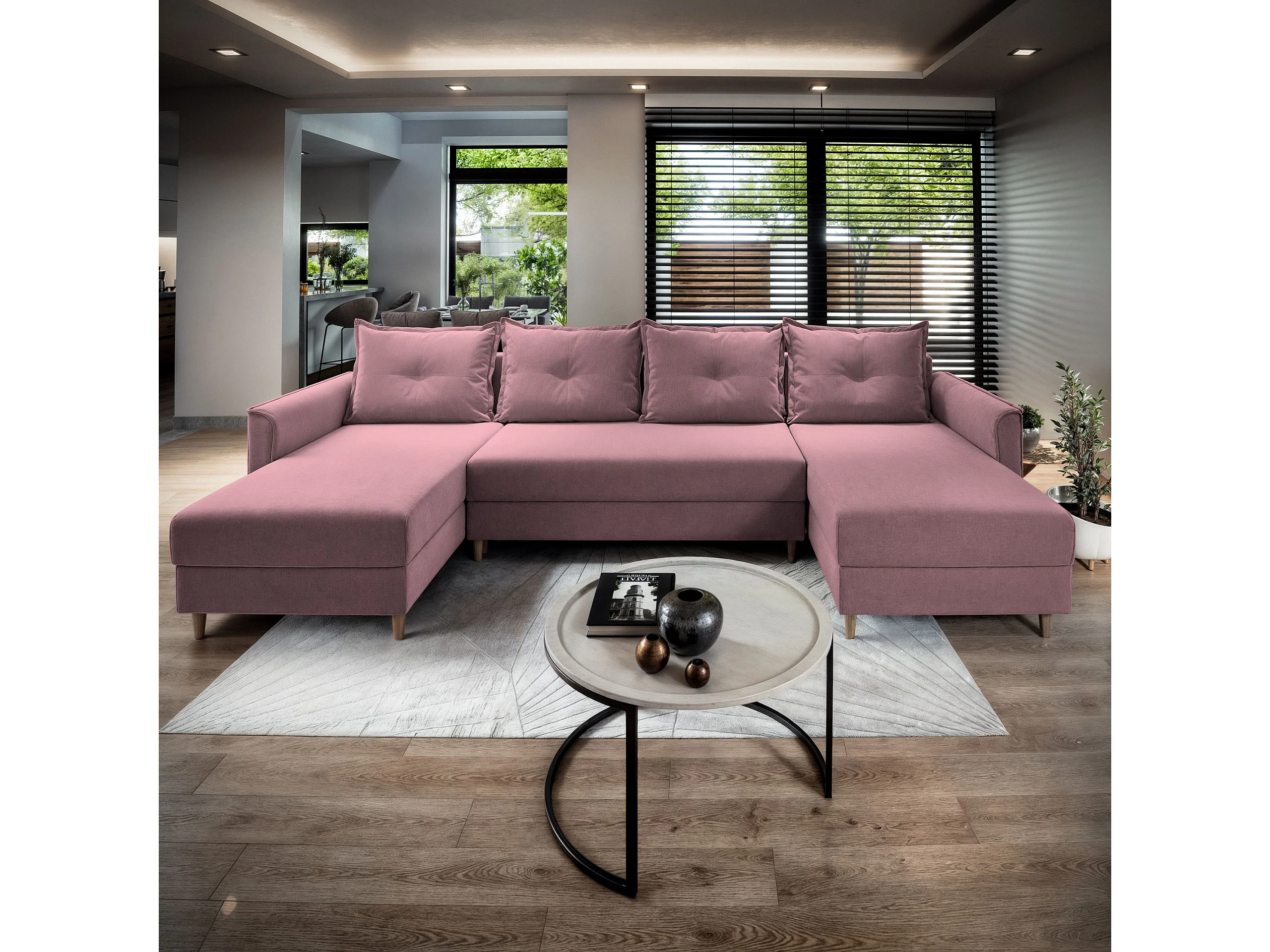 Canapé d'angle VERNI Rose poudré en peluche avec fonction de couchage