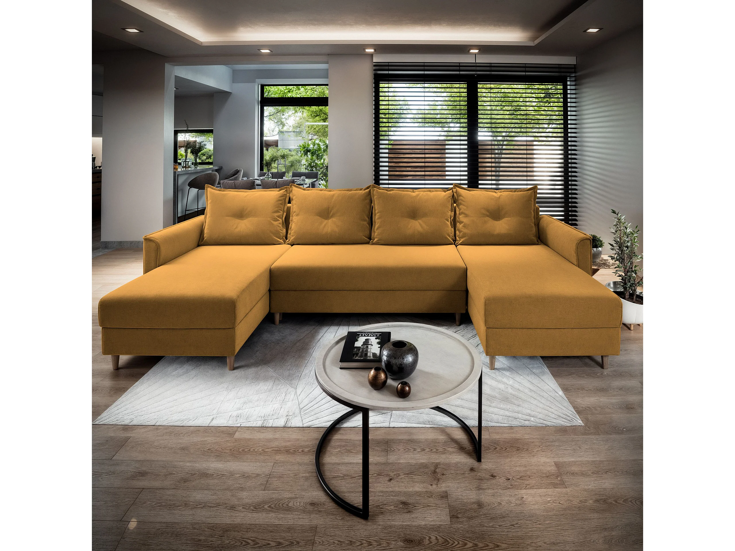 Canapé d'angle VERNI Jaune en peluche avec fonction de couchage