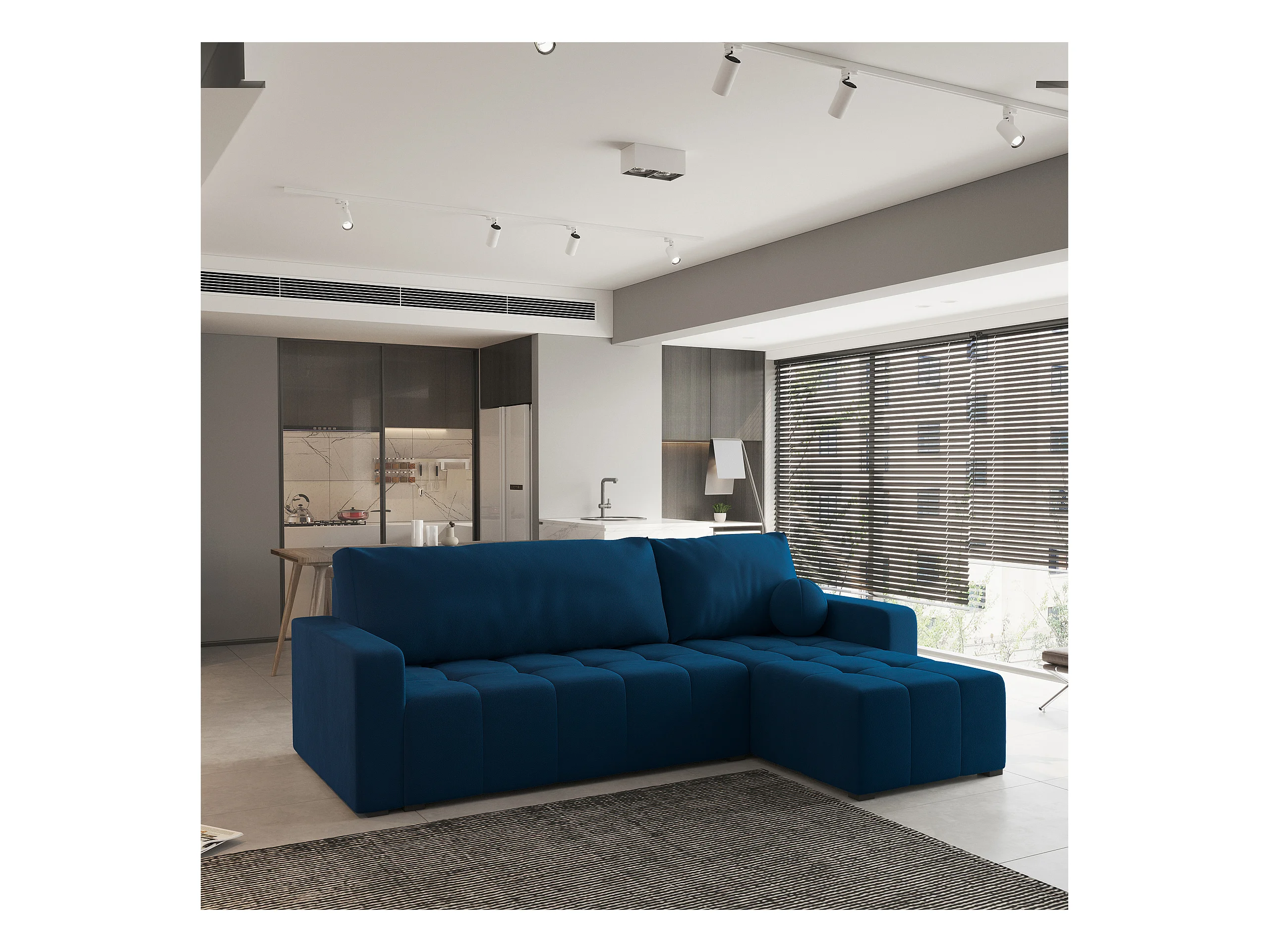 Canapé d'angle VOLIRA Bleu en peluche avec fonction de couchage