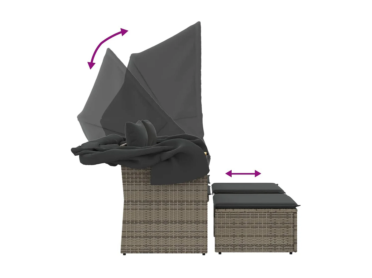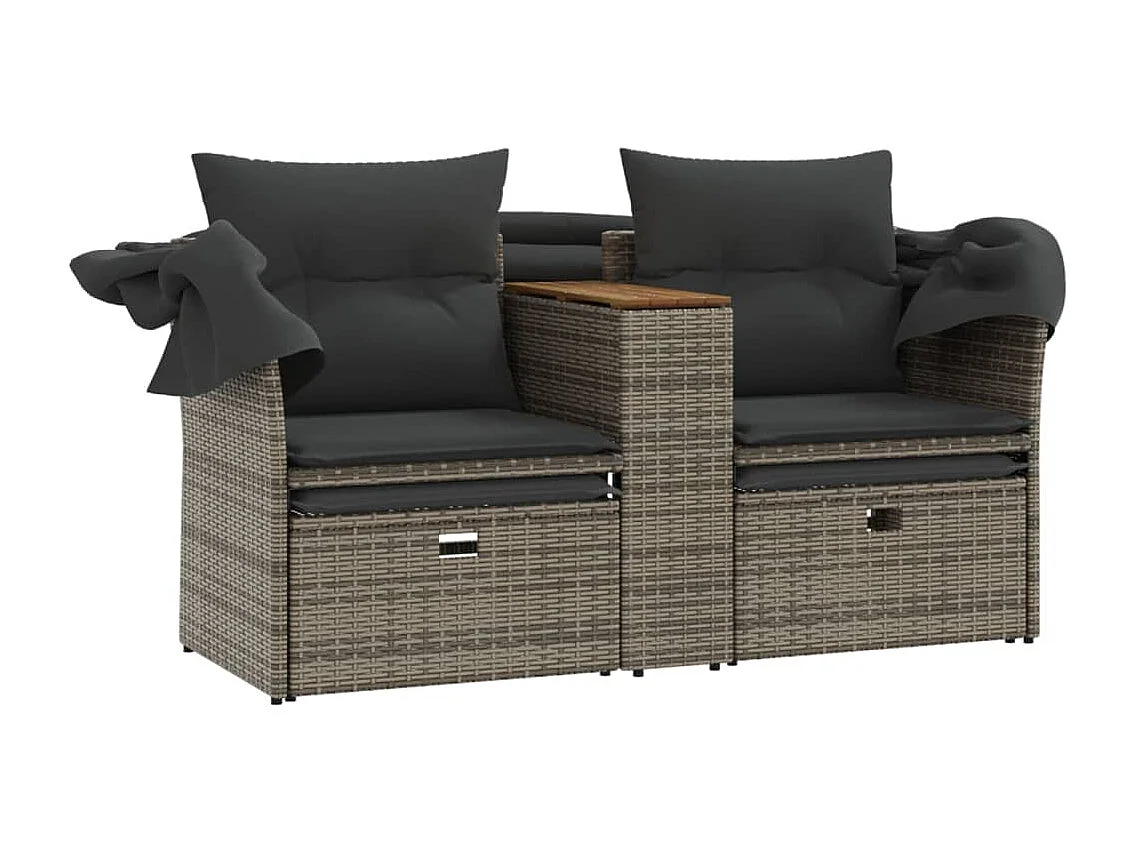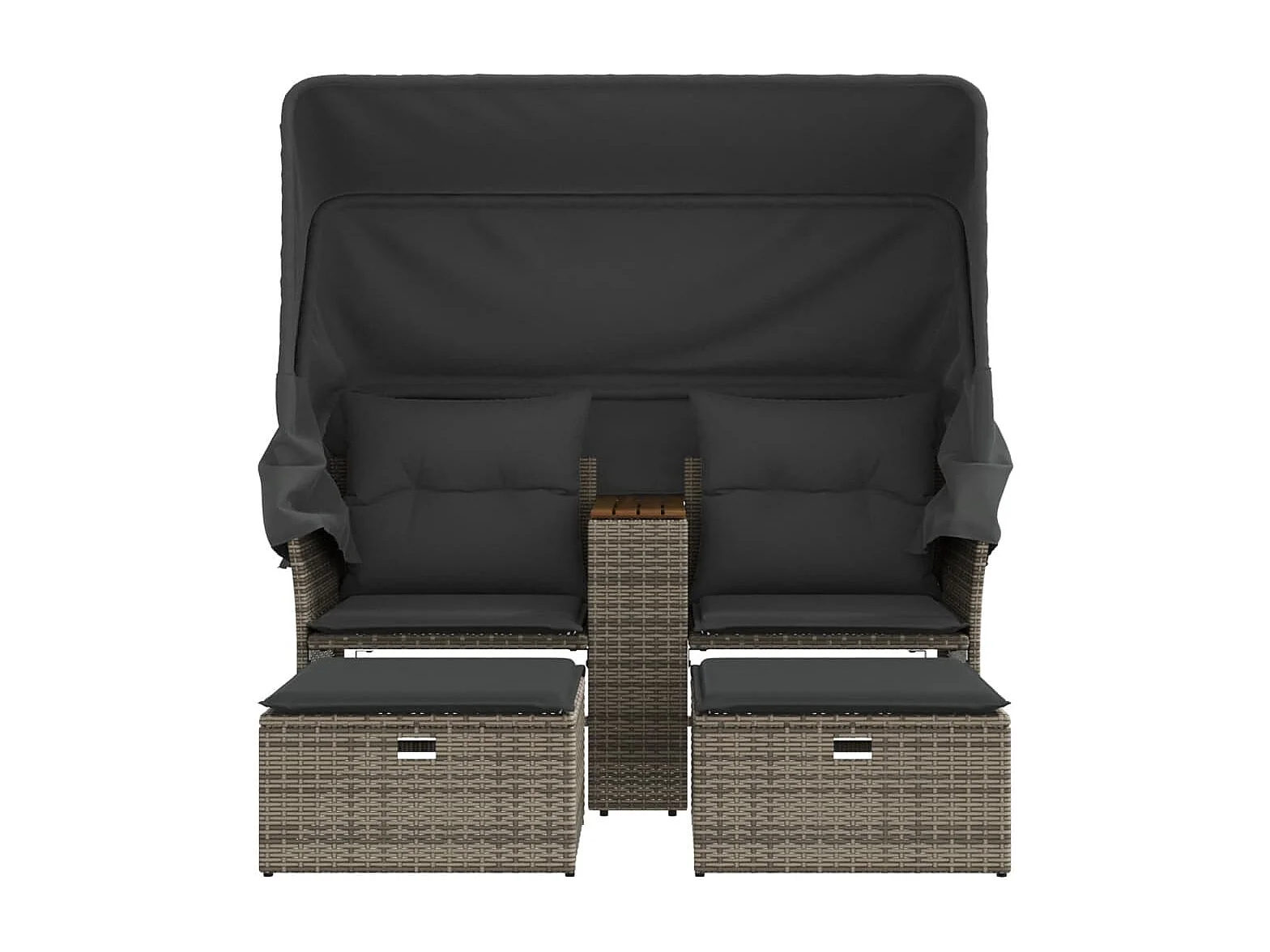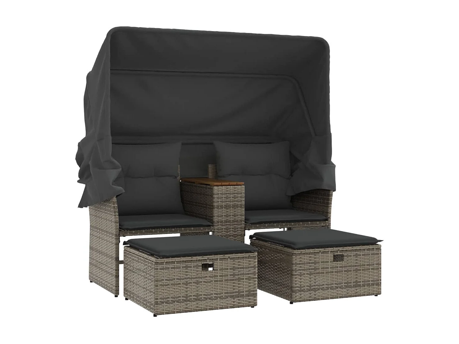 Canapé de jardin 2 places avec auvent et tabourets gris rotin