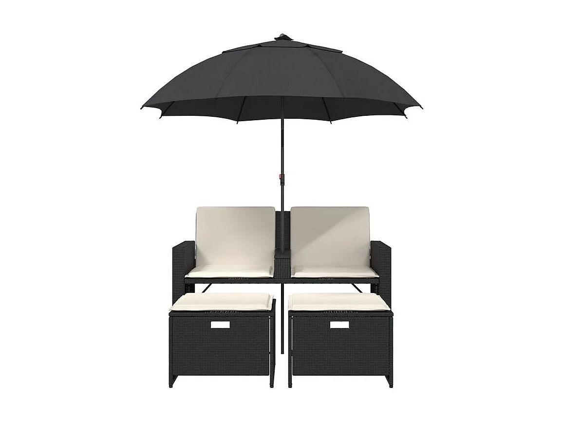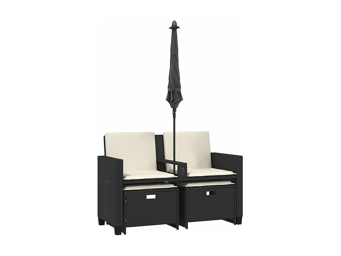Canapé de jardin 2 places avec parasol et tabourets noir rotin