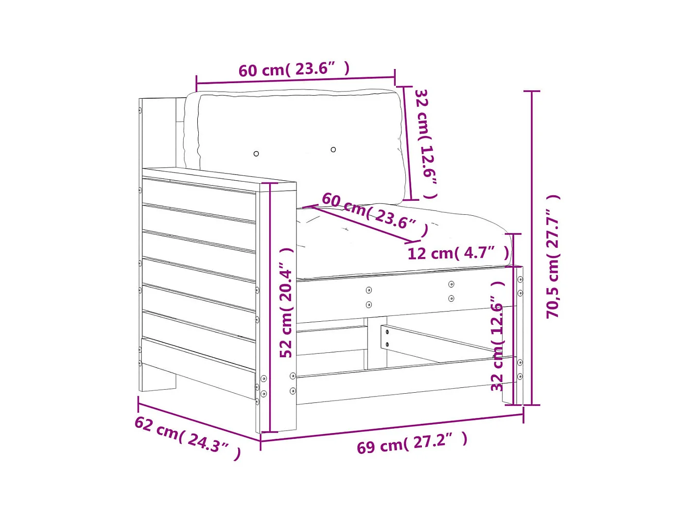 Canapé de jardin accoudoir 69x62x70,5 cm bois massif de pin