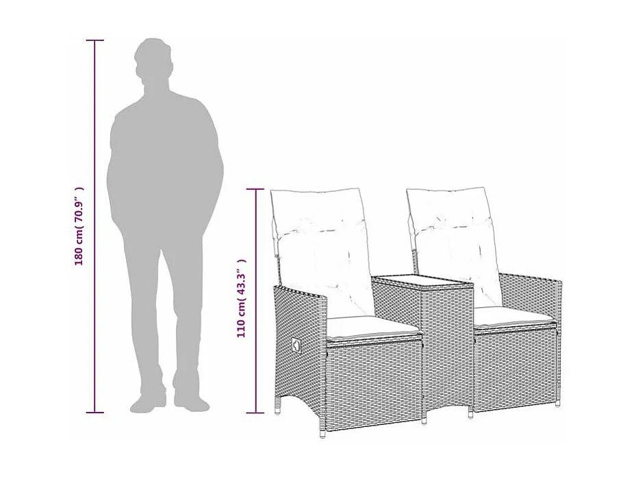 Canapé de jardin inclinable 2 places avec table noir poly rotin