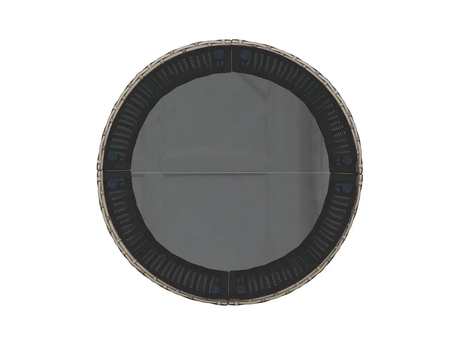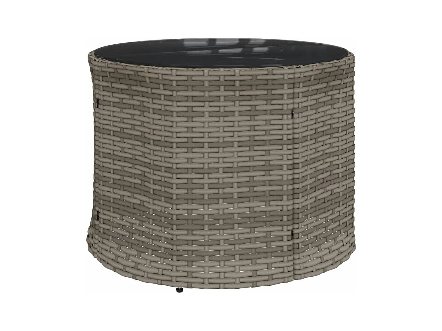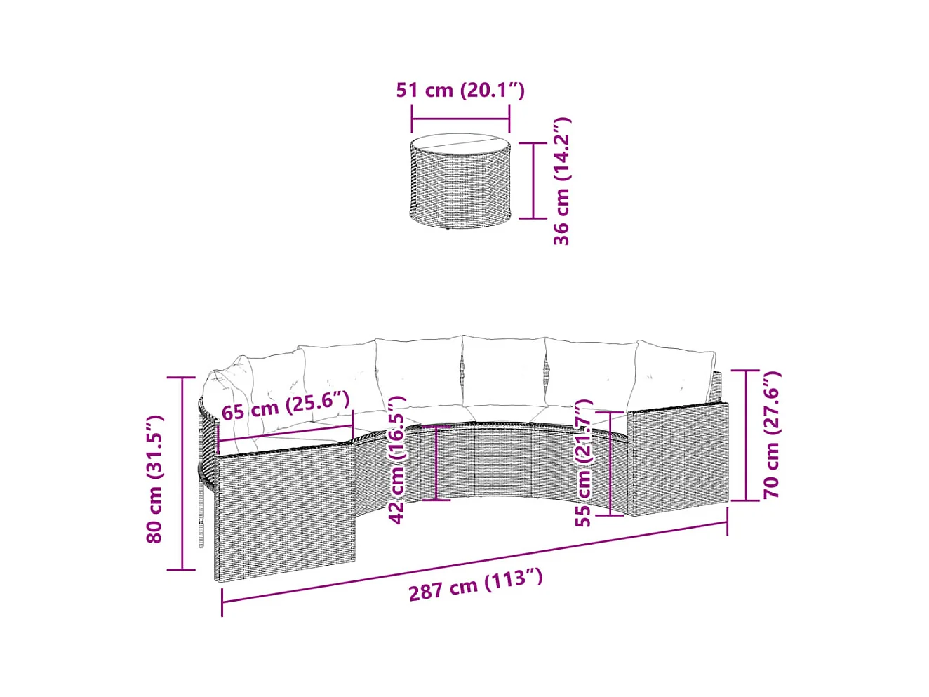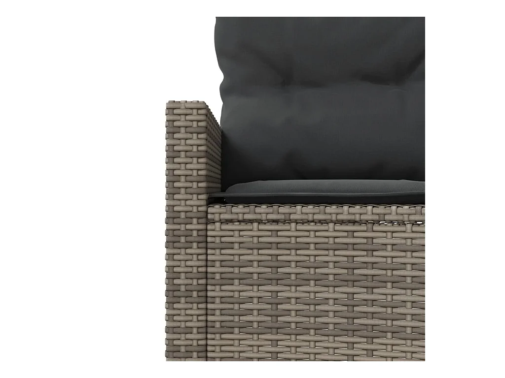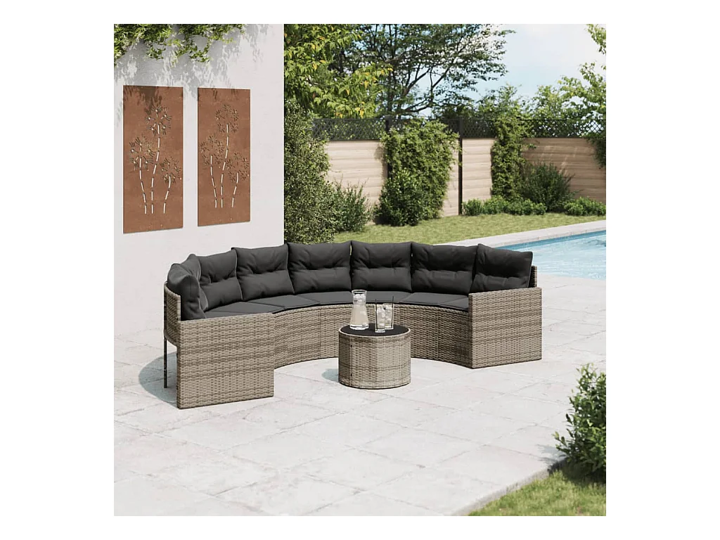 Canapé de jardin table coussins demi-rond gris résine tressée