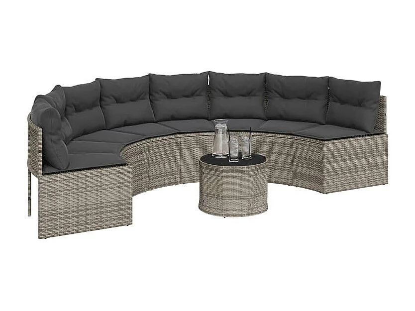 Canapé de jardin table coussins demi-rond gris résine tressée