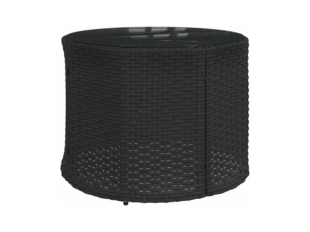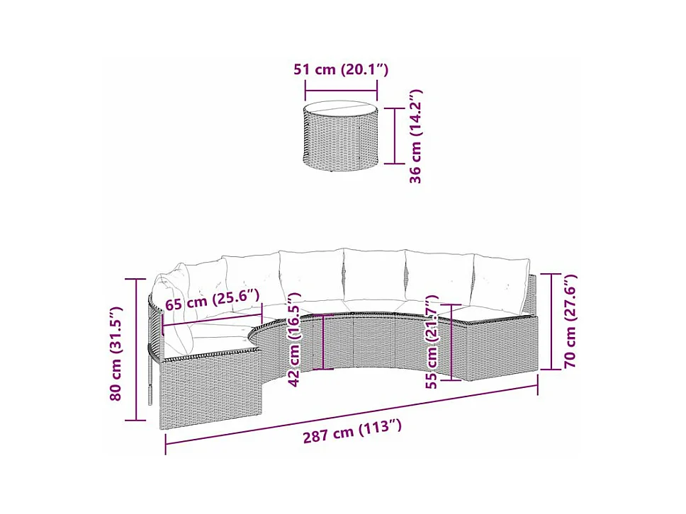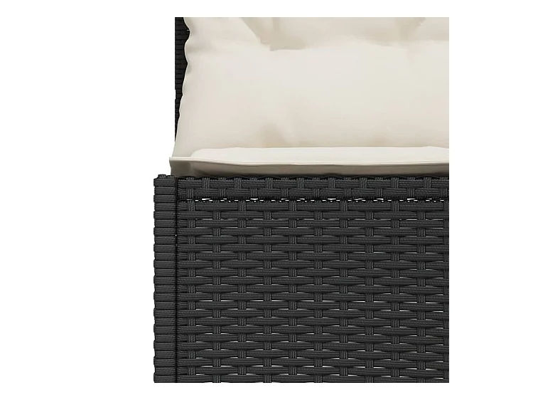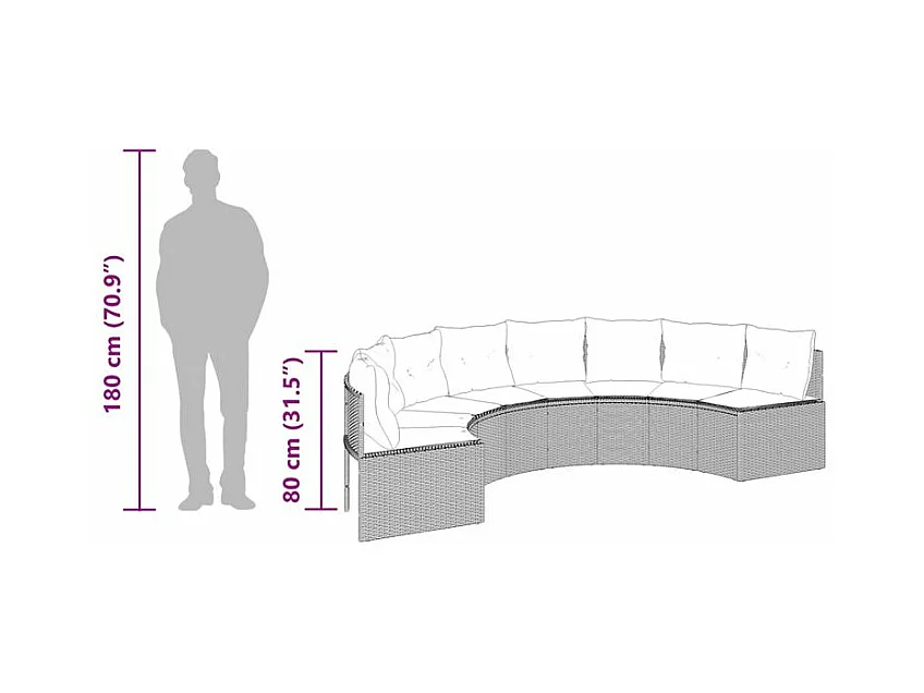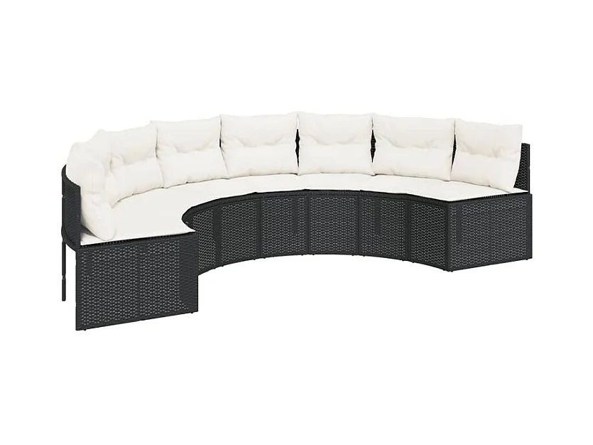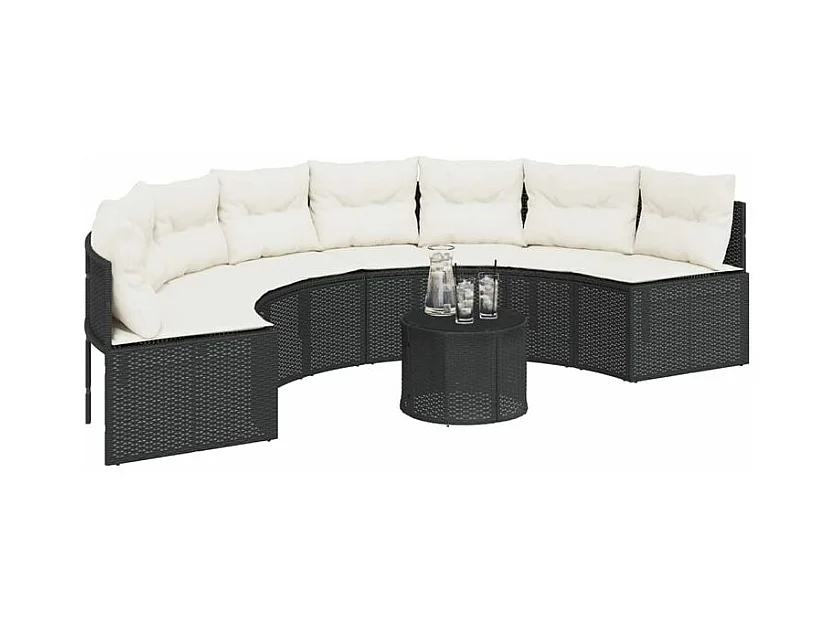 Canapé de jardin table coussins demi-rond noir résine tressée
