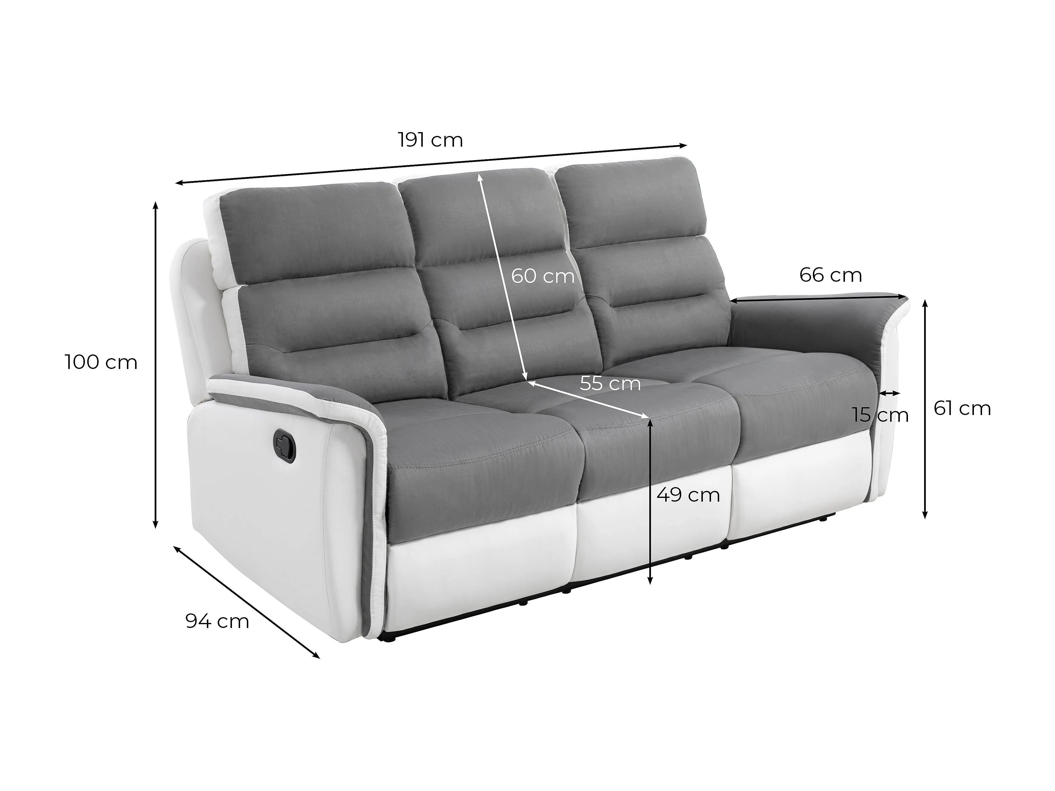 Canapé de Relaxation 3 places en Microfibre et Simili Léon - Blanc et gris - L191 x 94 x 100cm - Loungitude
