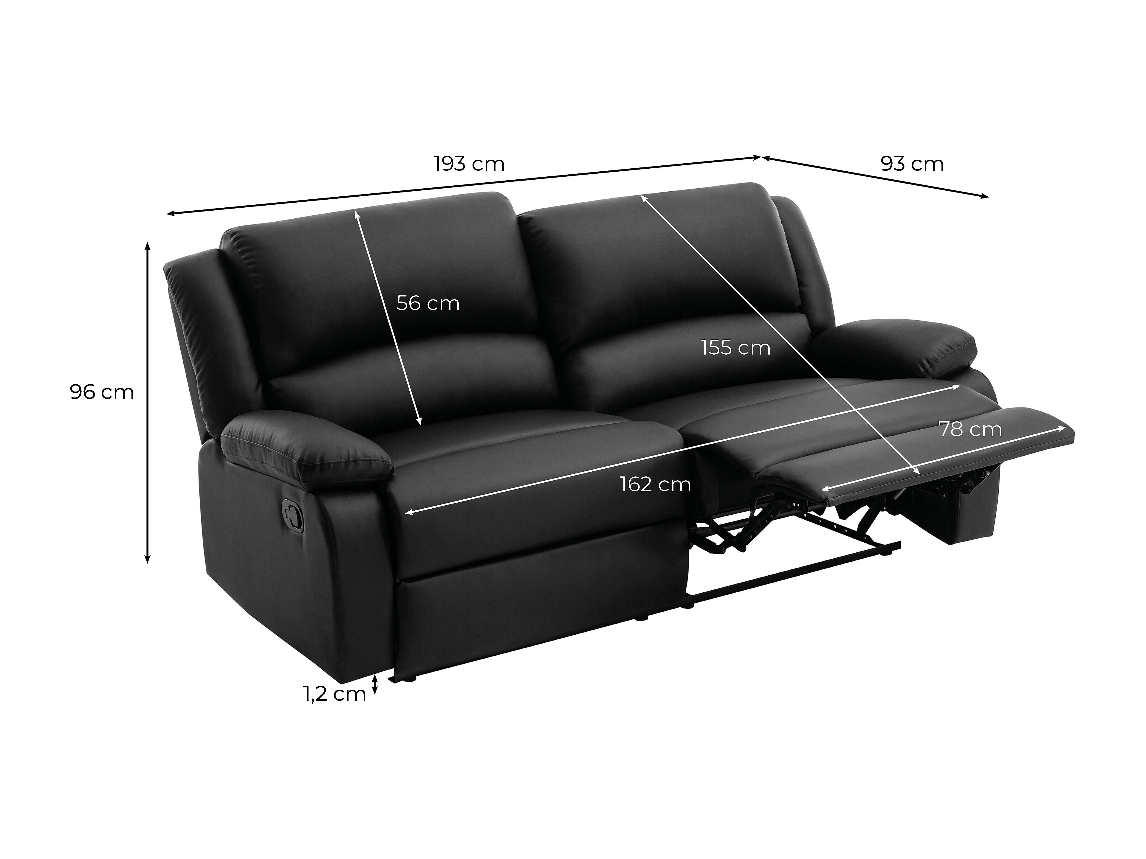 Canapé relax manuel 3 places avec 2 assises XXL Léo en simili - Noir - L193 x P93 x H96cm - Loungitude