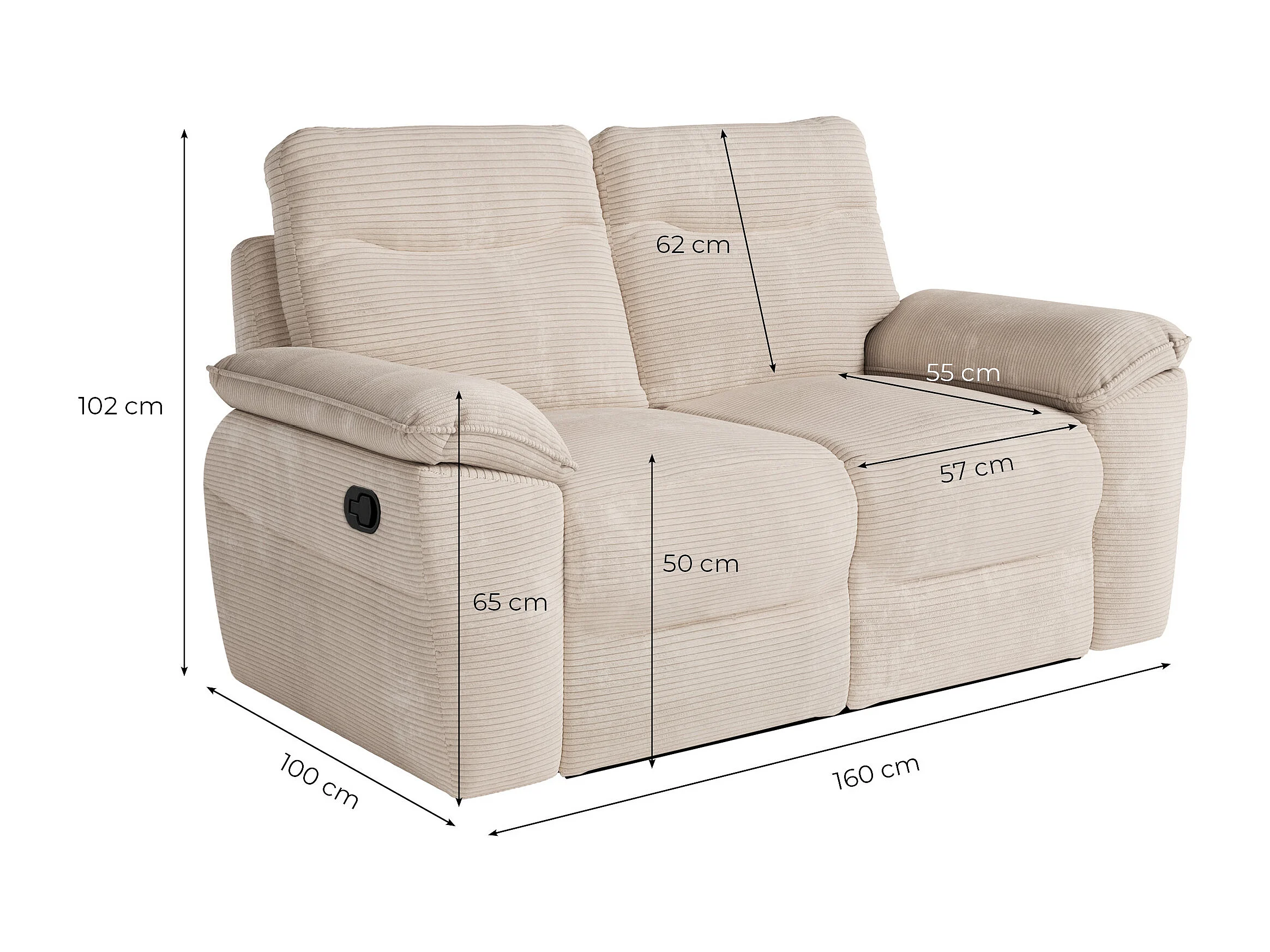 Canapé de relaxation manuel Ross 2 places en velours côtelé - Taupe - L160 x P100 x H102cm - Loungitude