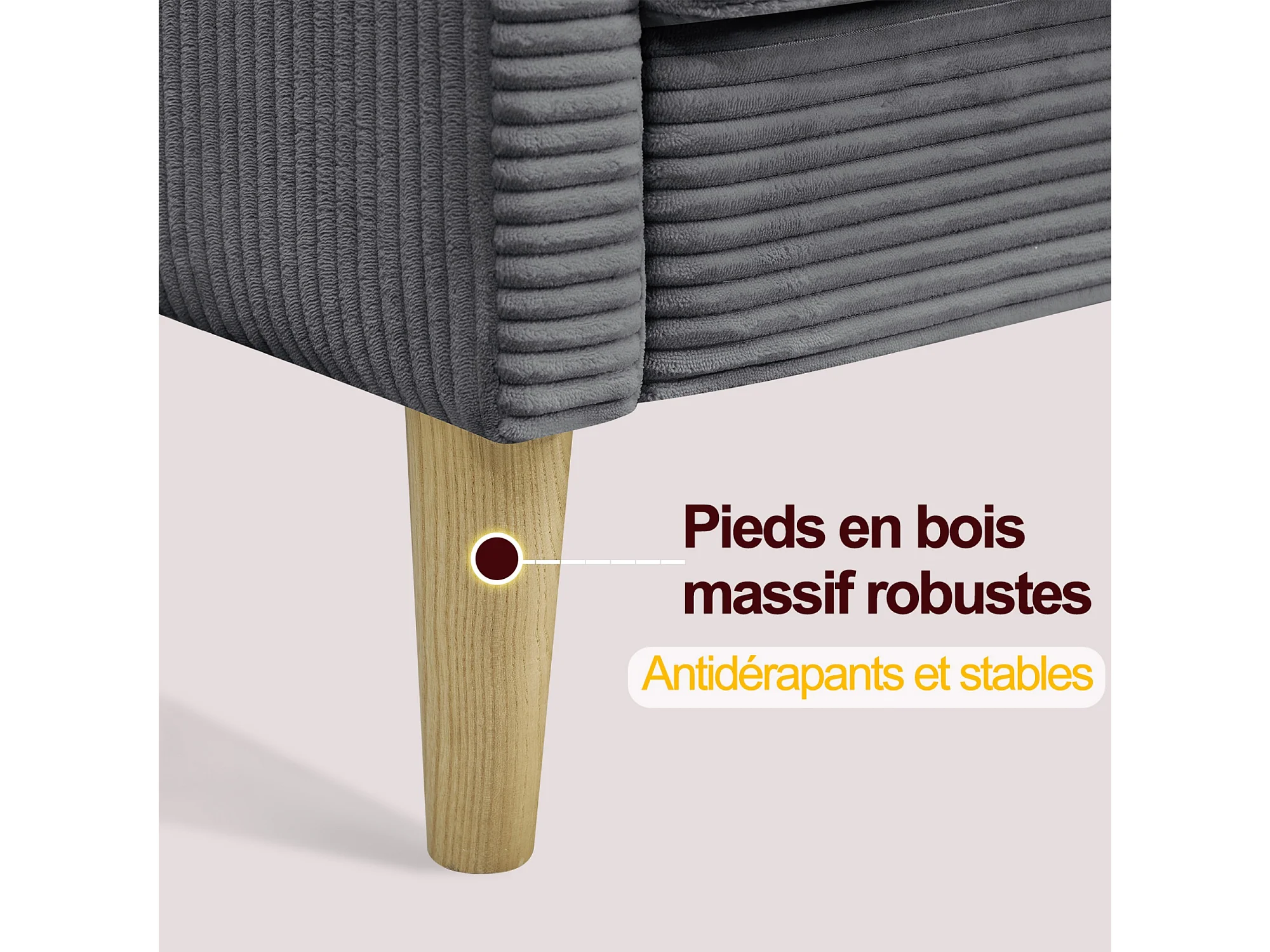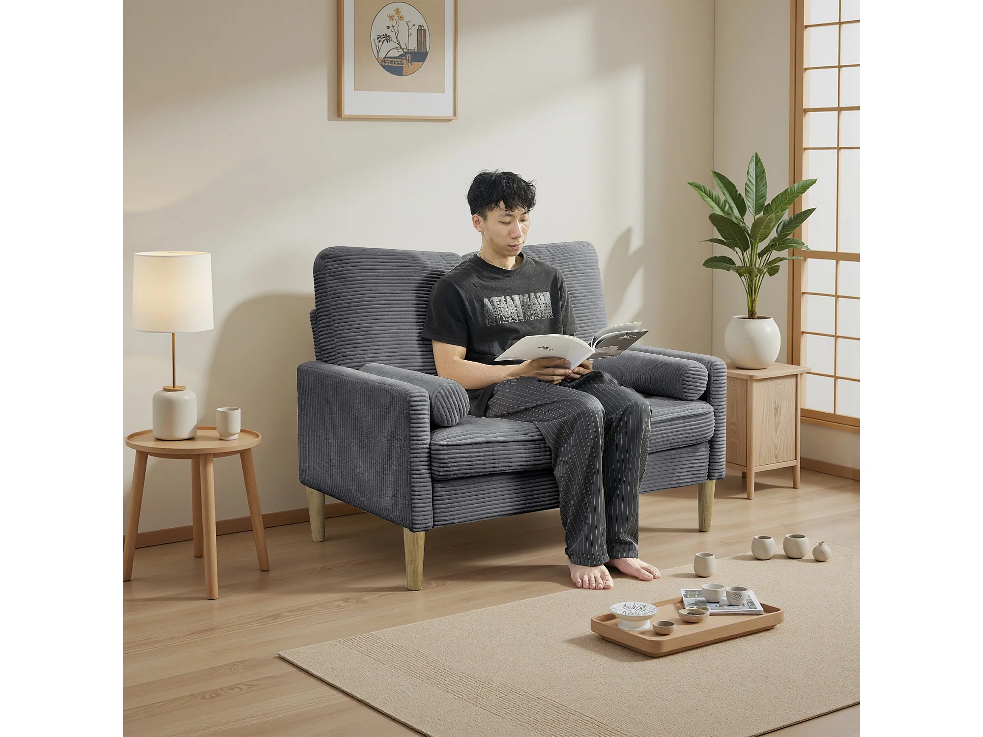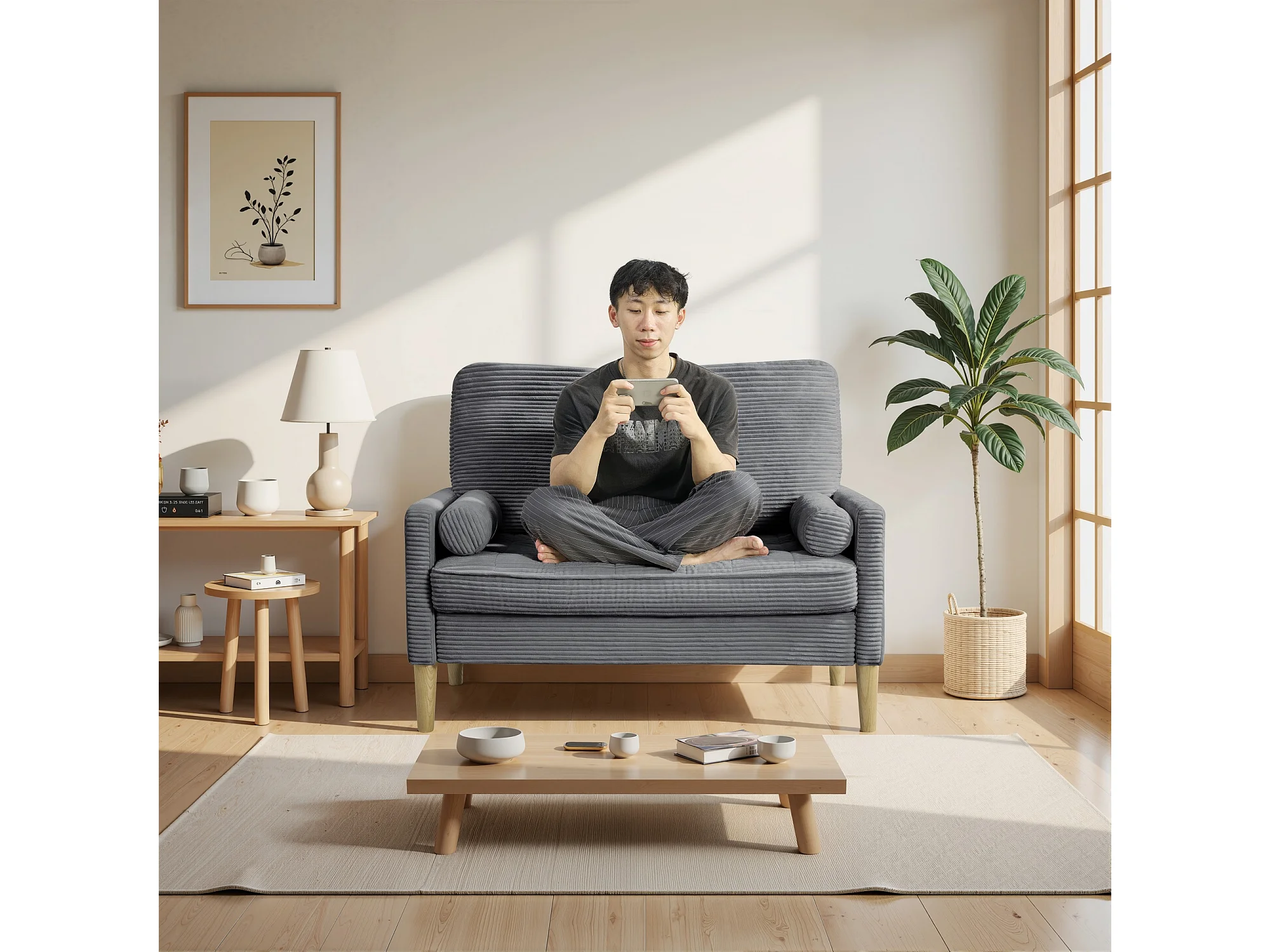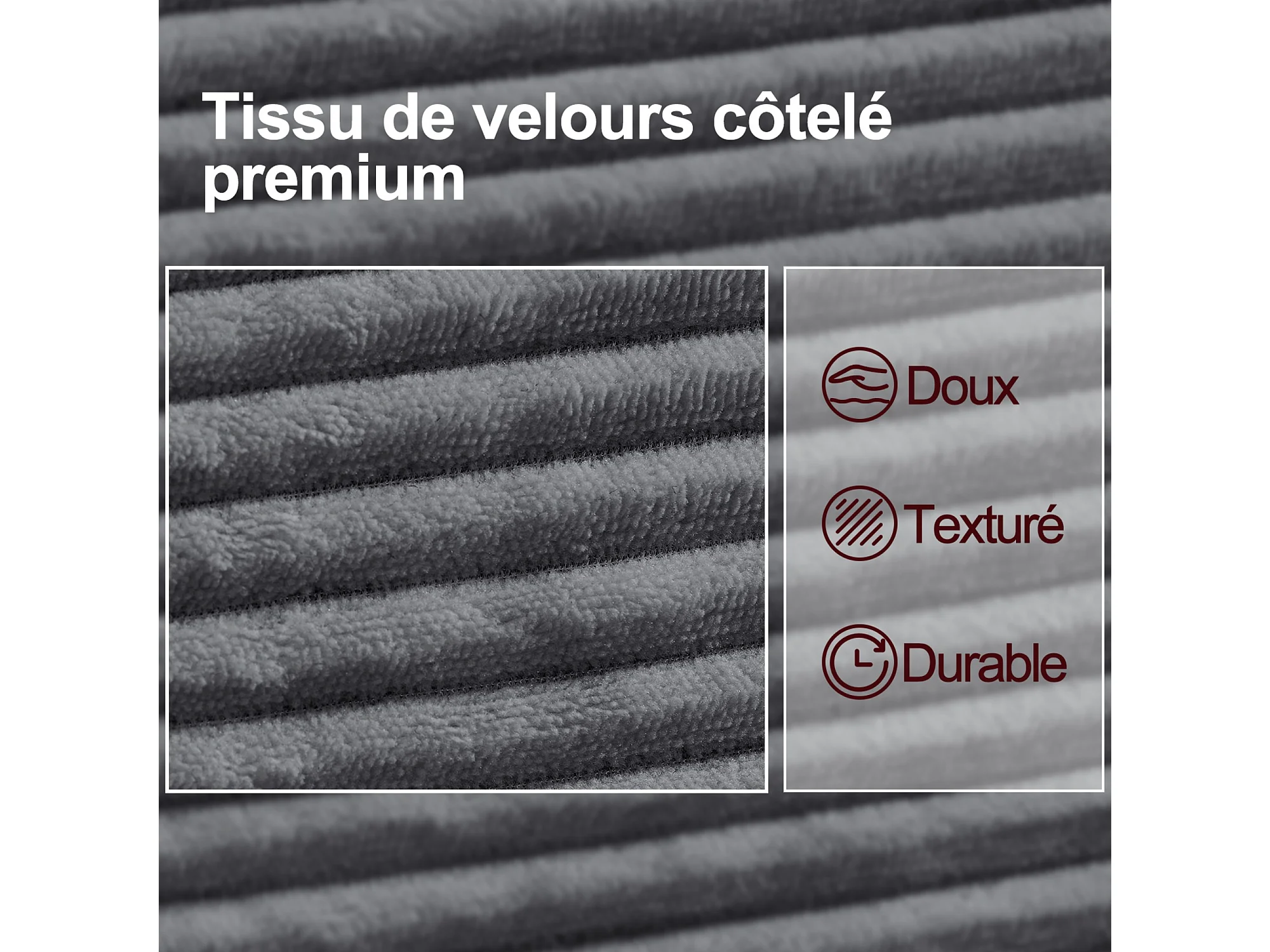 Canapé deux places en velours côtelé, style nordique, canapé rembourré avec coussins moelleux, gris