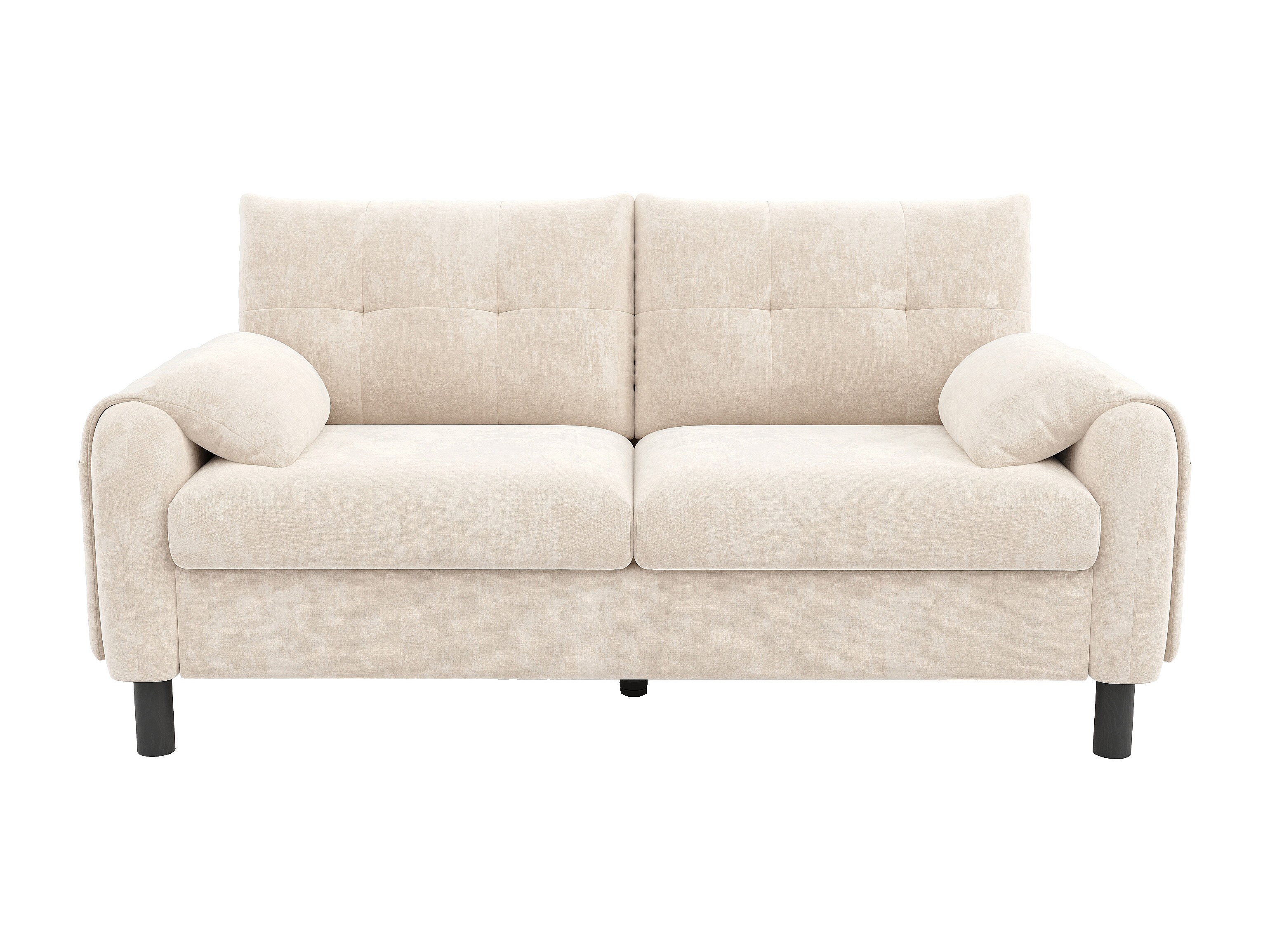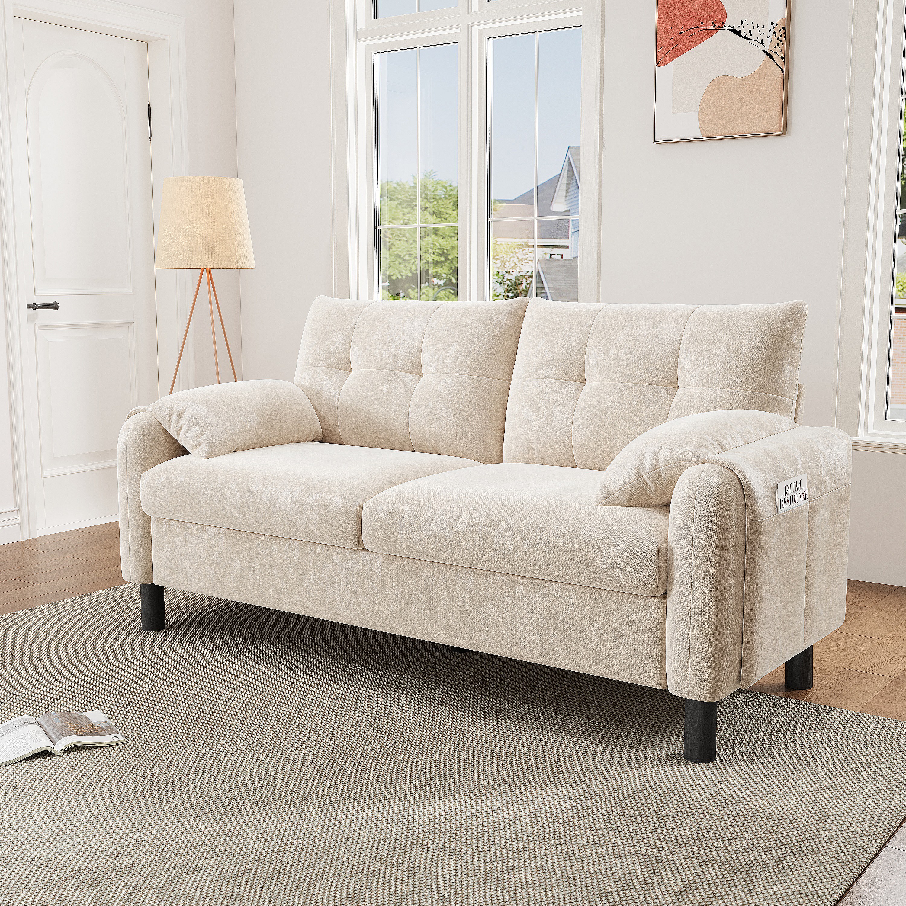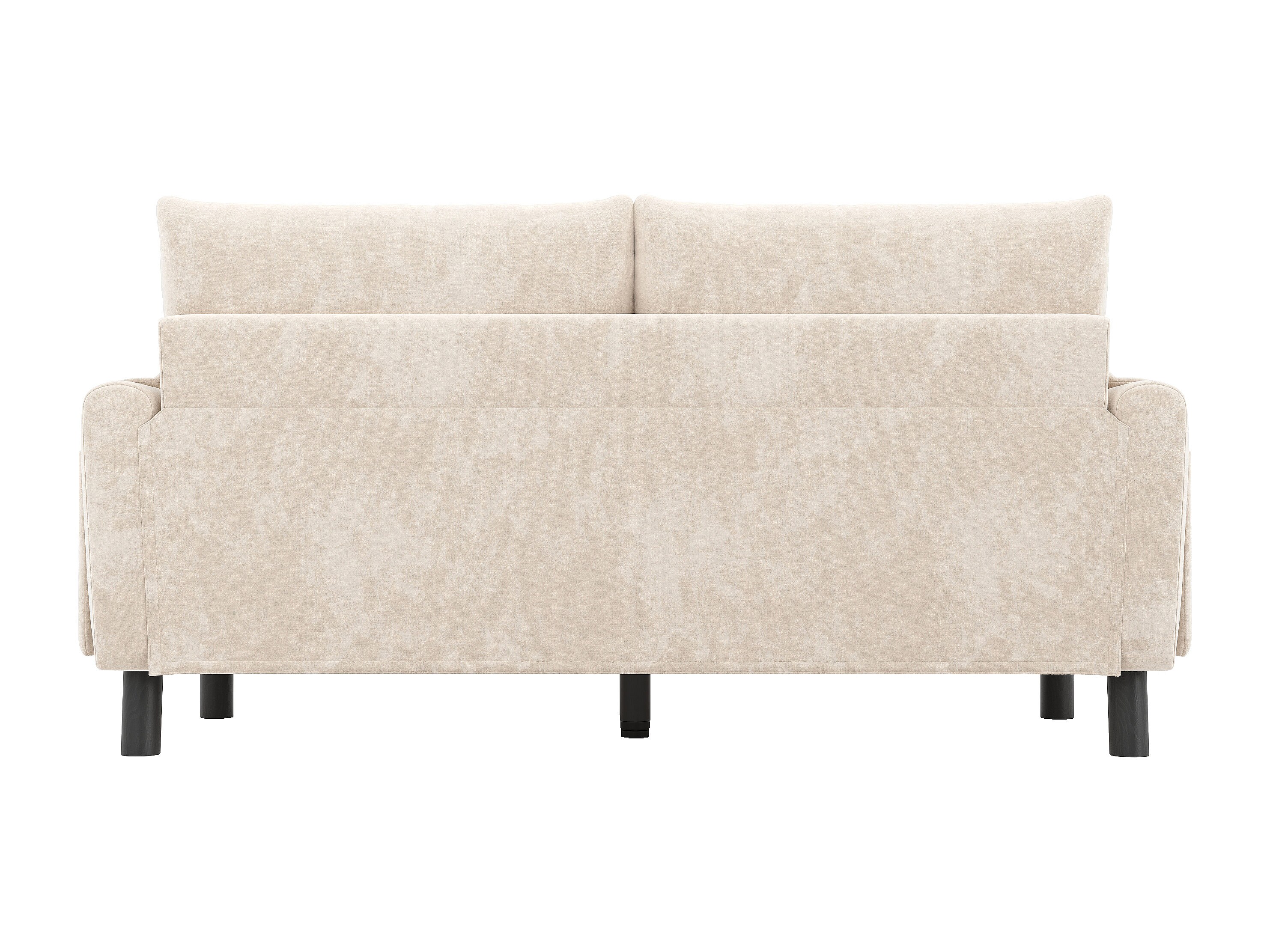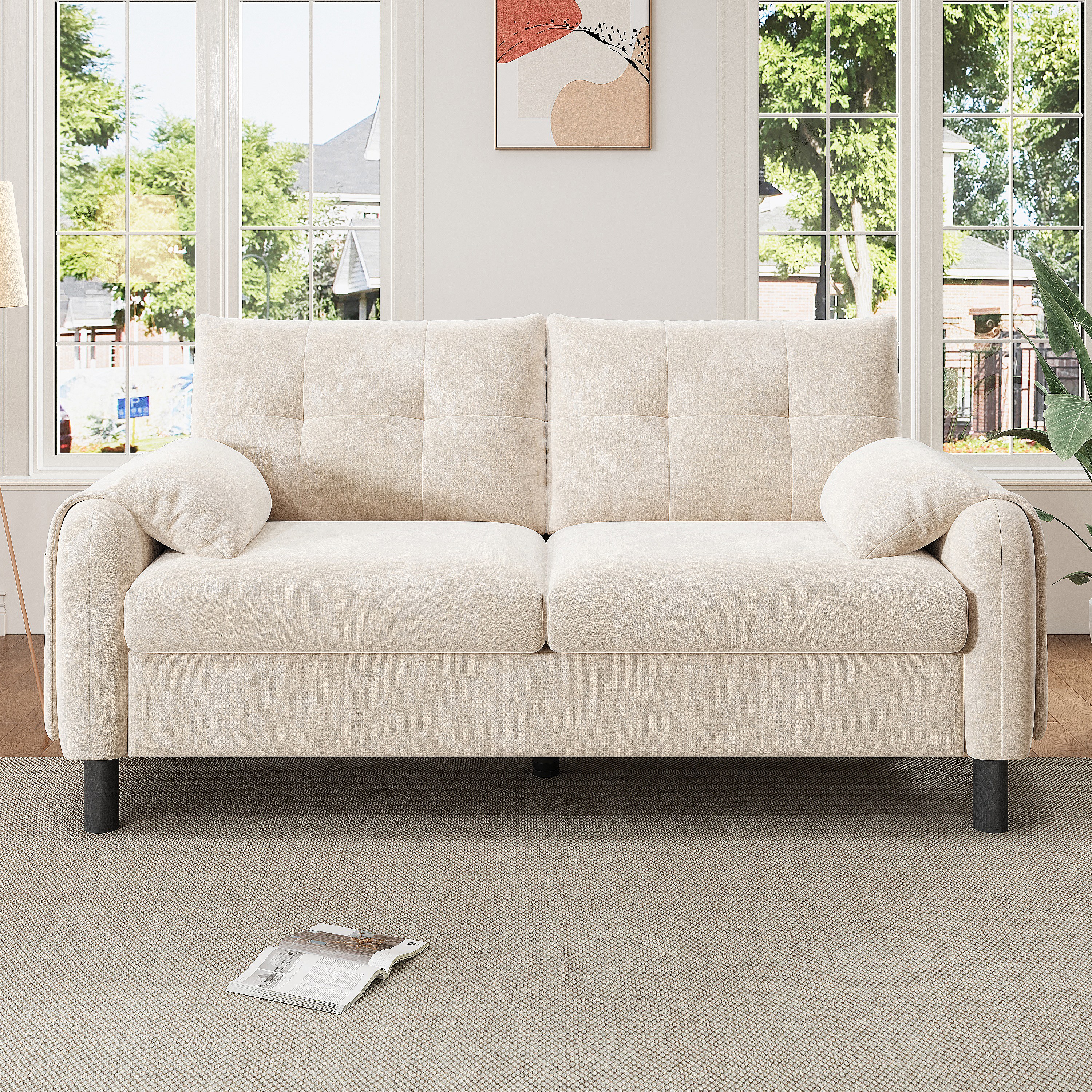 Canapé droit 2 places beige avec coussins et poches latérales, tissu chenille 158x80x88,5cm
