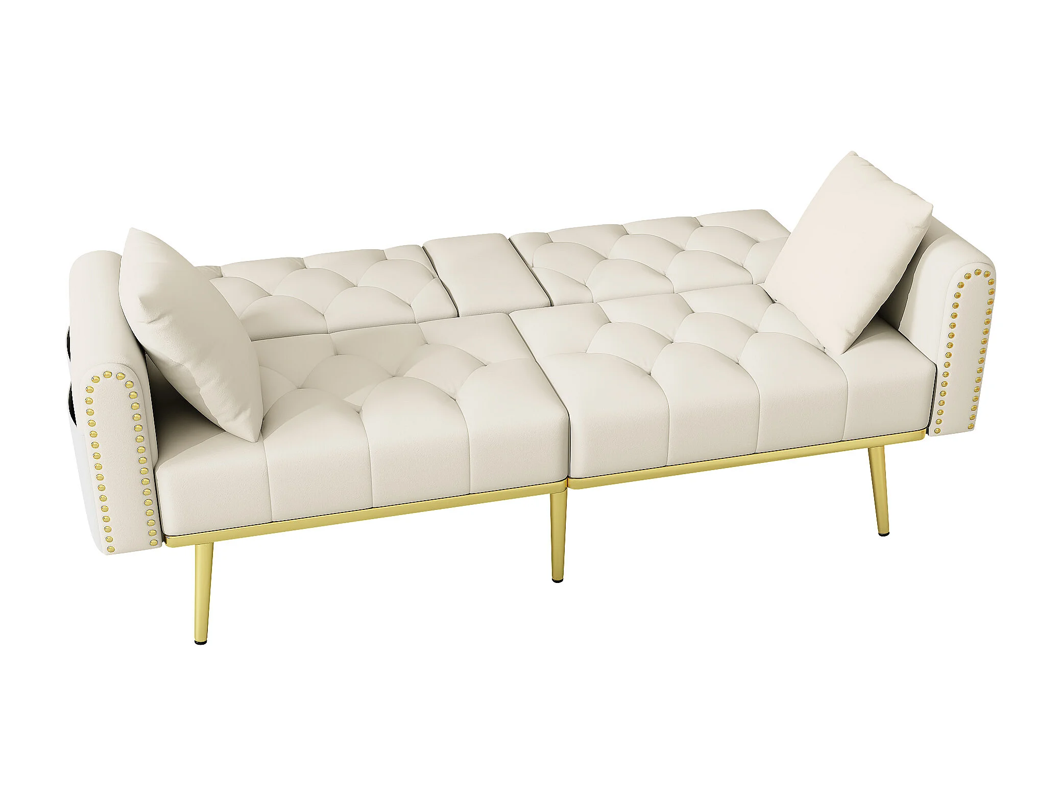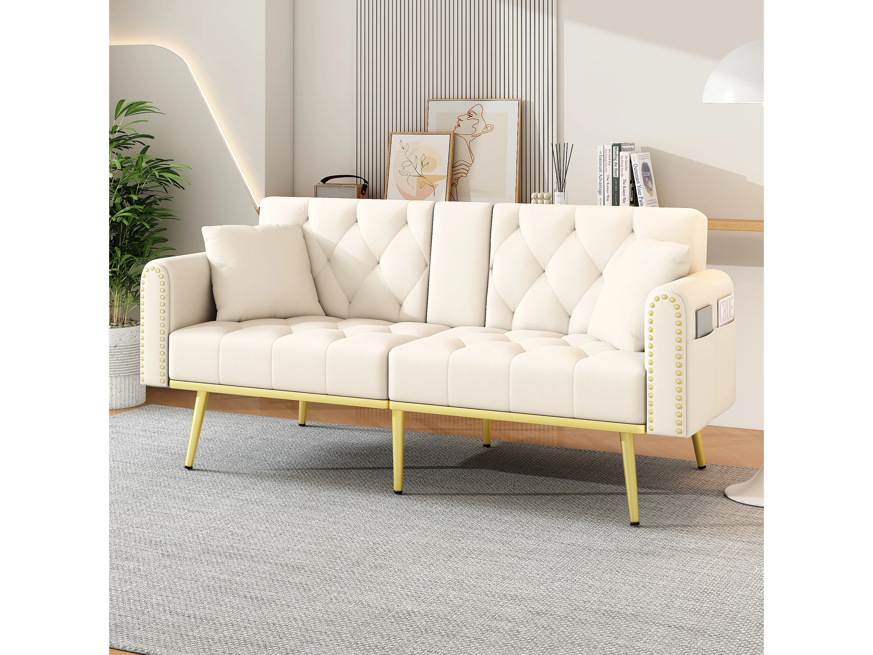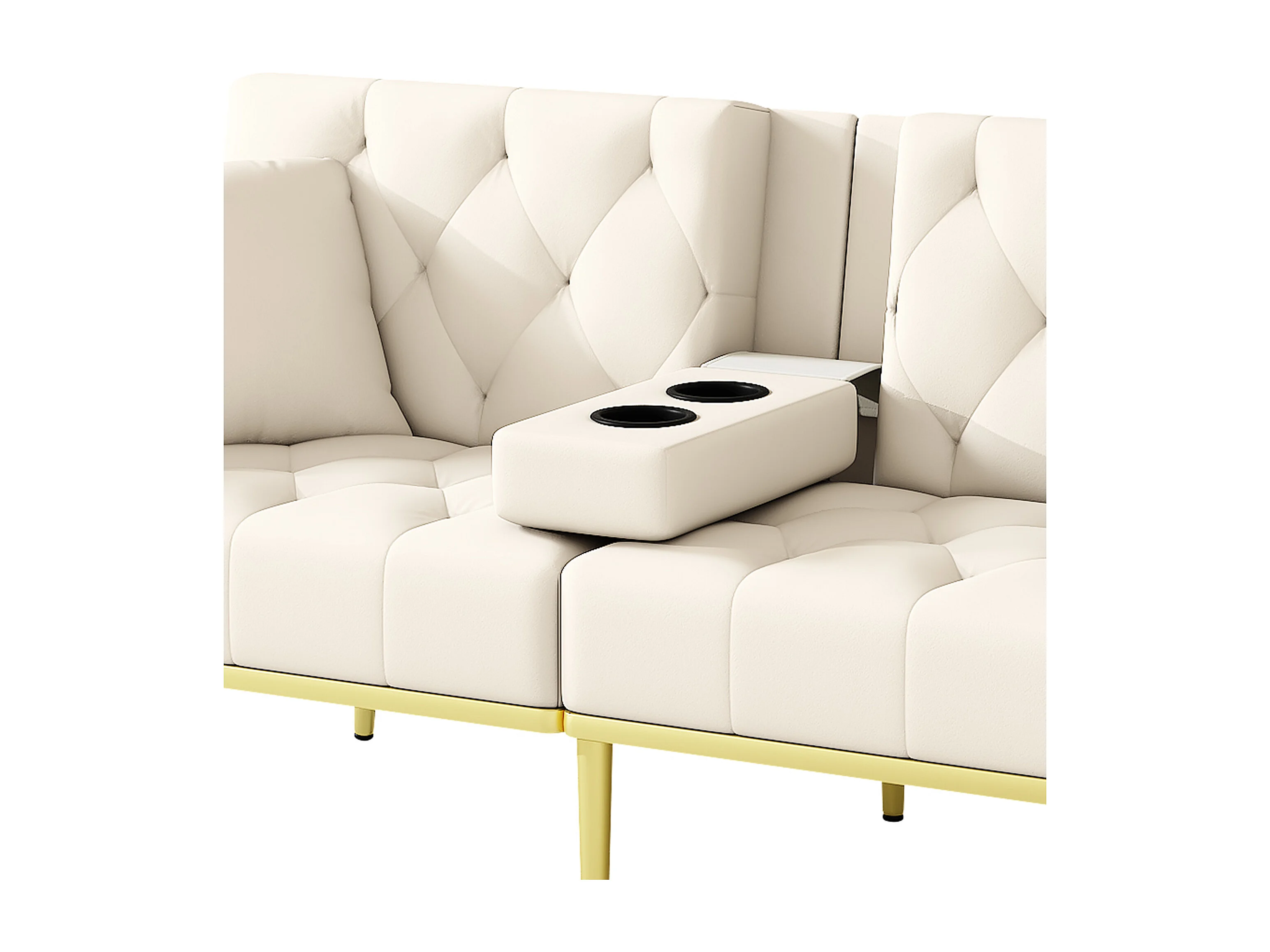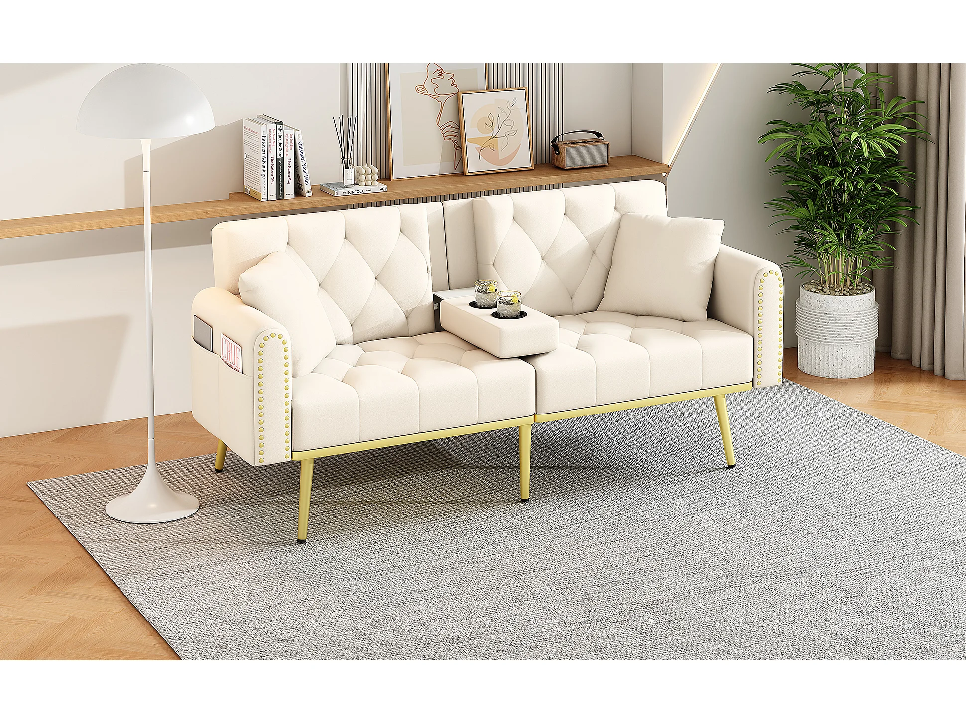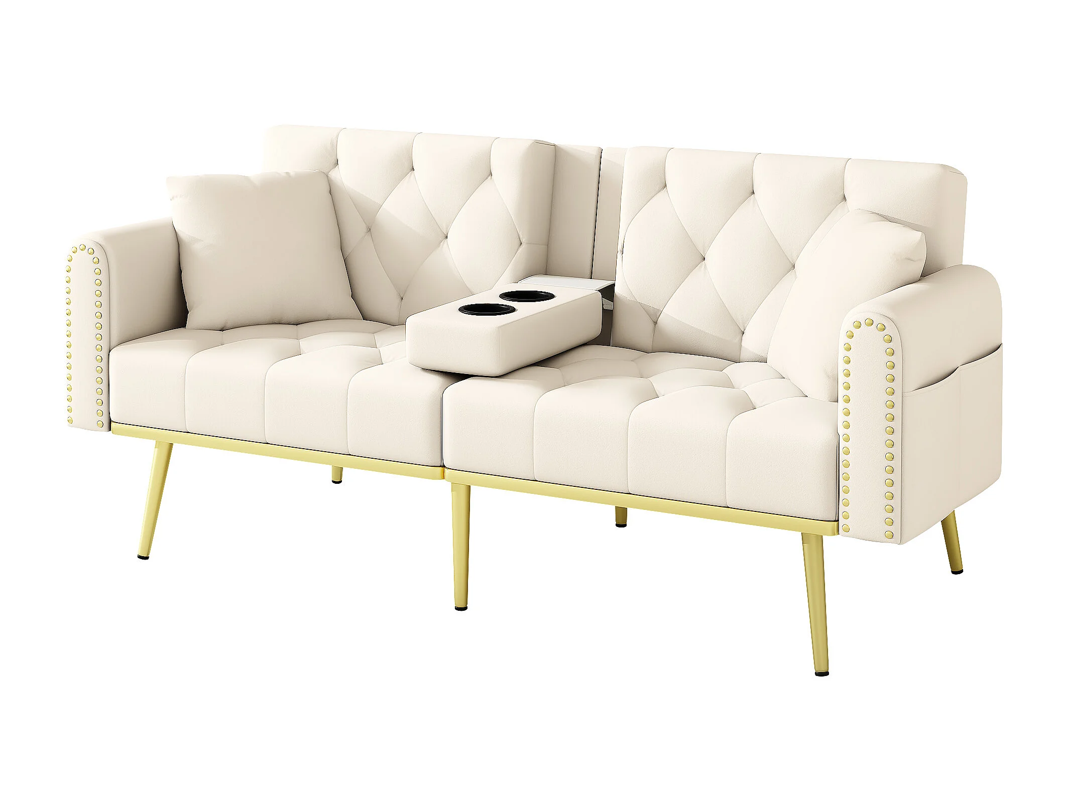 Canapé droit 2 places convertible - Porte-gobelet, 2 lombaire et poches latérales - Velours beige