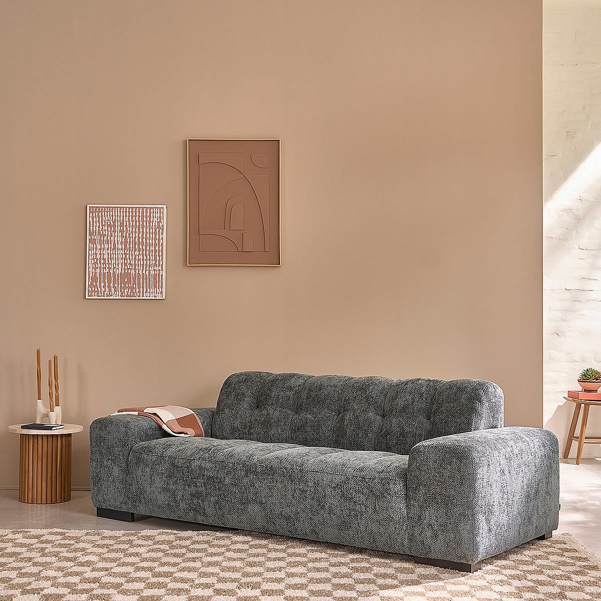 Canapé droit 3 places en velours tressé vert de gris