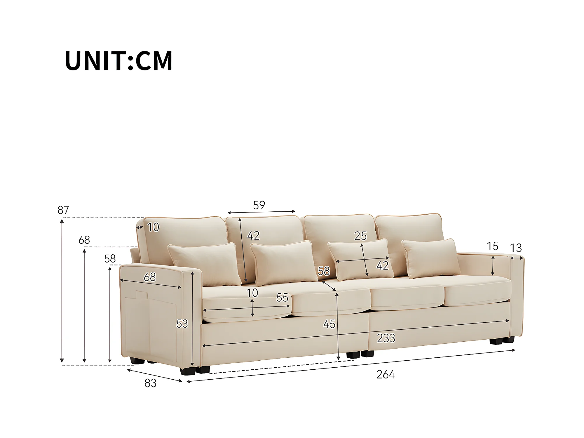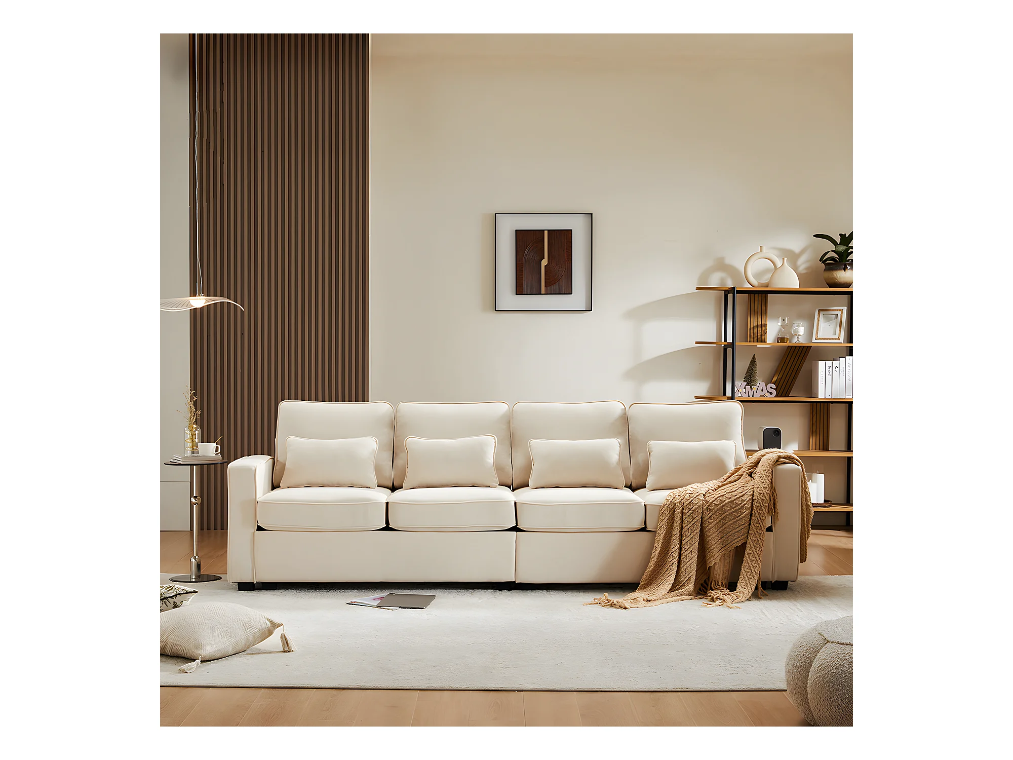 Canapé droit 4 places avec poches accoudoirs et 4 coussins pour le salon l'appartement le bureau Tissu de lin Beige