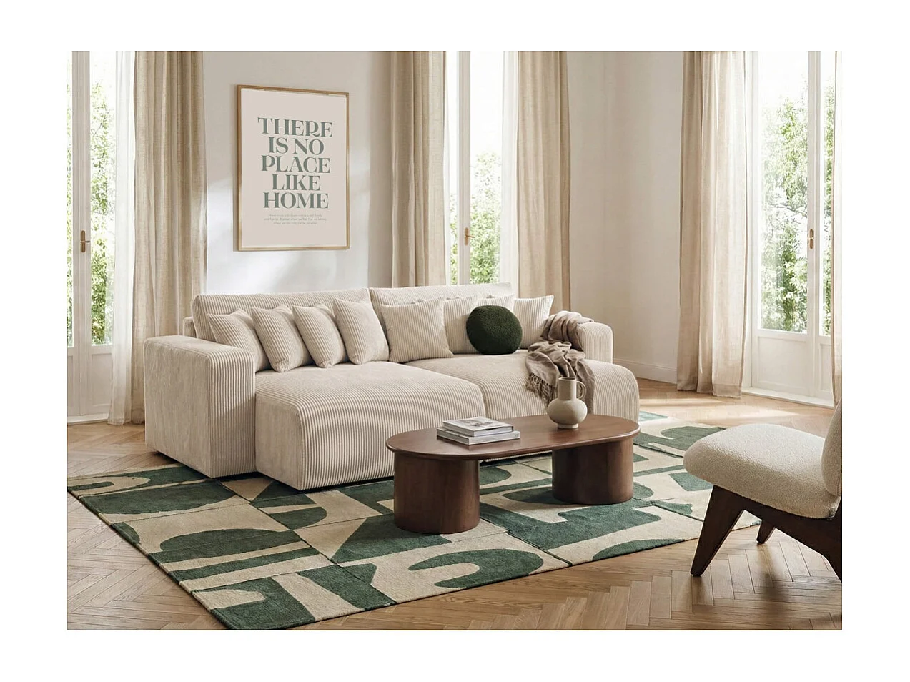 Canapé droit 4 places JADE double méridienne et assise profonde en velours côtelé - Beige