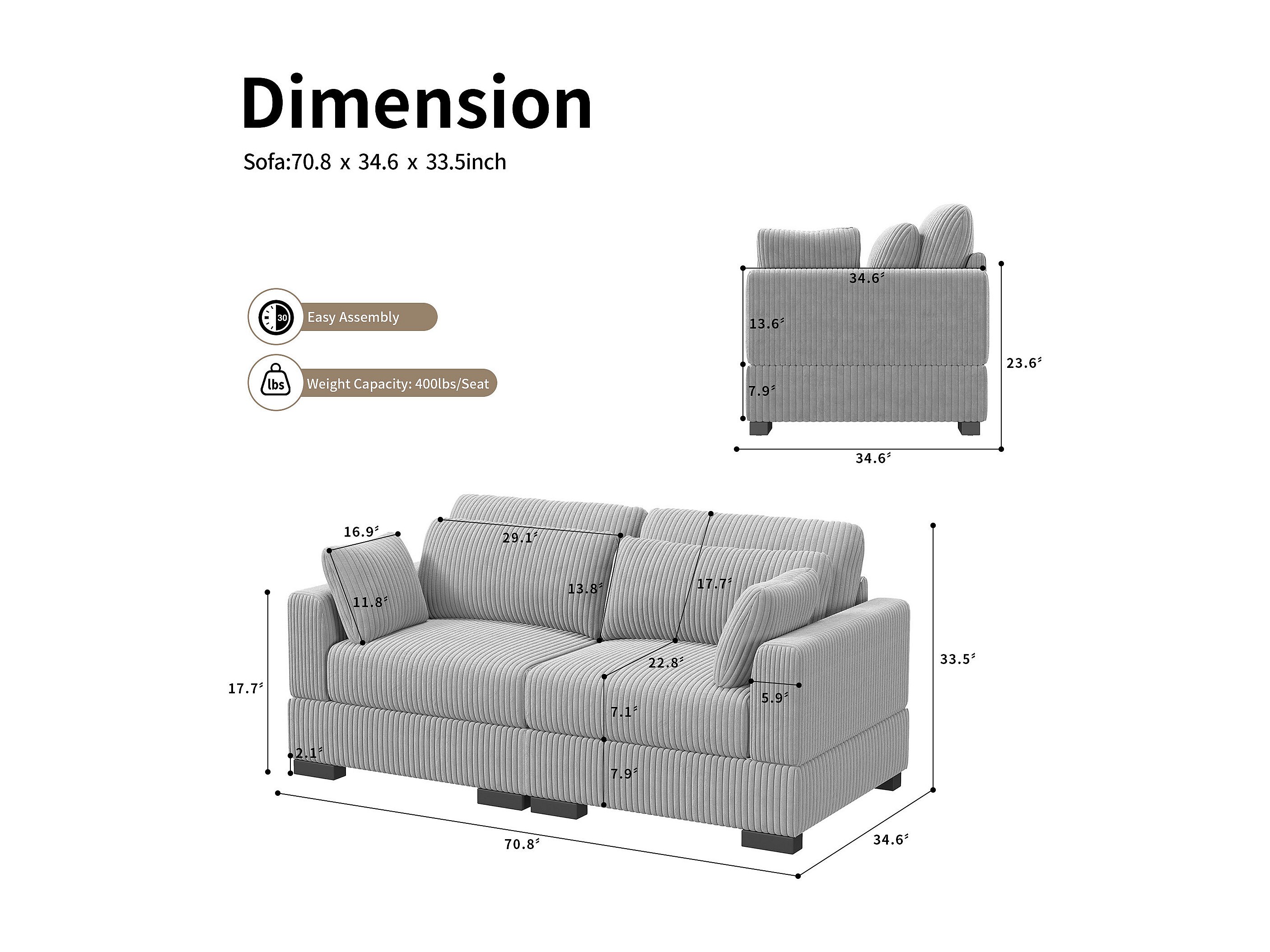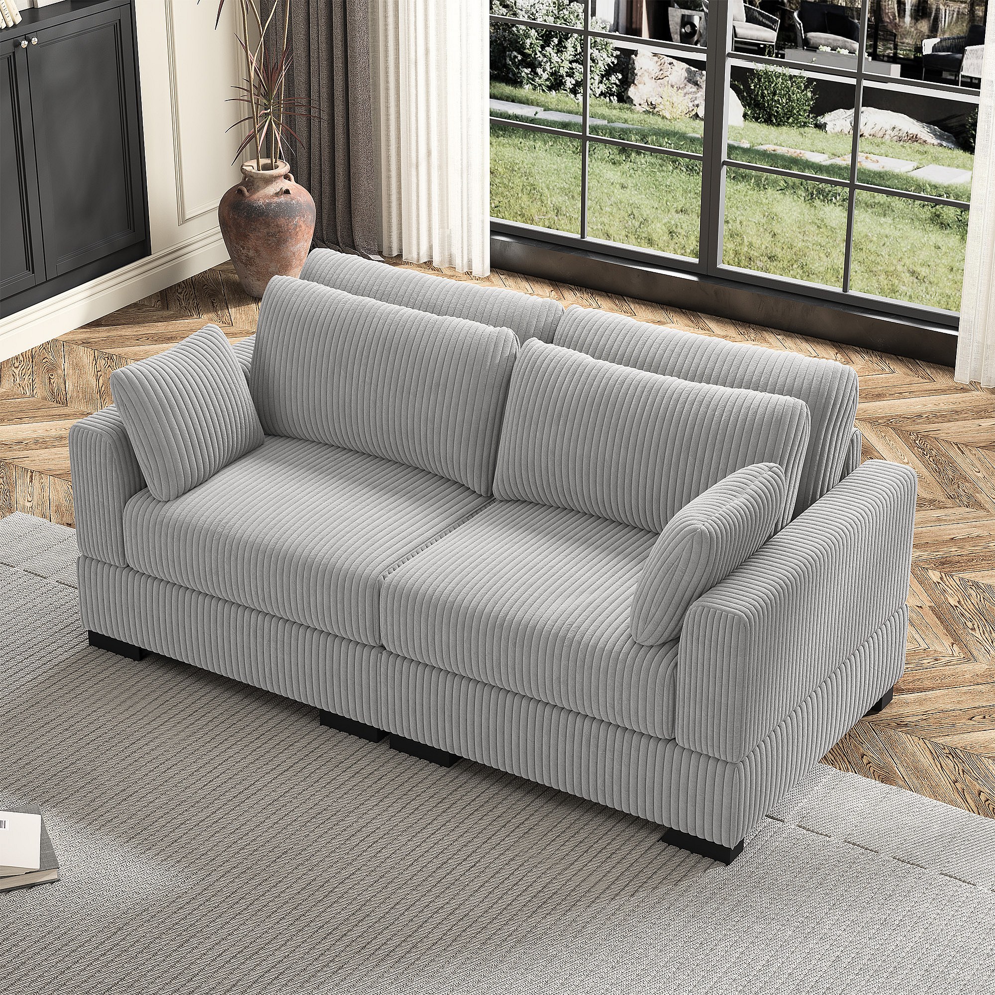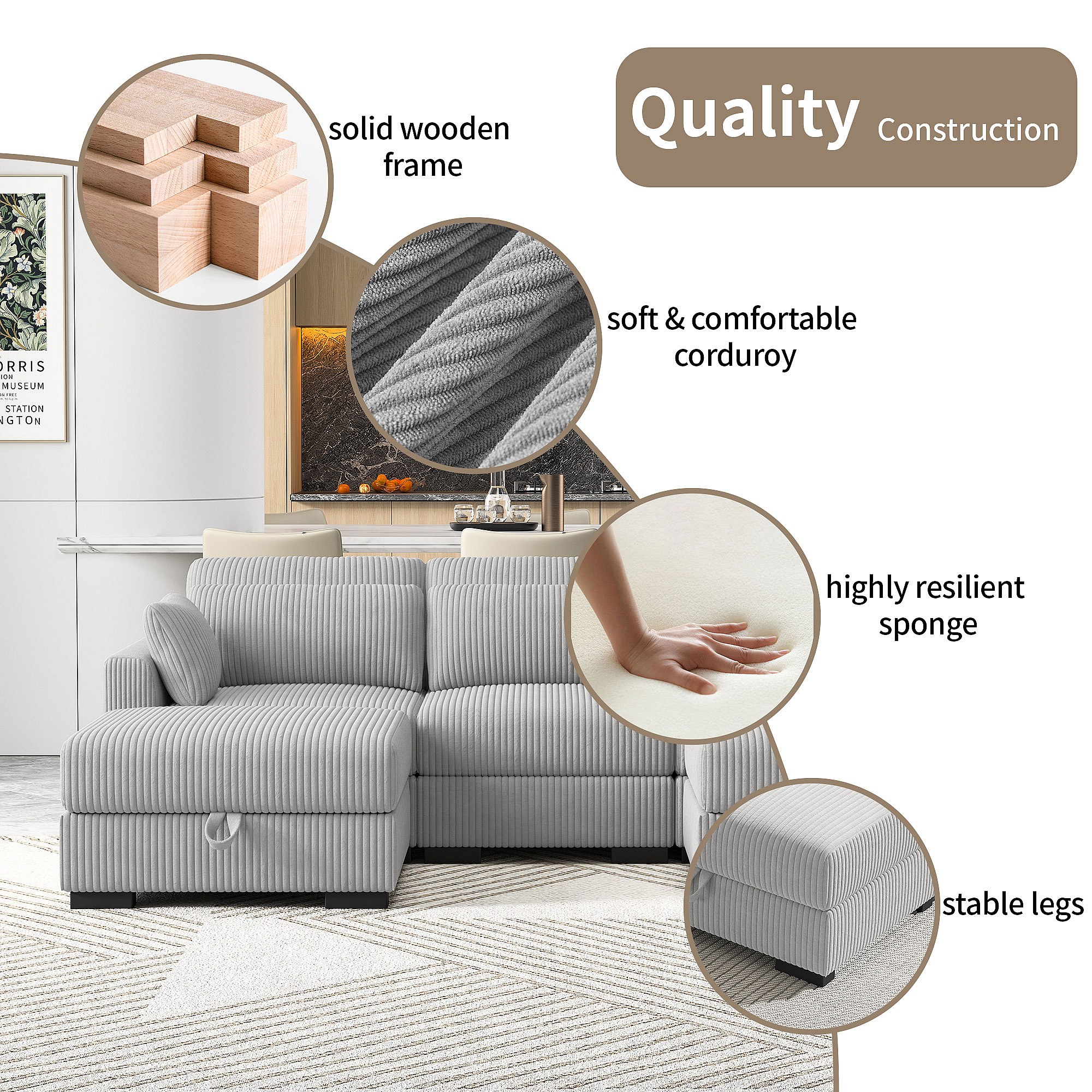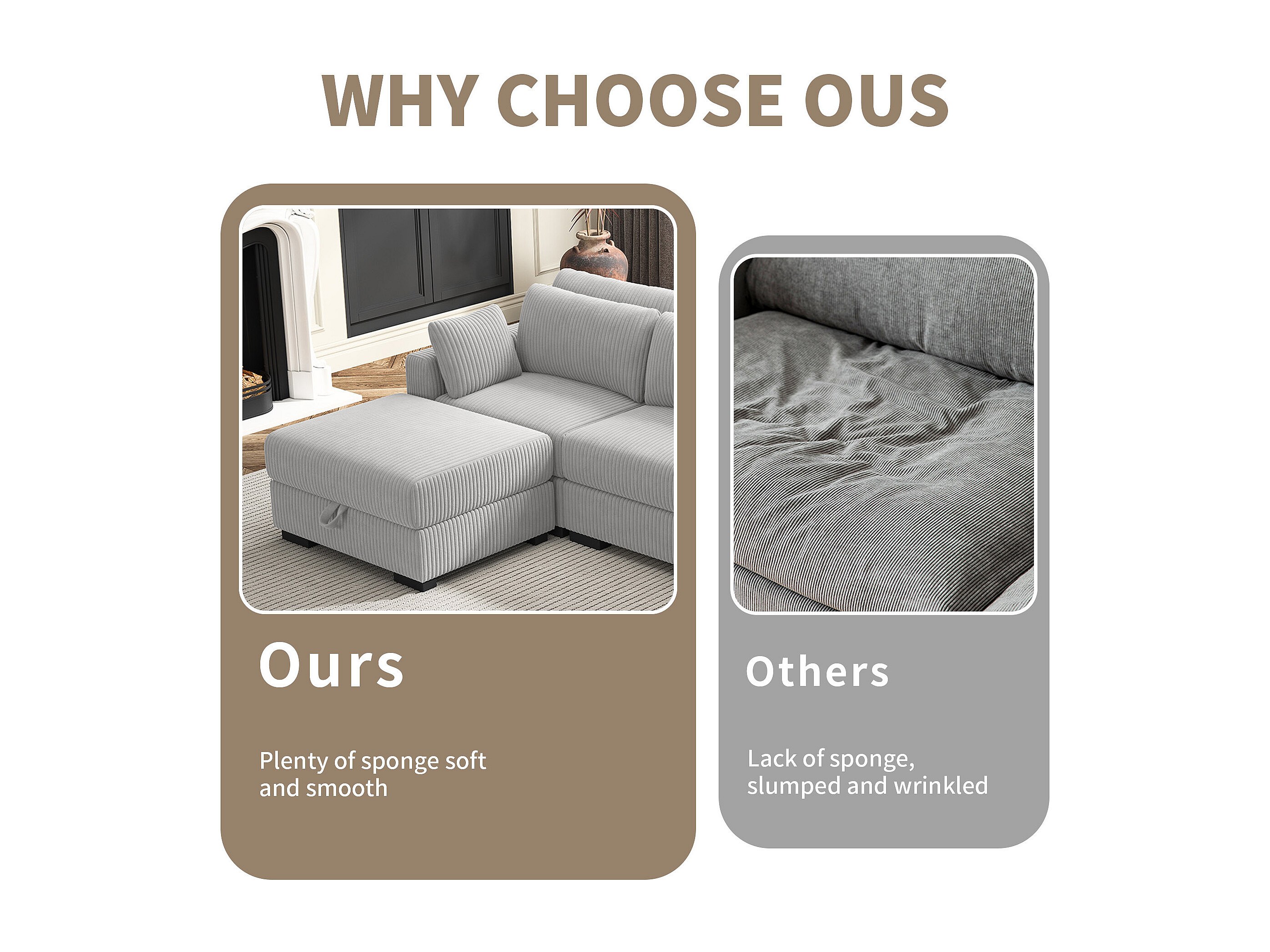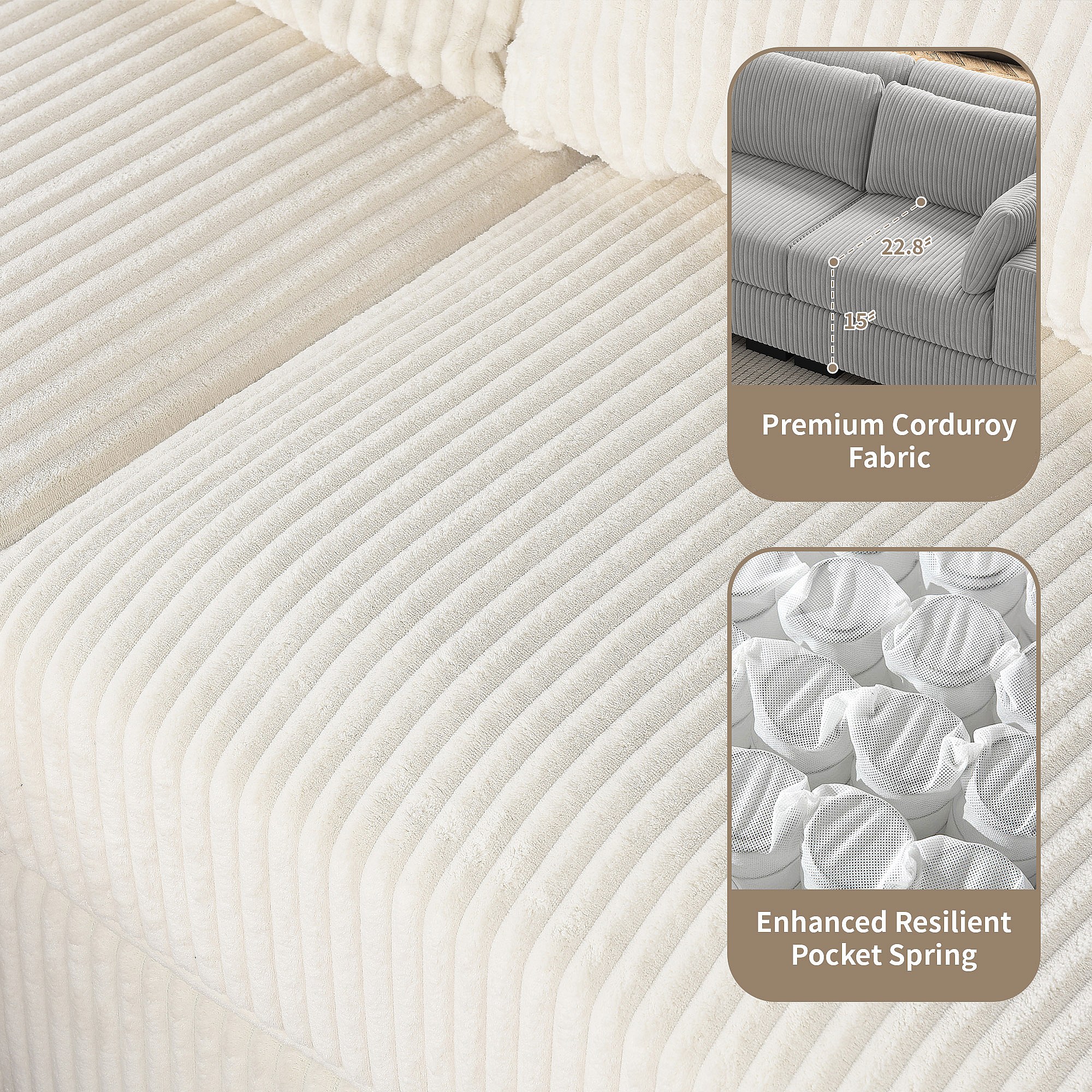 Canapé en forme de 2 places avec tabouret de rangement, canapé d'angle en velours côtelé avec ottoman, canapé doux pour salon, famille, gris