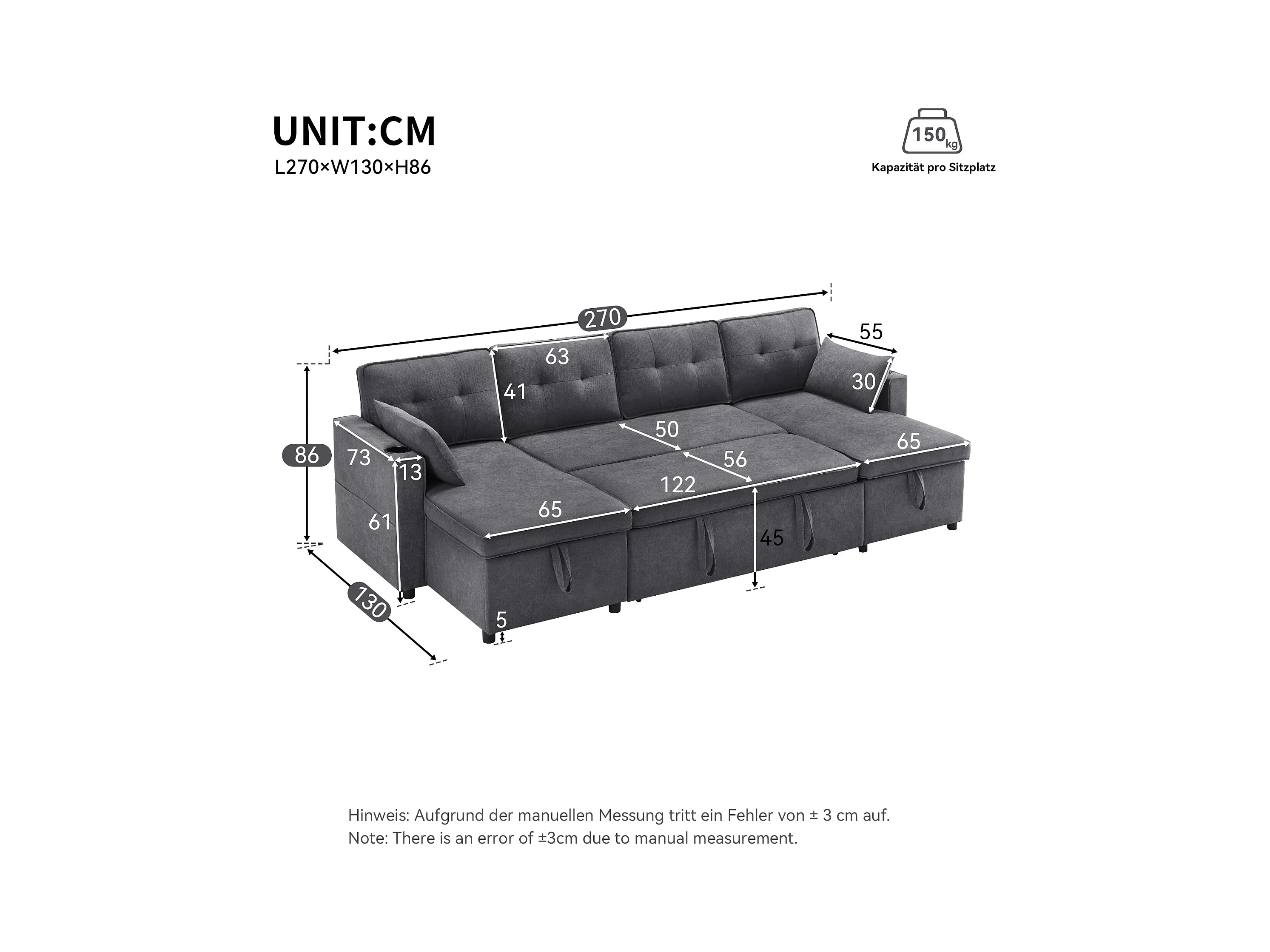Canapé en U 270x130x86cm - Canapé rembourré - Tissu coton et lin - Avec porte-gobelet - Deux compartiments de rangement - Gris