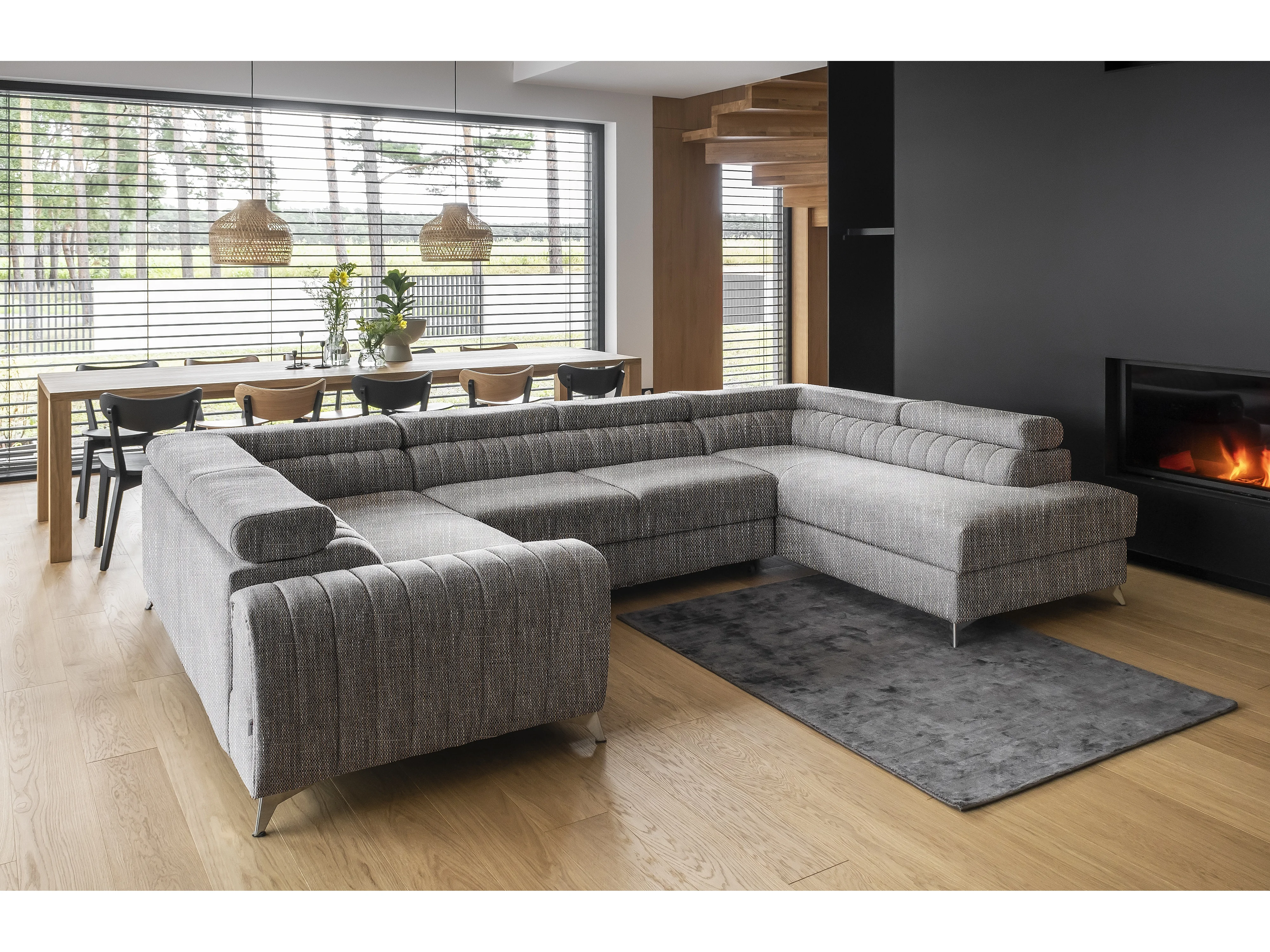 Canapé en U convertible tissu marron chiné coffre de rangement à Louve 340cm-Coffre de rangement à droite