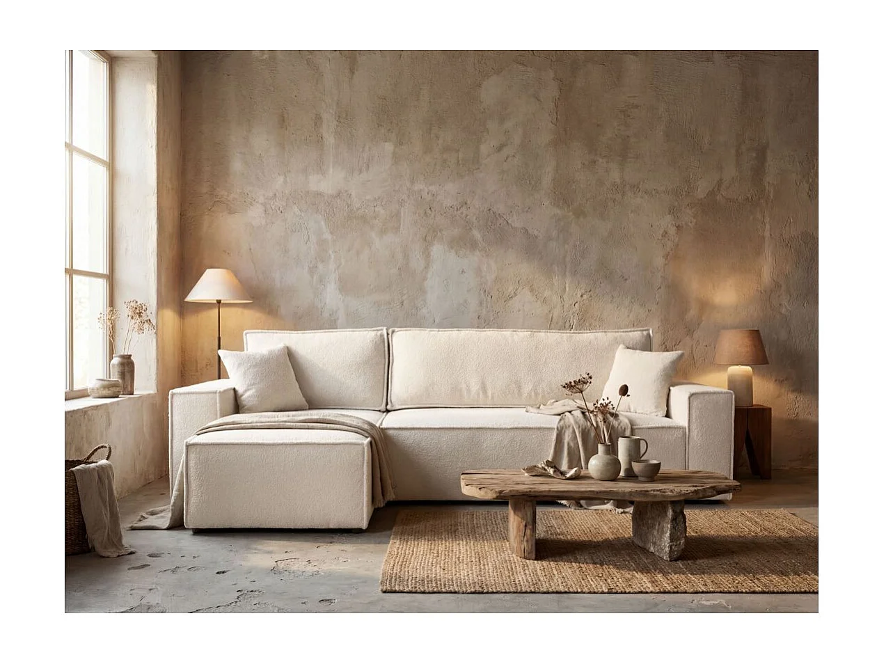 Canapé FARAH d'angle réversible et convertible 4 places en tissu bouclette - Blanc
