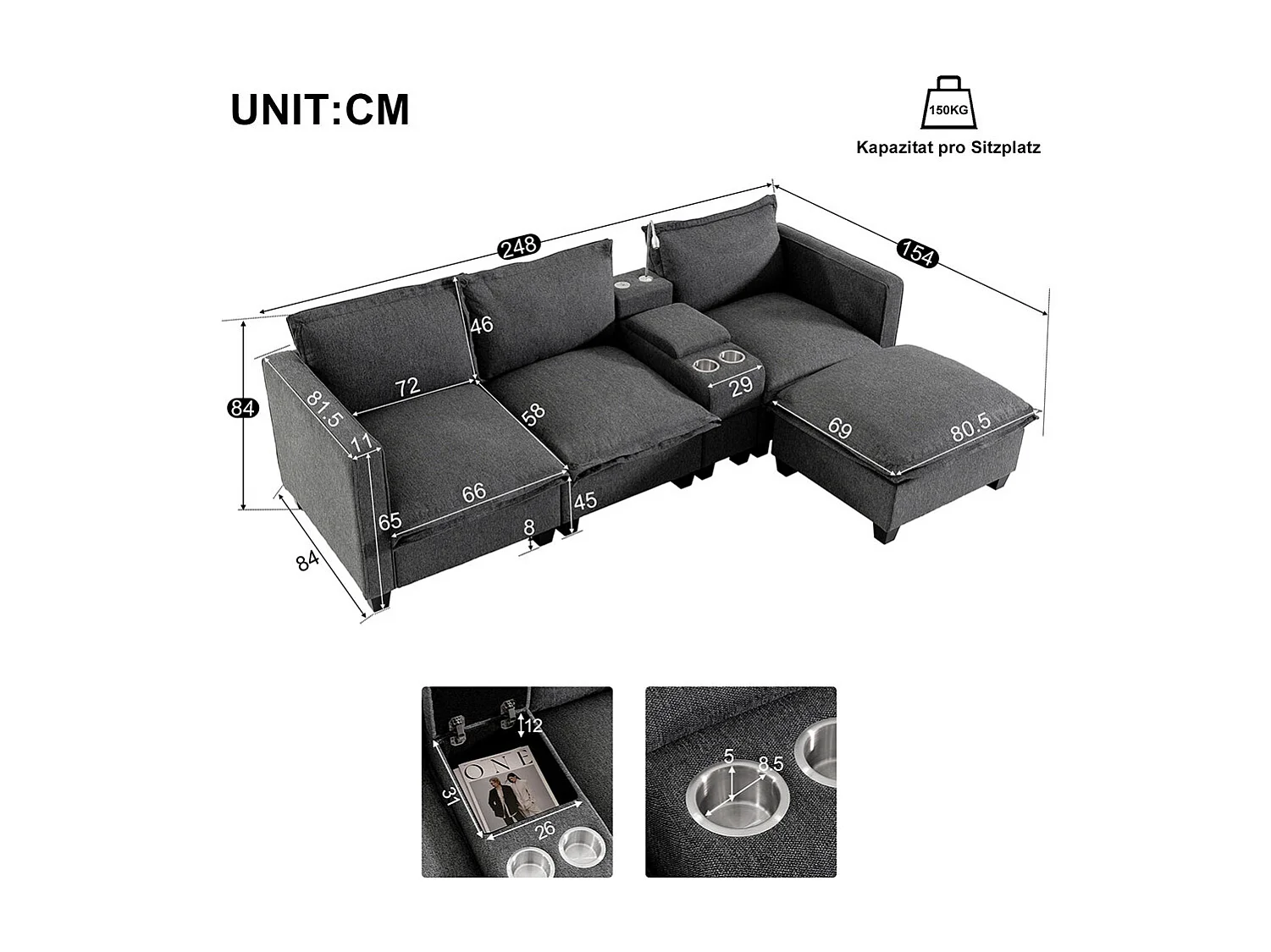 Canapé fixe 3 places avec espace de rangement port USB lampe de lecture porte-gobelet en chenille avec pouf gris