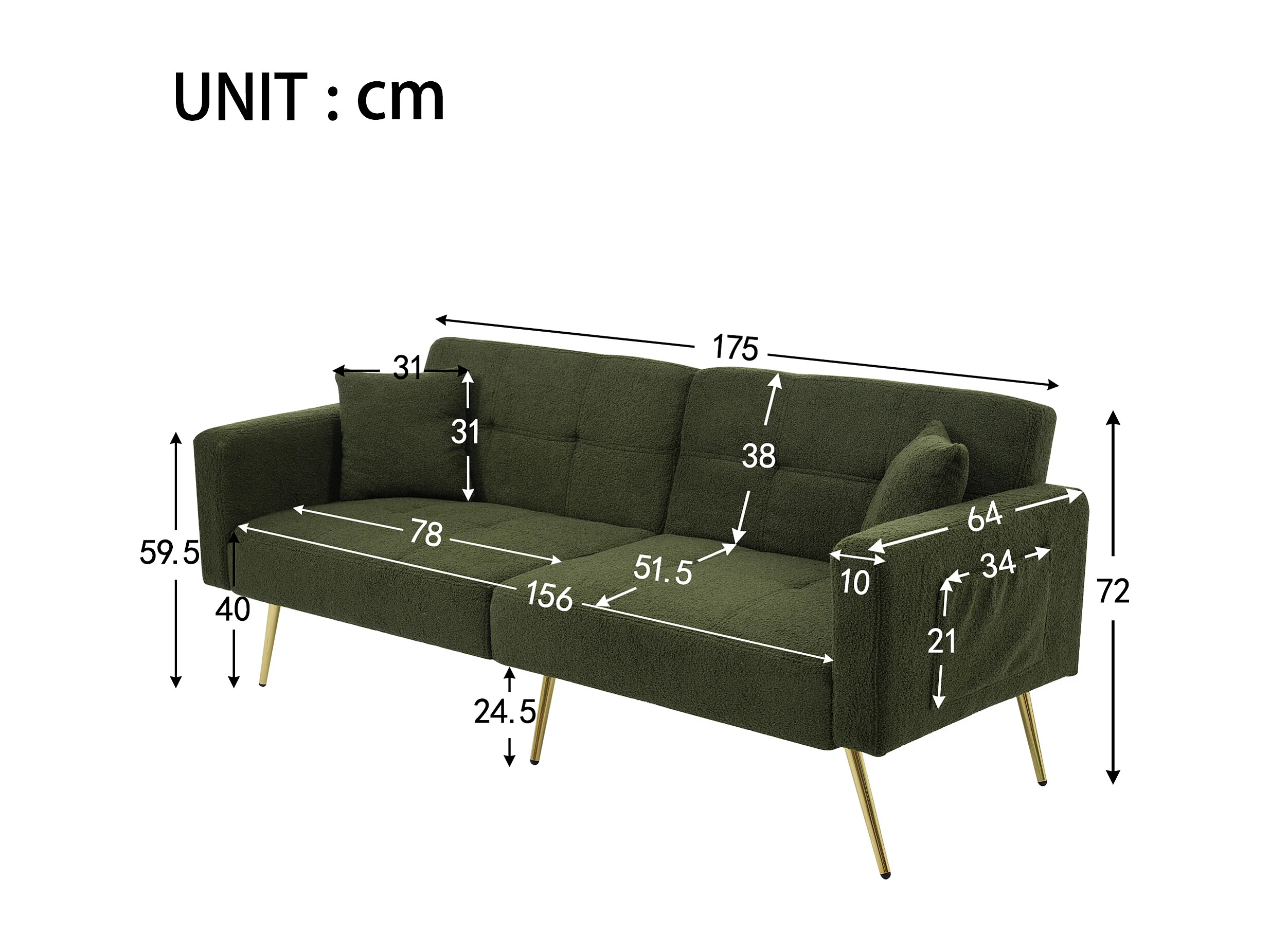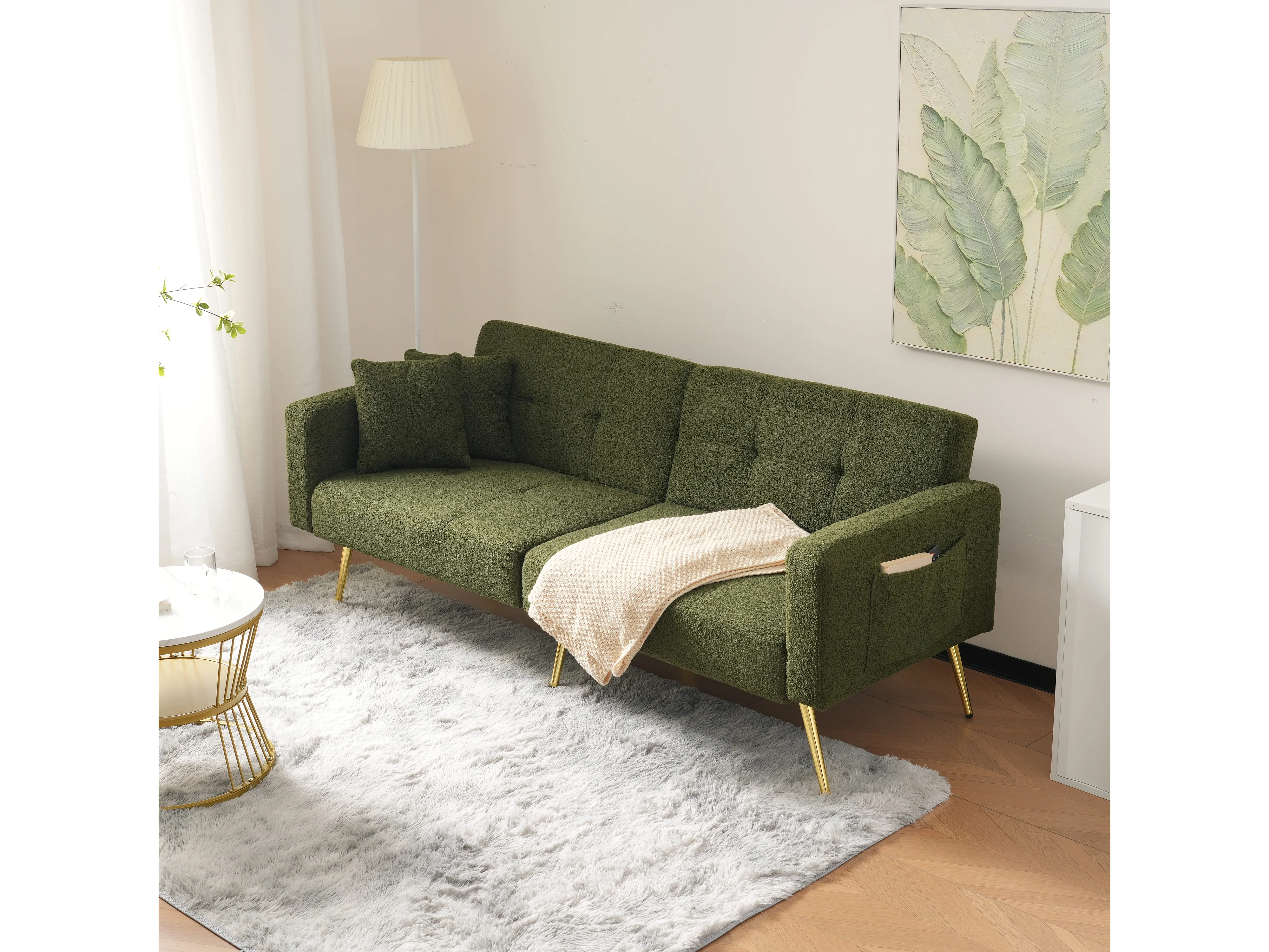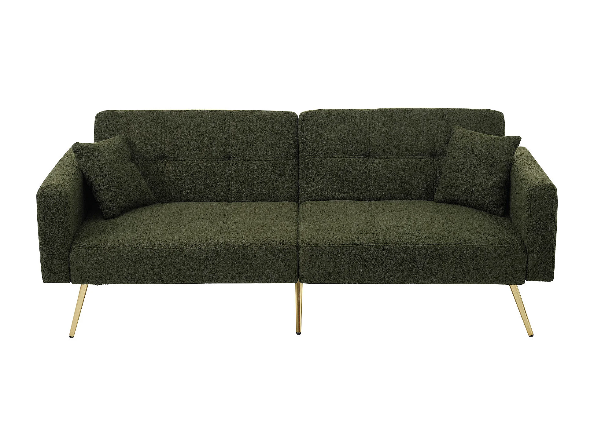 Canapé fonction convertible style contemporain dossier réglable revêtement sherpa pour salon vert antique pieds dorés