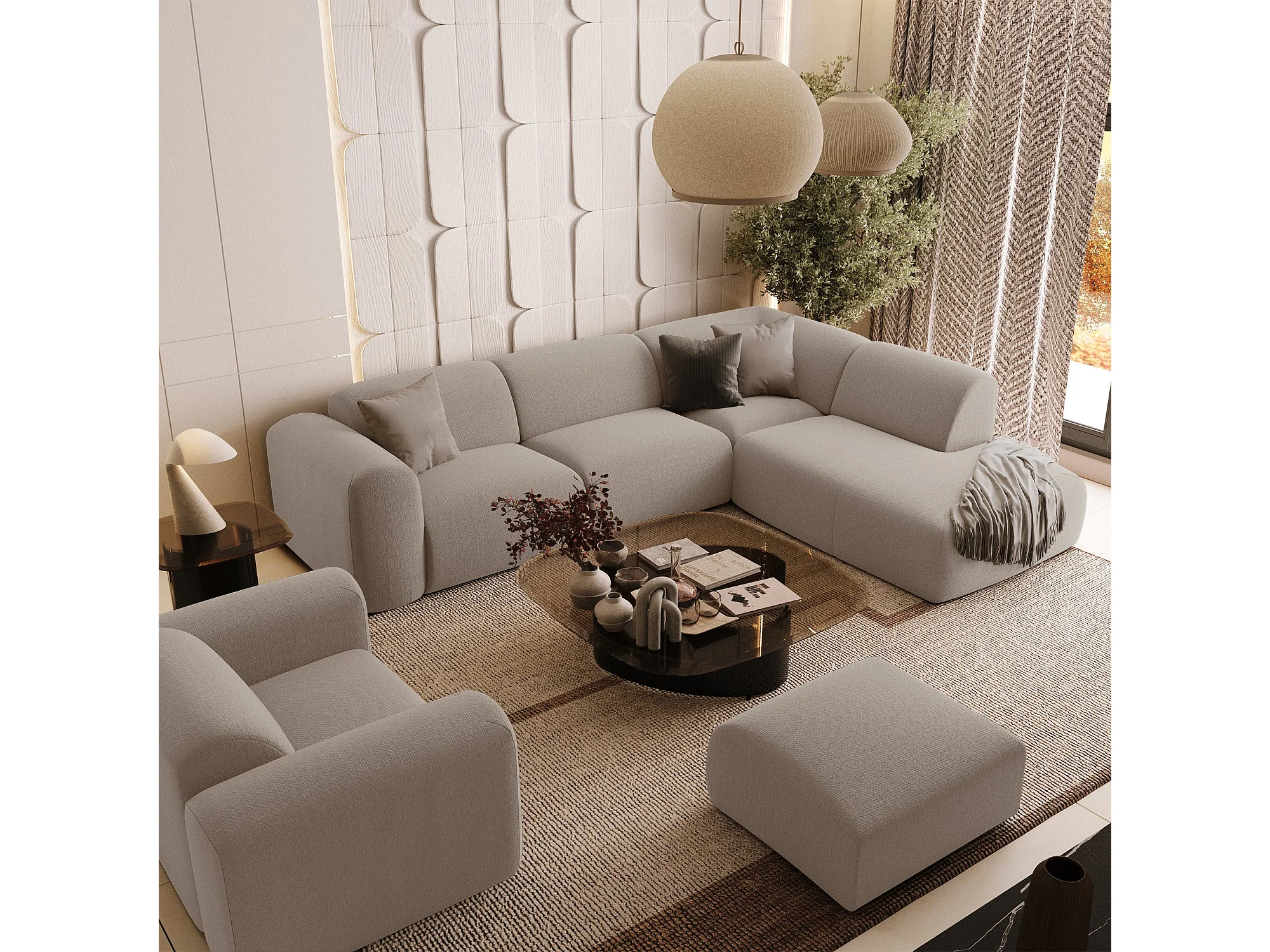 Canapé grand angle droit 5 places tissu tramé beige MYRA