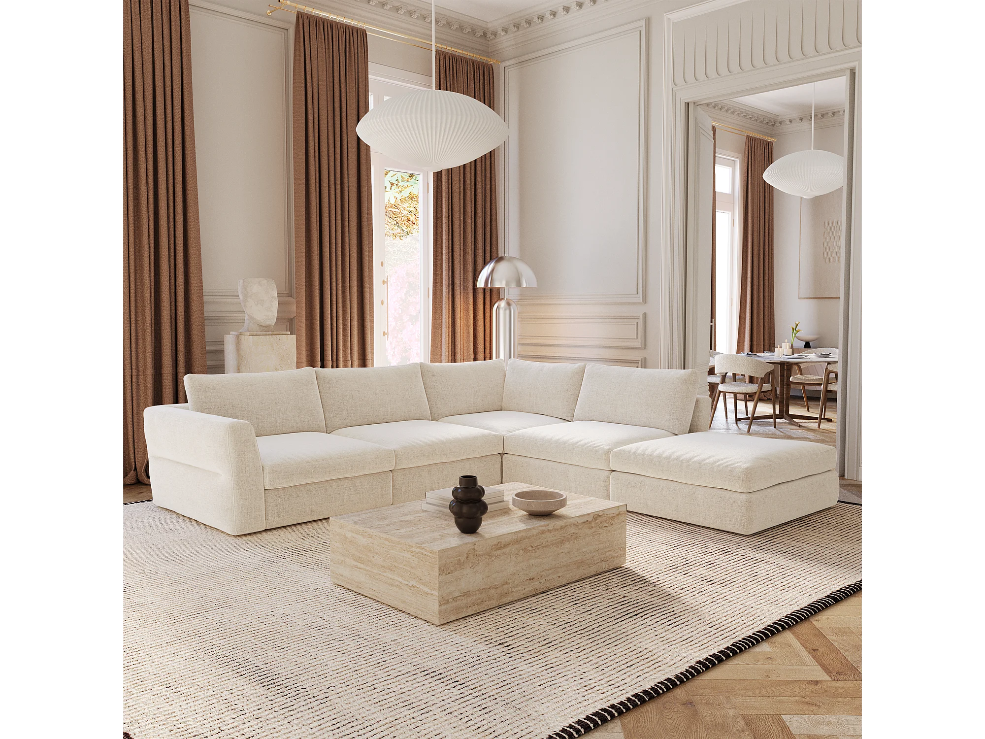 Canapé grand angle droit modulable 7 places tissu tramé doux beige NEST