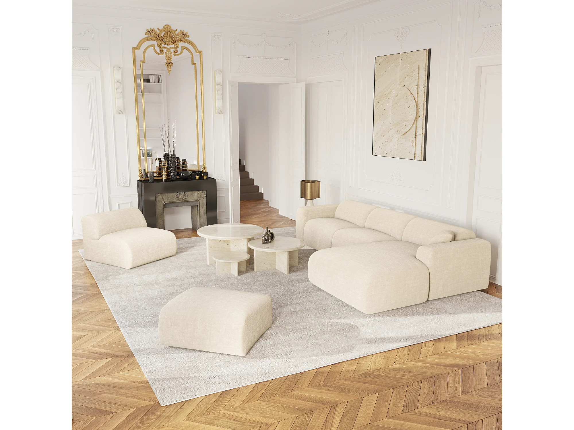 Canapé grand angle droit velours à motifs crème MYRA