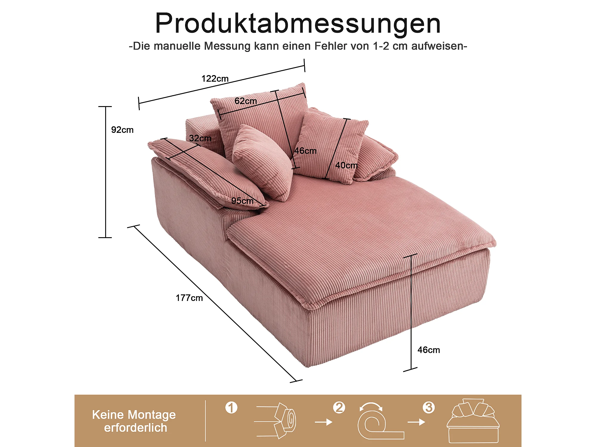 Canapé inclinable 1 place - Fauteuil lounge en velours côtelé - Sans montage - Rose