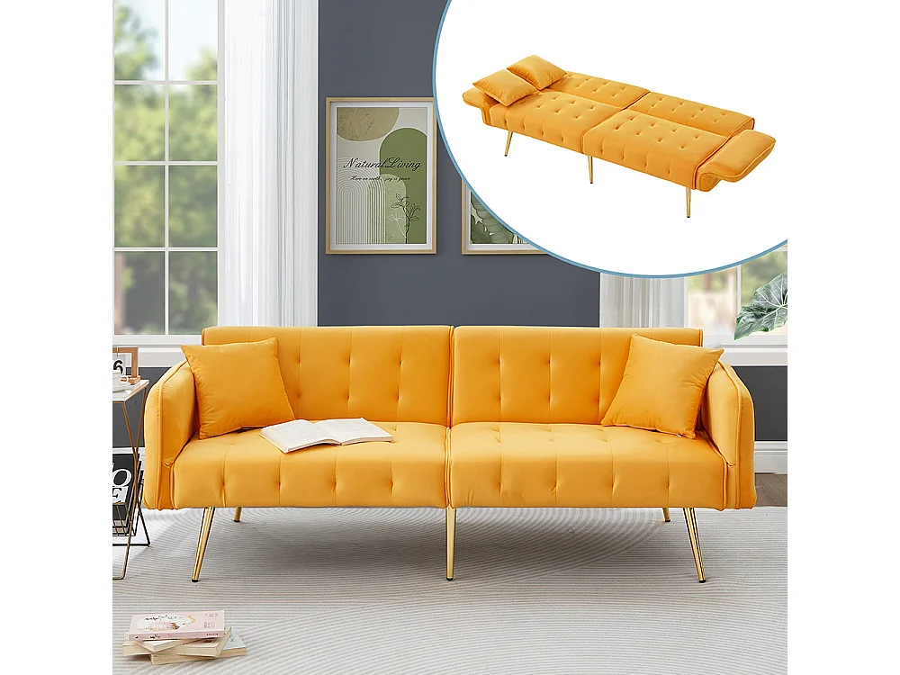 Canapé jaune convertible deux places lit dossier réglable accoudoirs positions multiples pliant velours espace couchage généreux