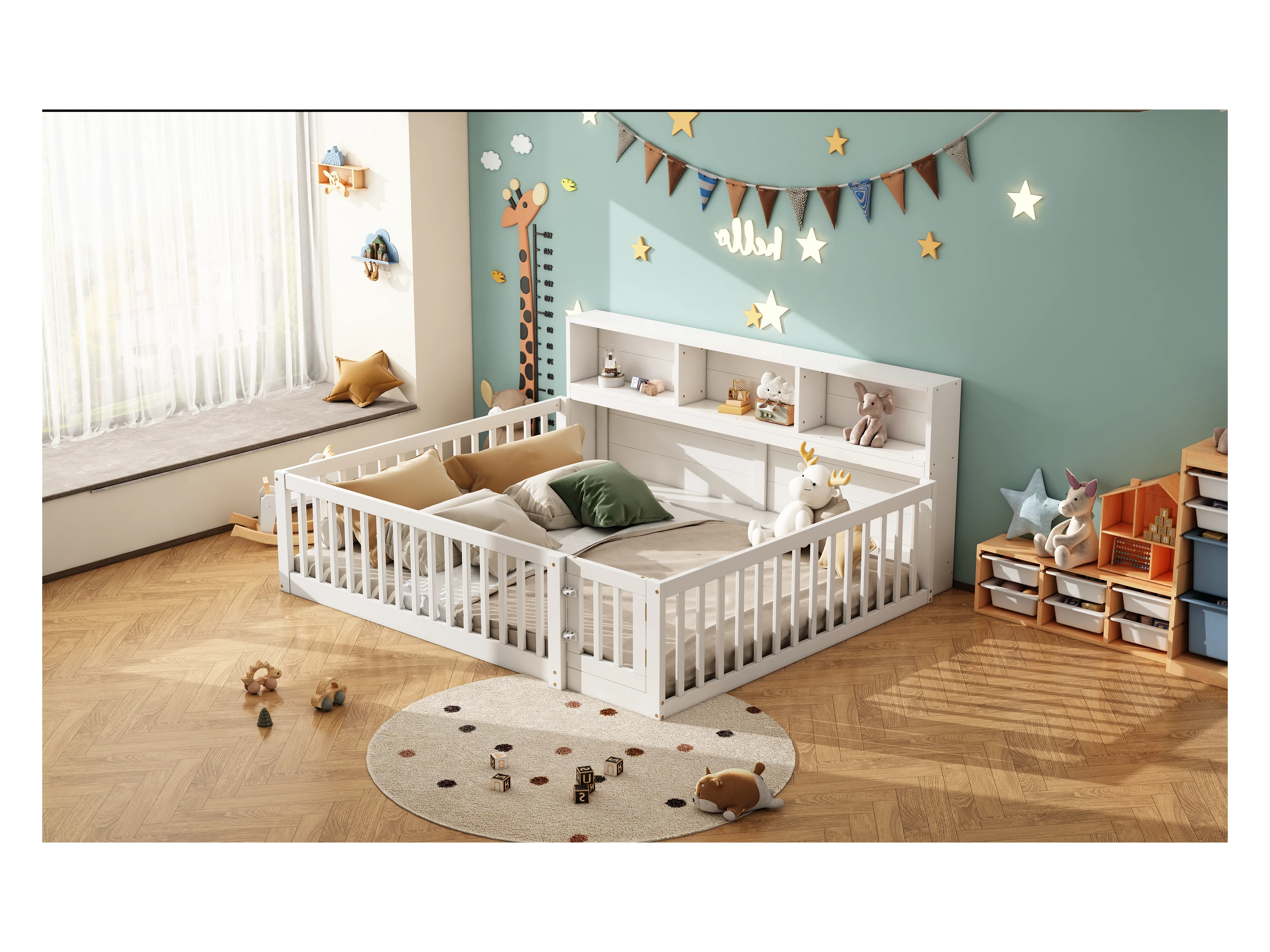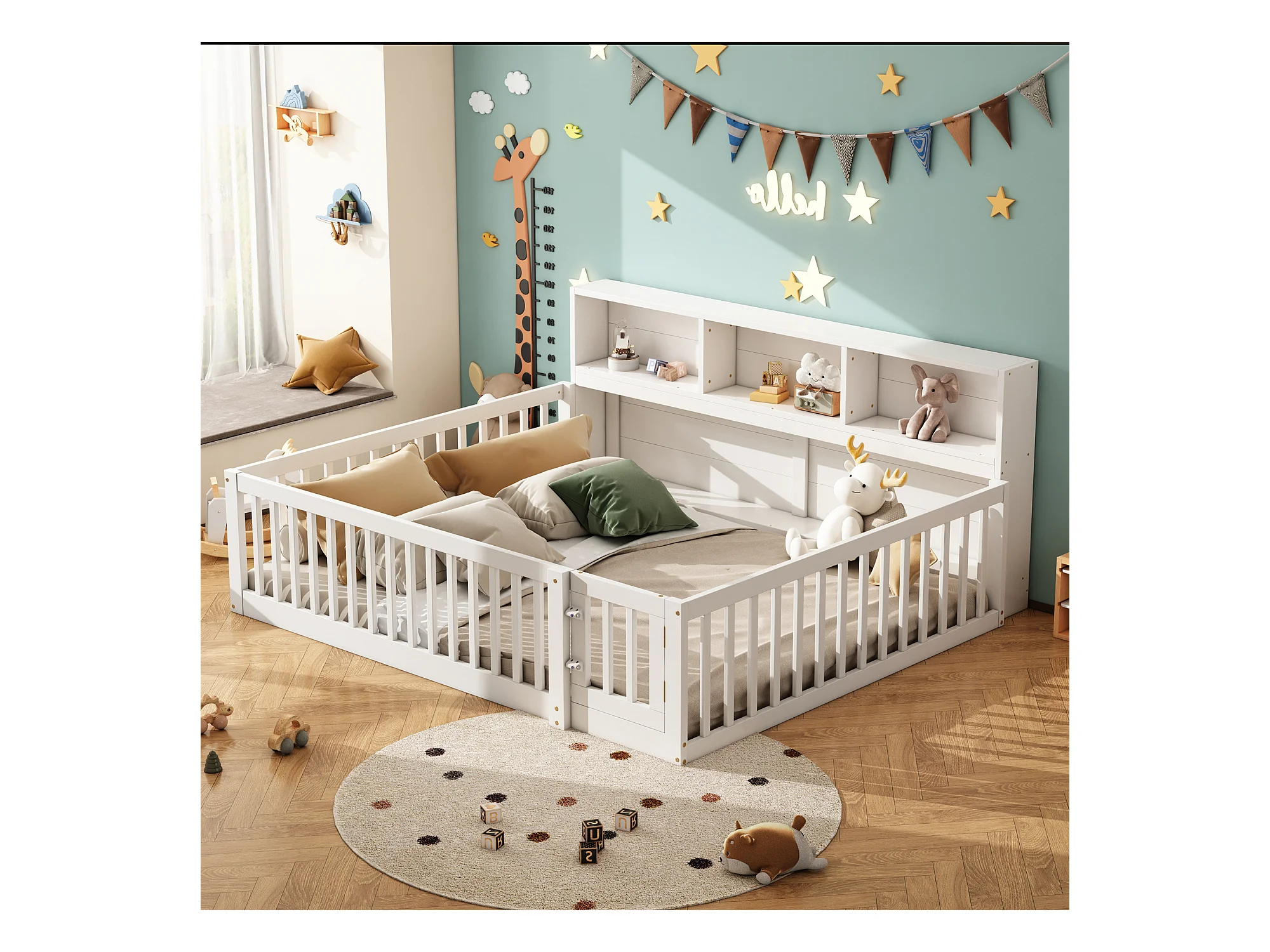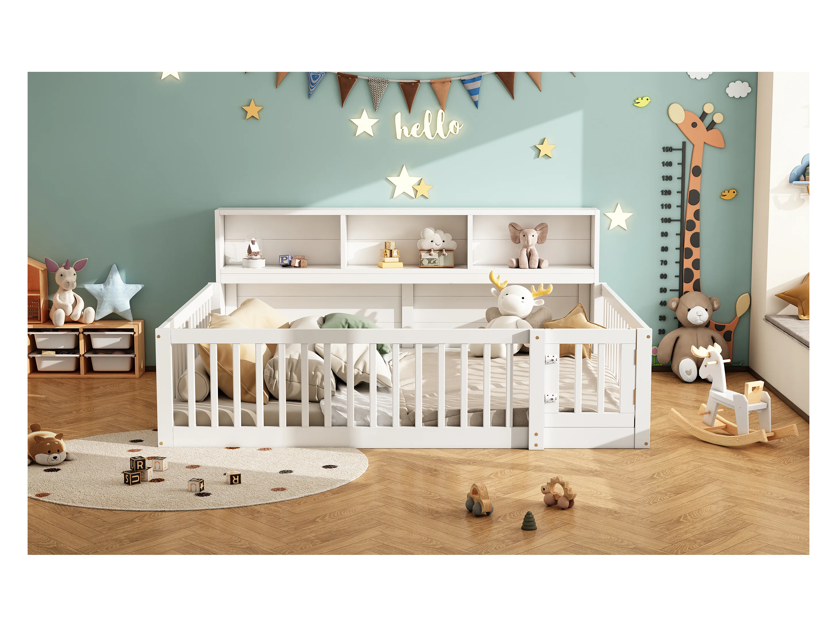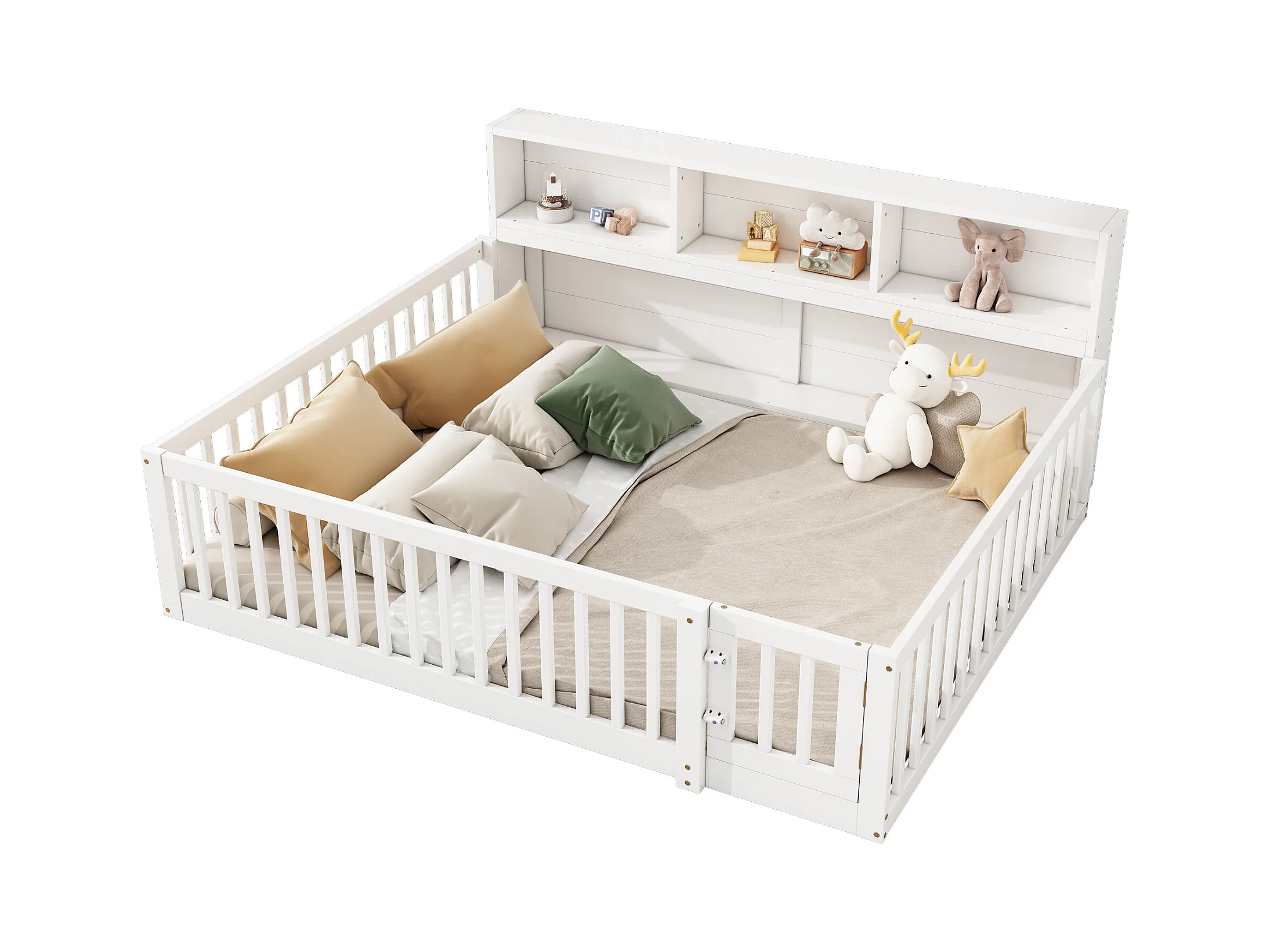 Canapé-lit 140x200 cm en bois de pin, avec espace de rangement latéral, sommier inclus et garde-corps, blanc