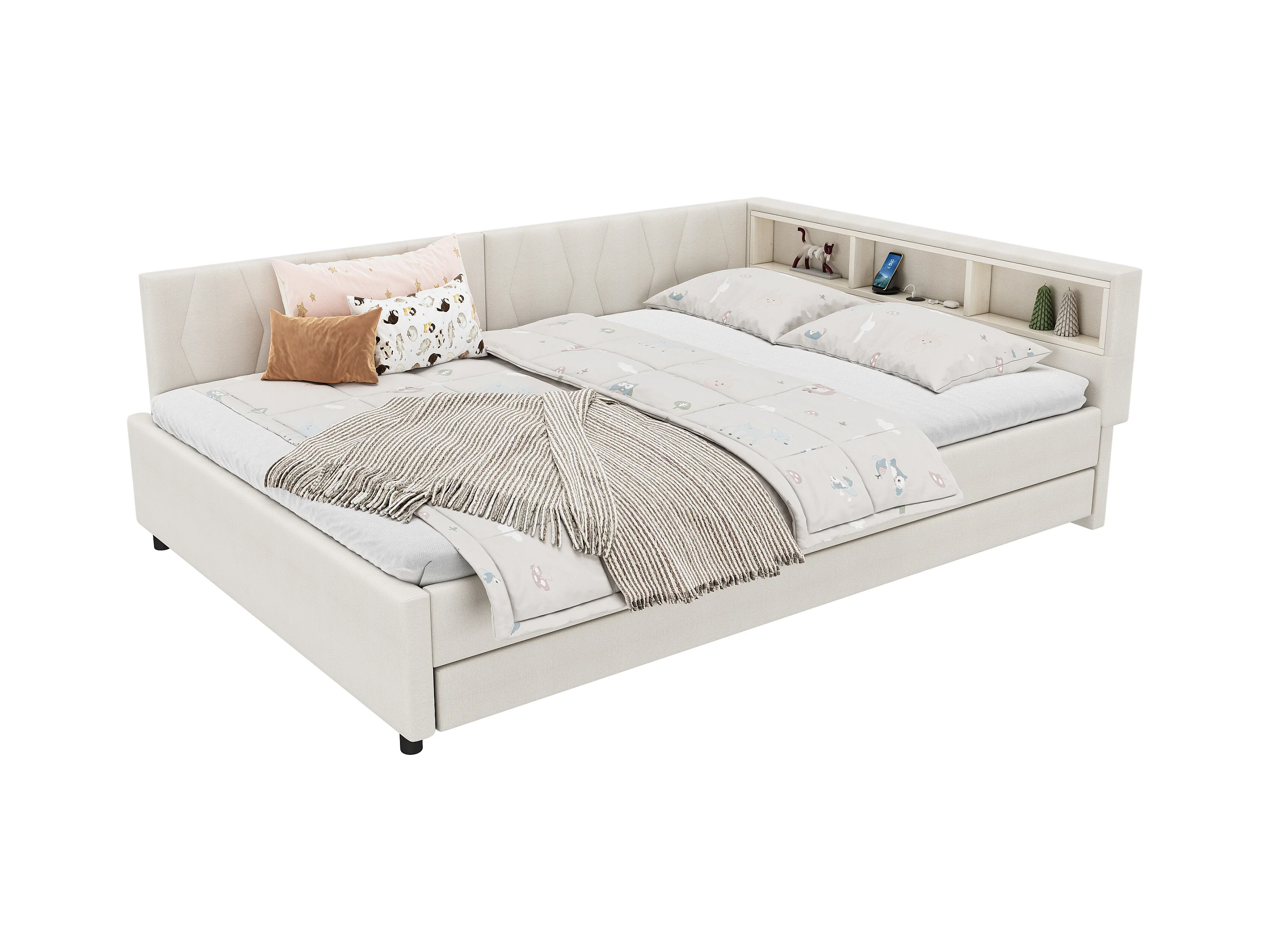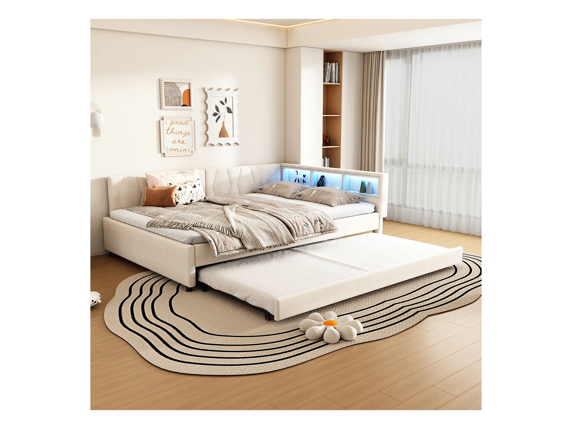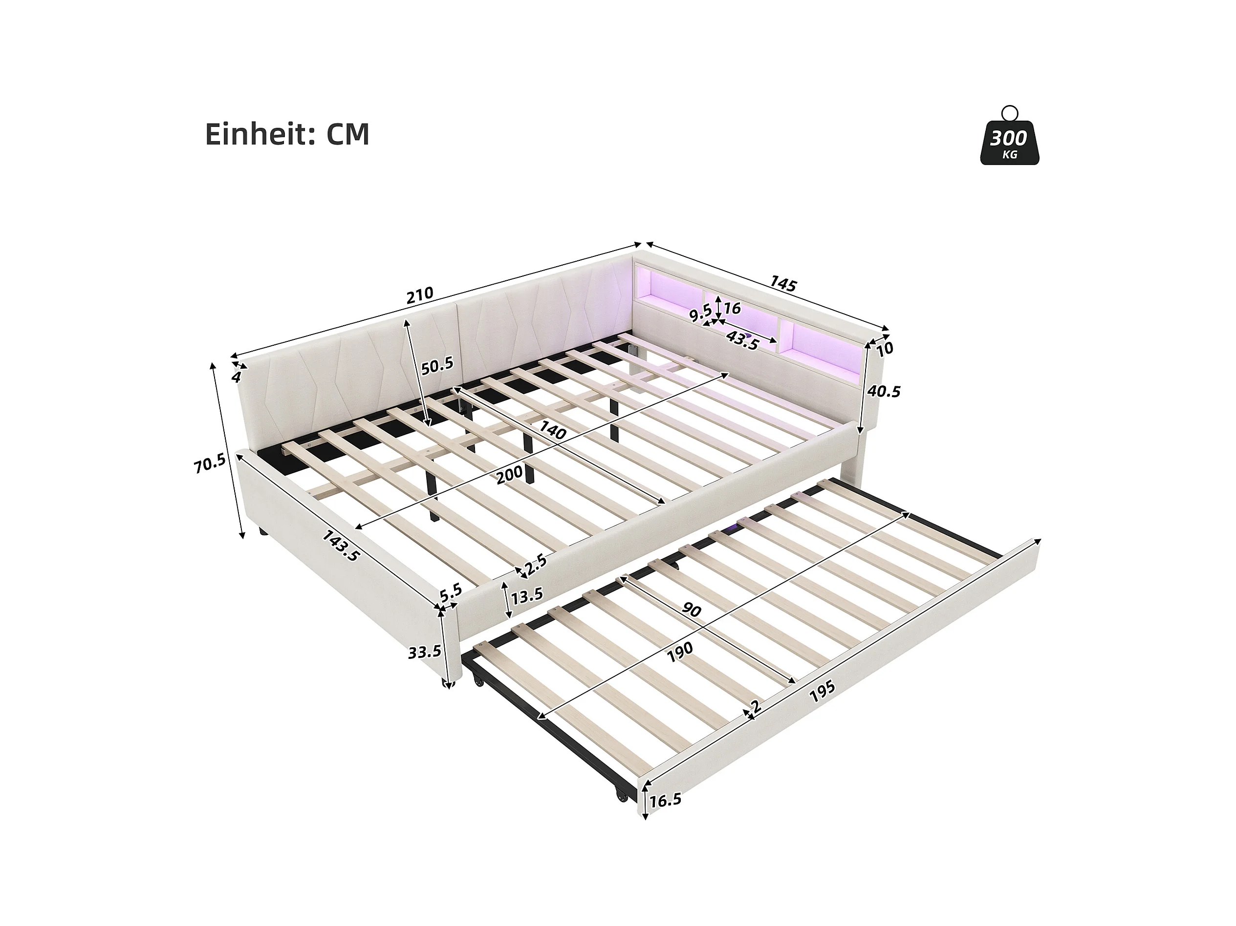 Canapé-lit 140x200cm - avec lit gigogne - avec USB + Type C - avec éclairage LED - beige (matelas non inclus)