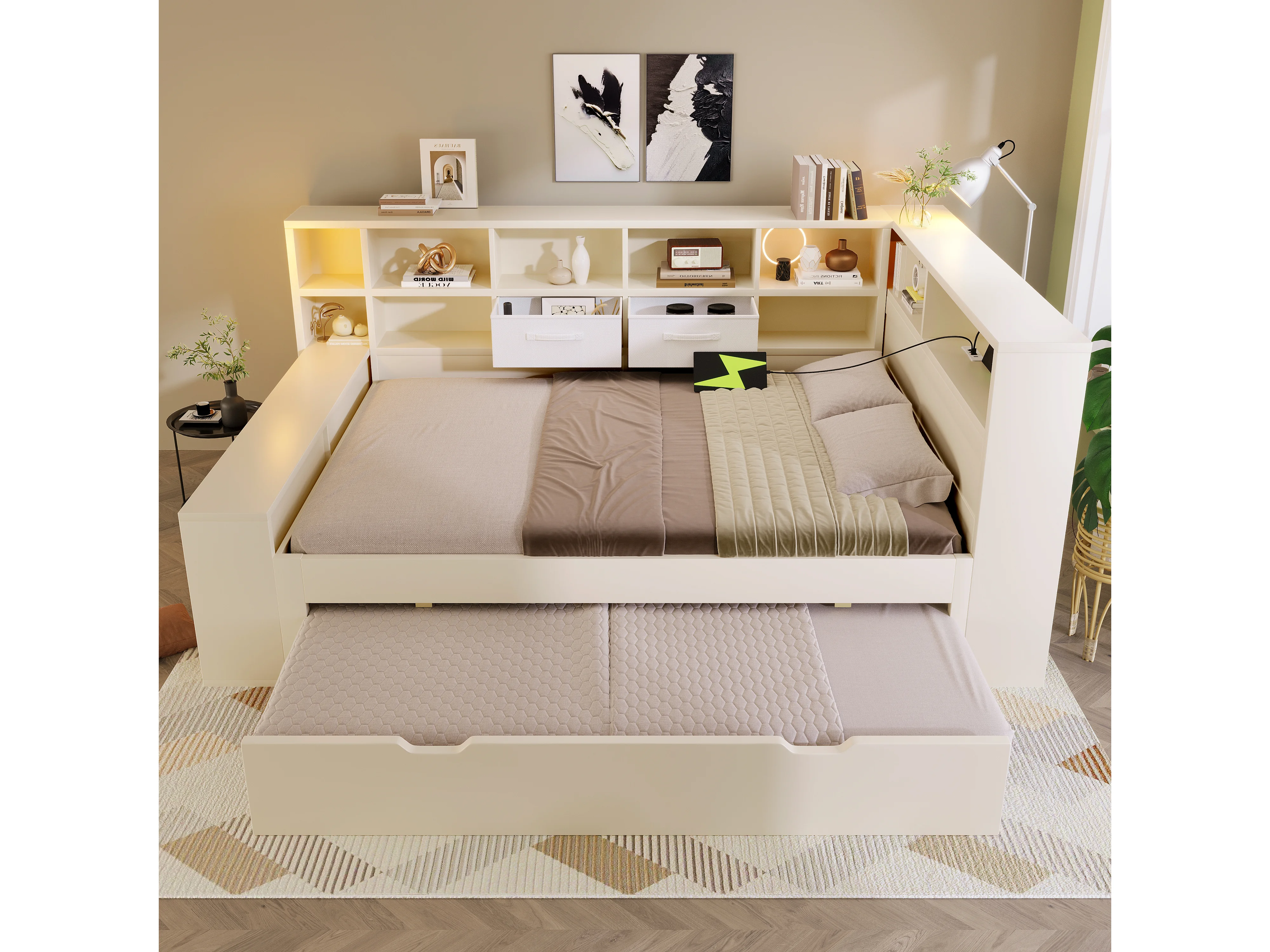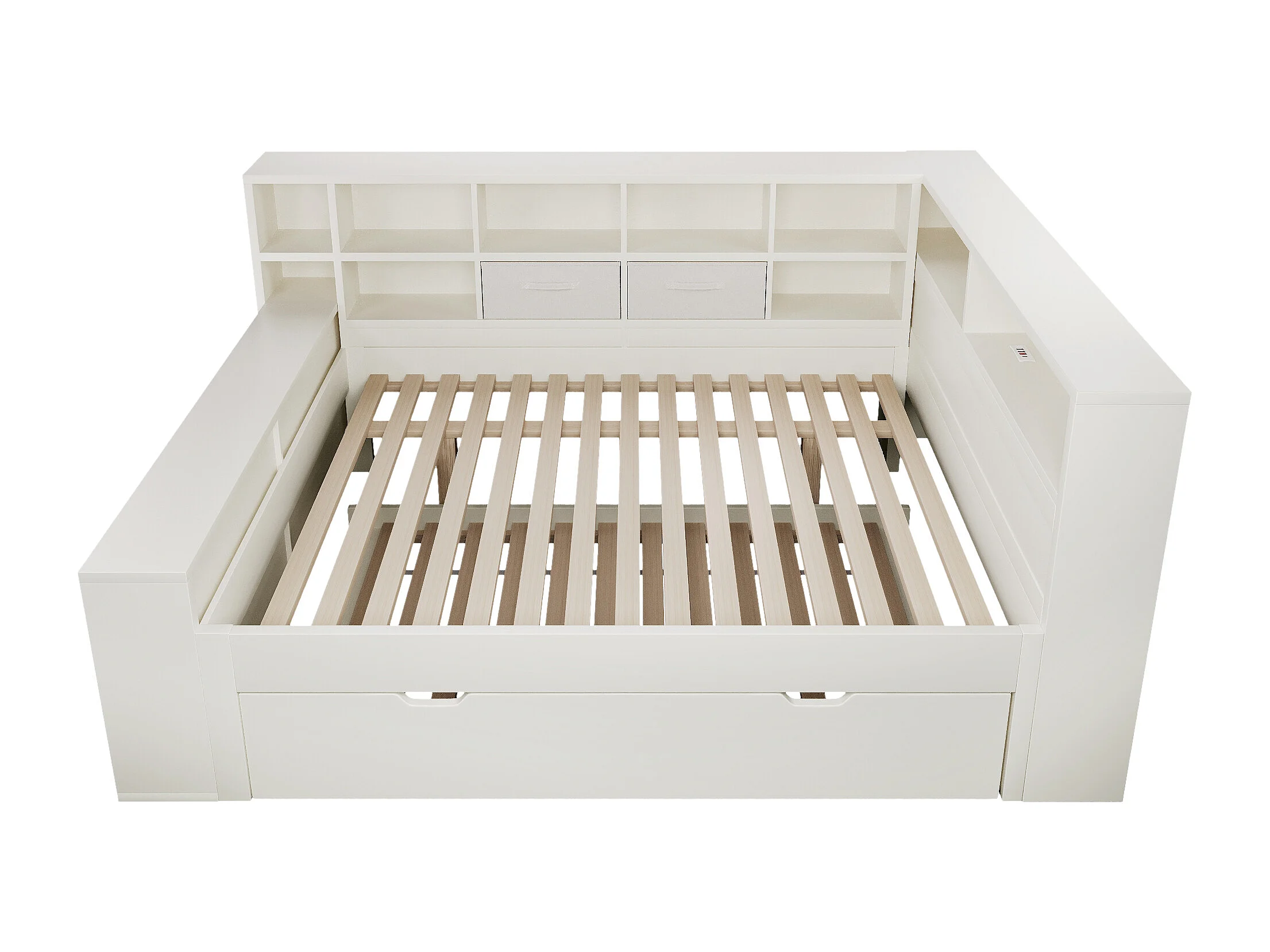 Canapé-lit 140x200cm - avec lit gigogne - avec USB/Type-C - avec espace de rangement - bois massif + panneaux de particules - blanc