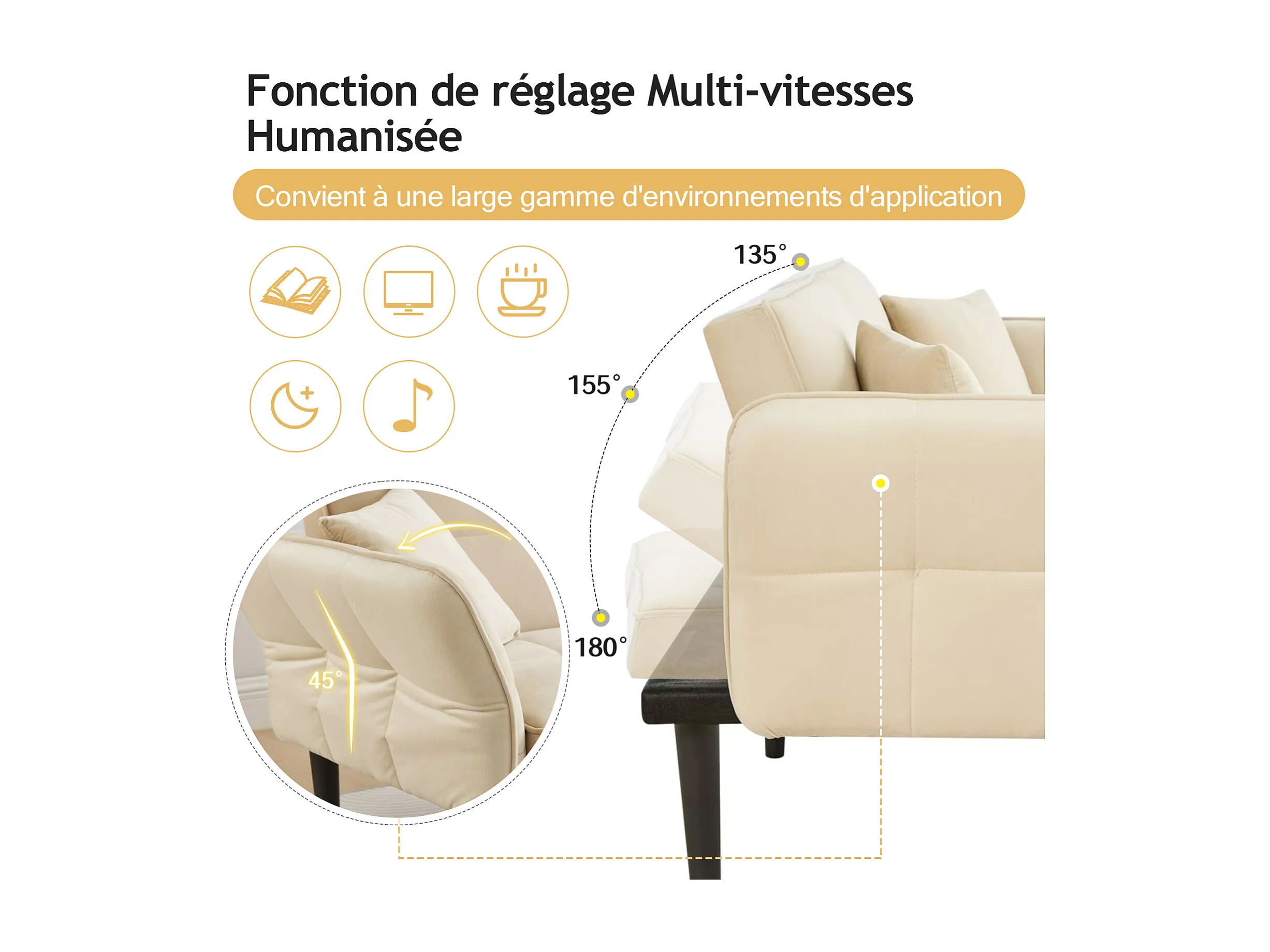 Canapé-lit 2 en 1 réglable - Dossier réglable - Pieds de canapé en bois et coussins inclus - Velours - 176 x 78 x 76 cm - Beige