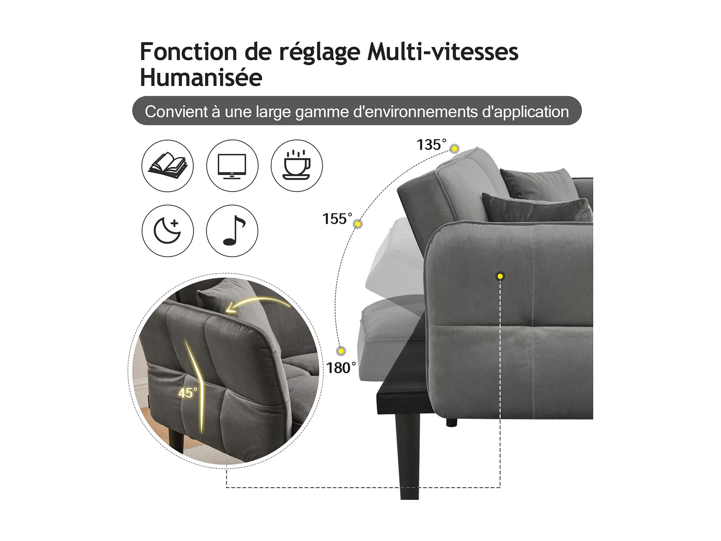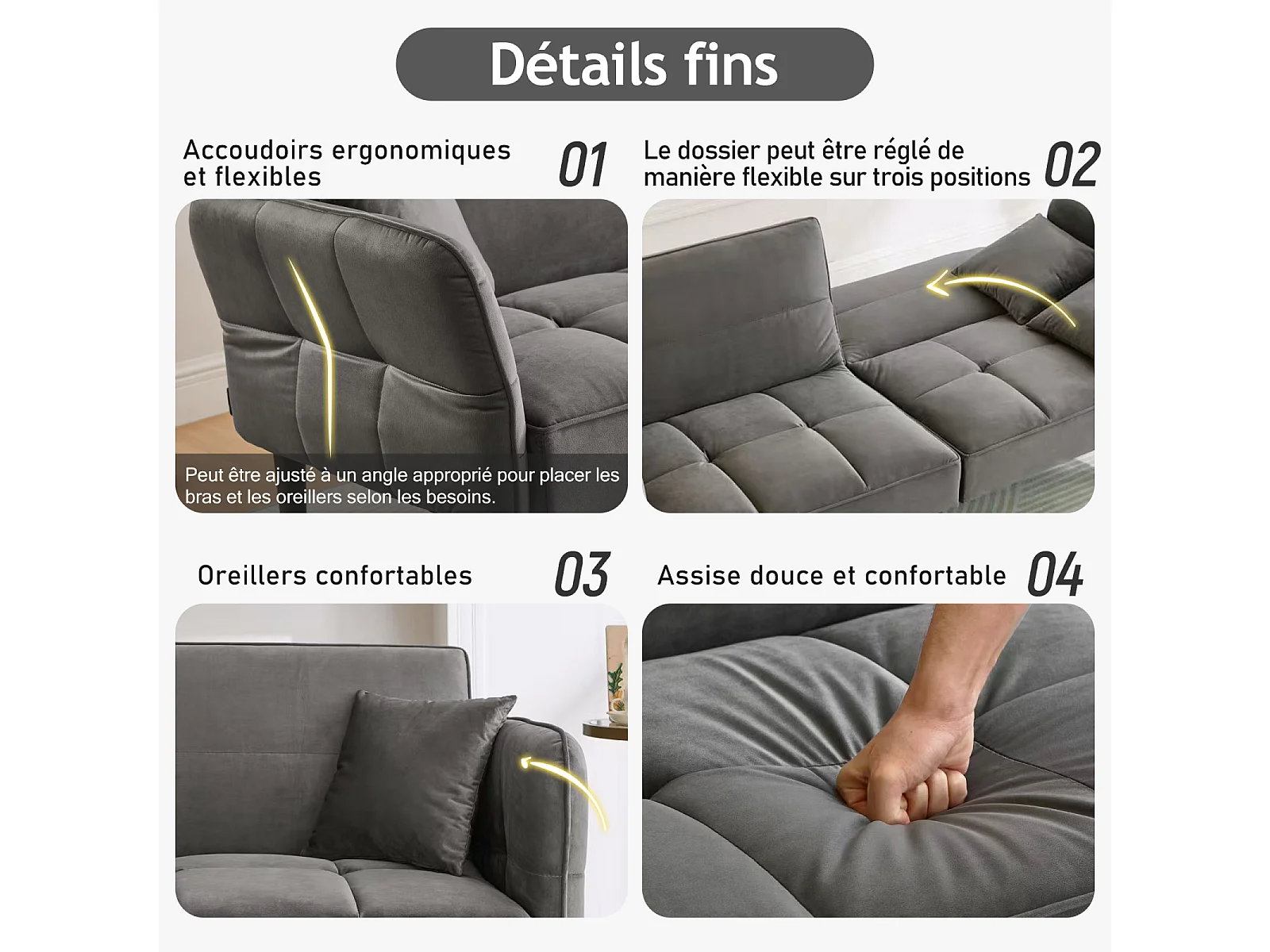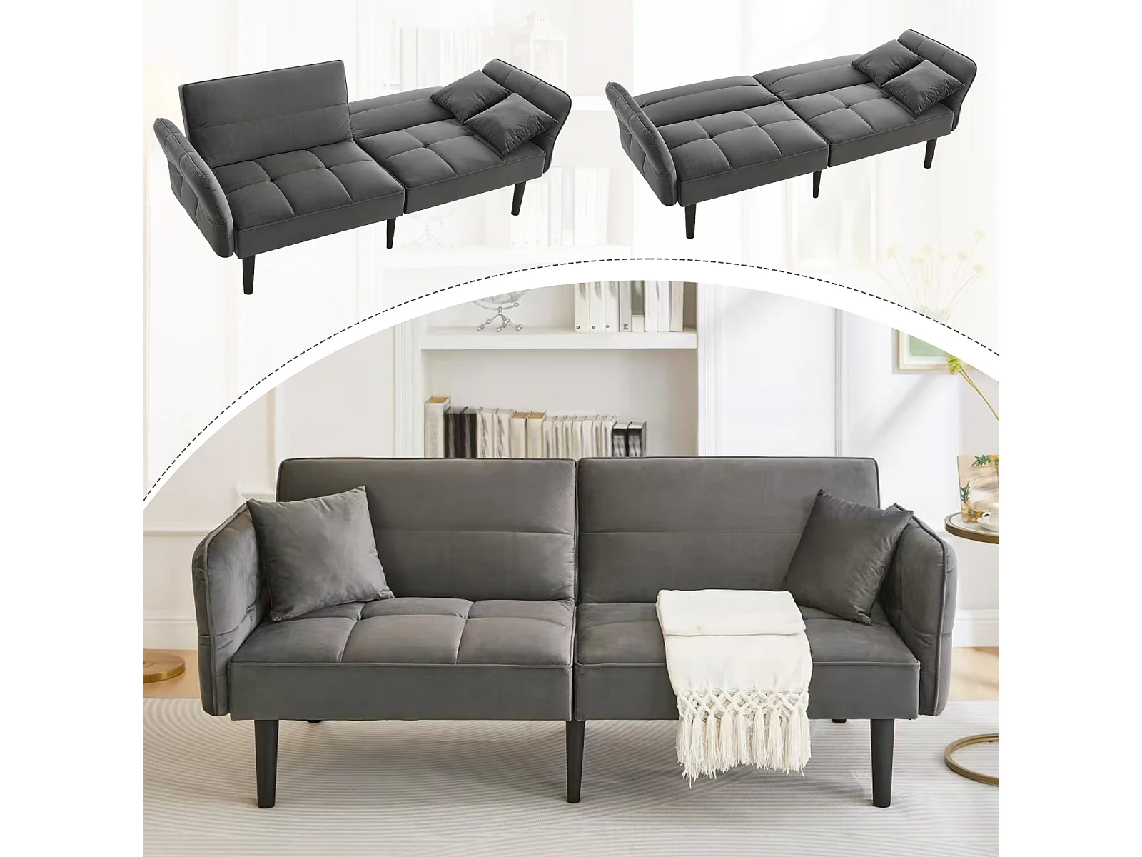 Canapé-lit 2 en 1 réglable - Dossier réglable - Pieds de canapé en bois et coussins inclus - Velours - 176 x 78 x 76 cm - gris