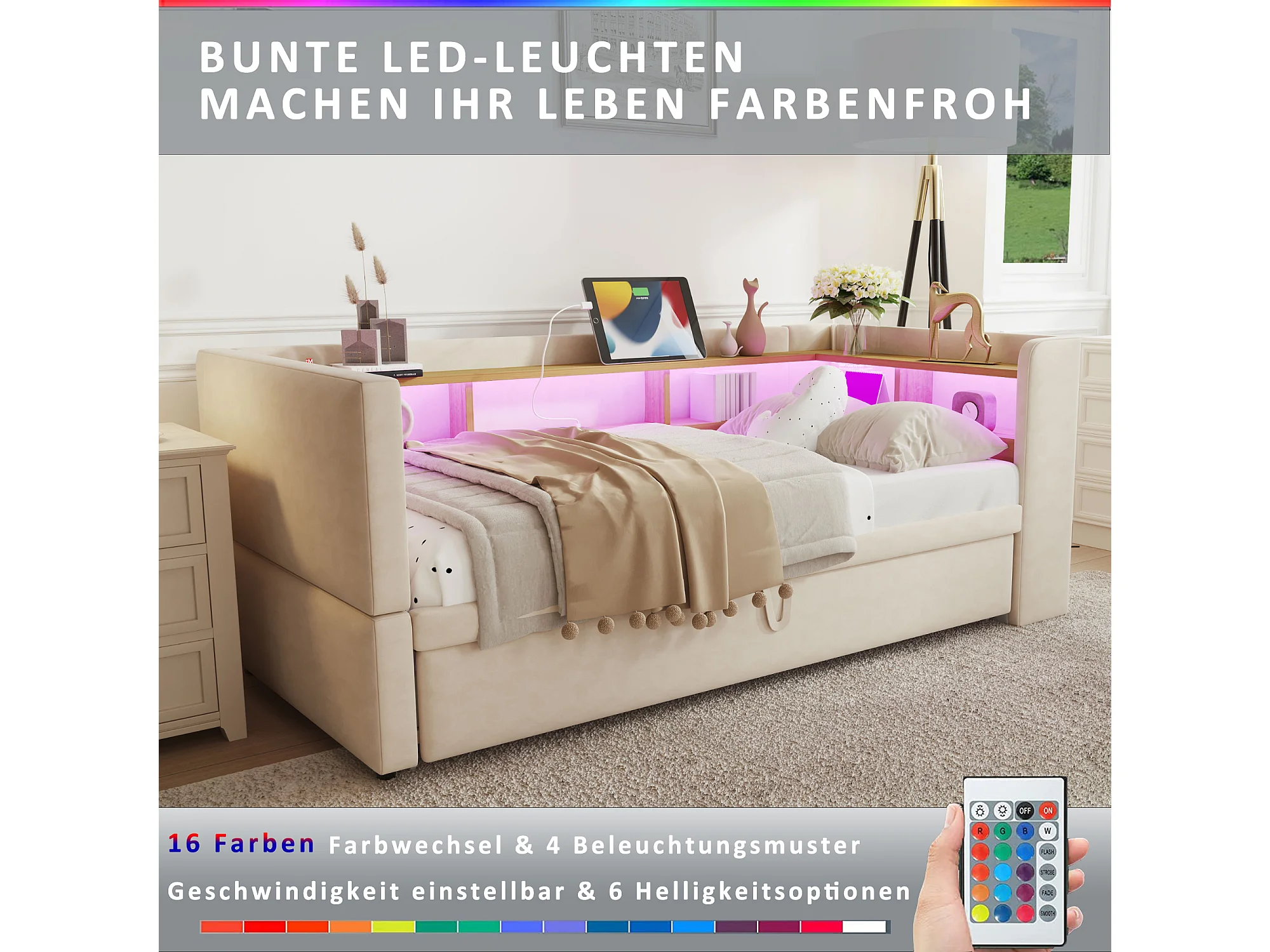 Canapé lit 2 Places Convertible 180 x 190 cm avec LED et USB, Lit rembourré avec Rangement , Beige