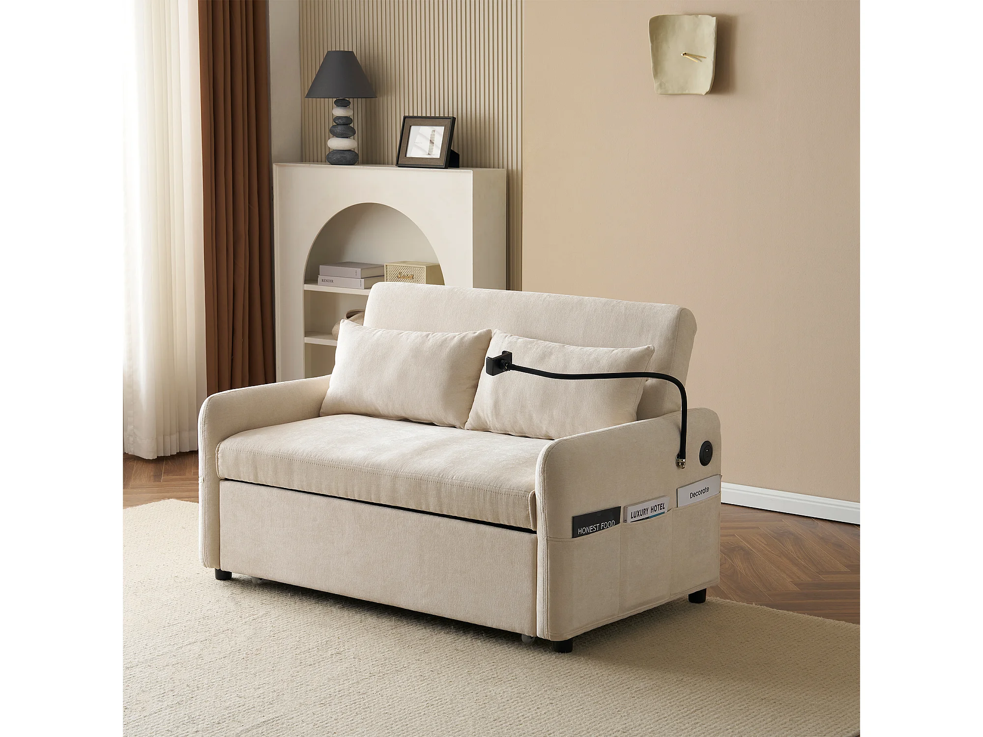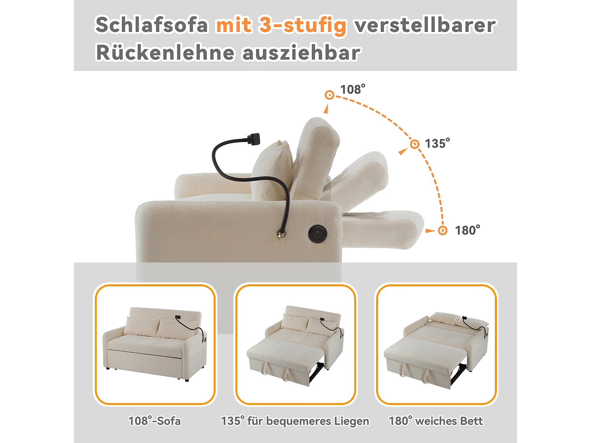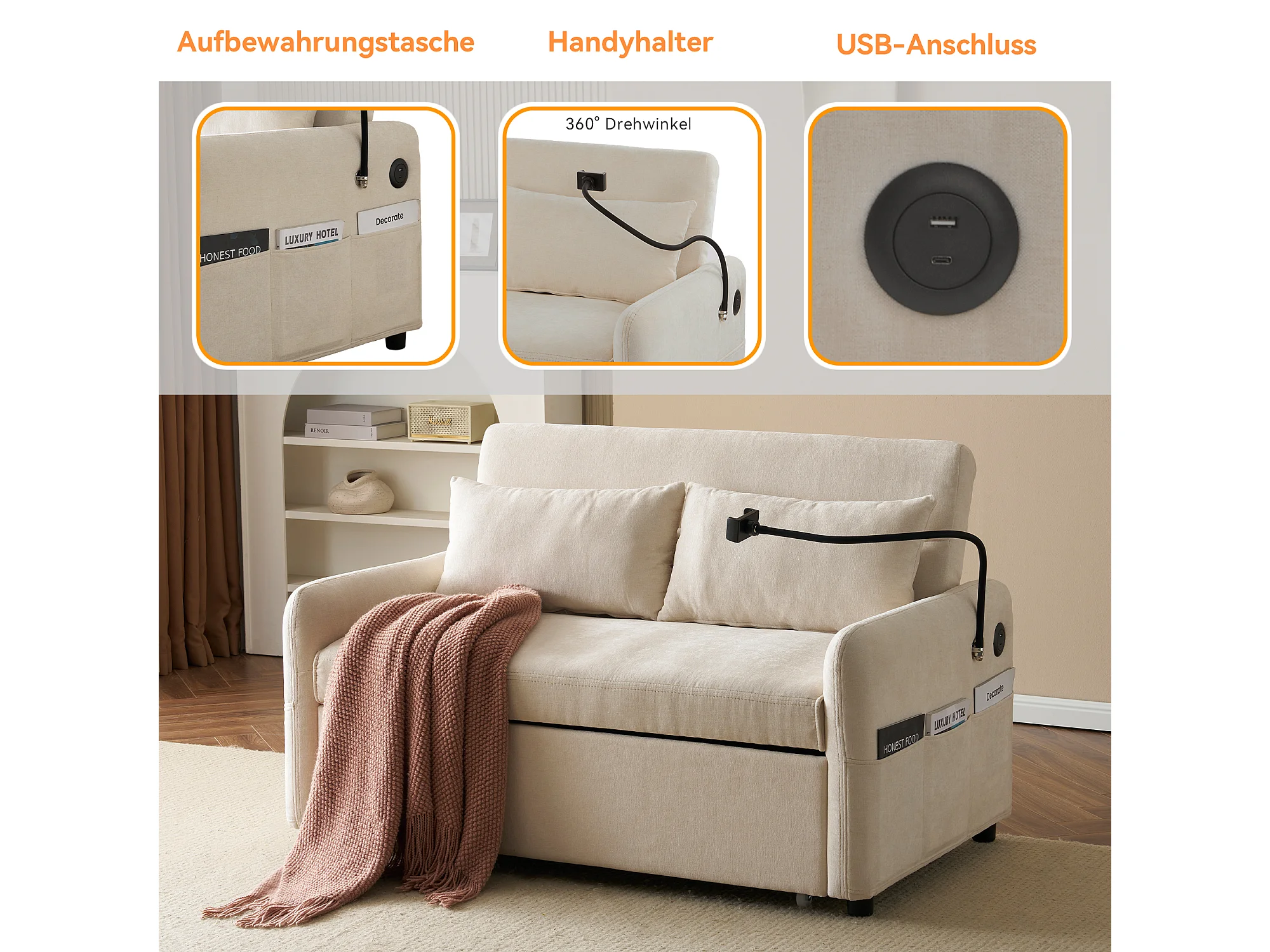 Canapé-lit 2 places multifonction, dossier inclinable, avec support téléphone et port USB, parfait pour salon ou appartement moderne