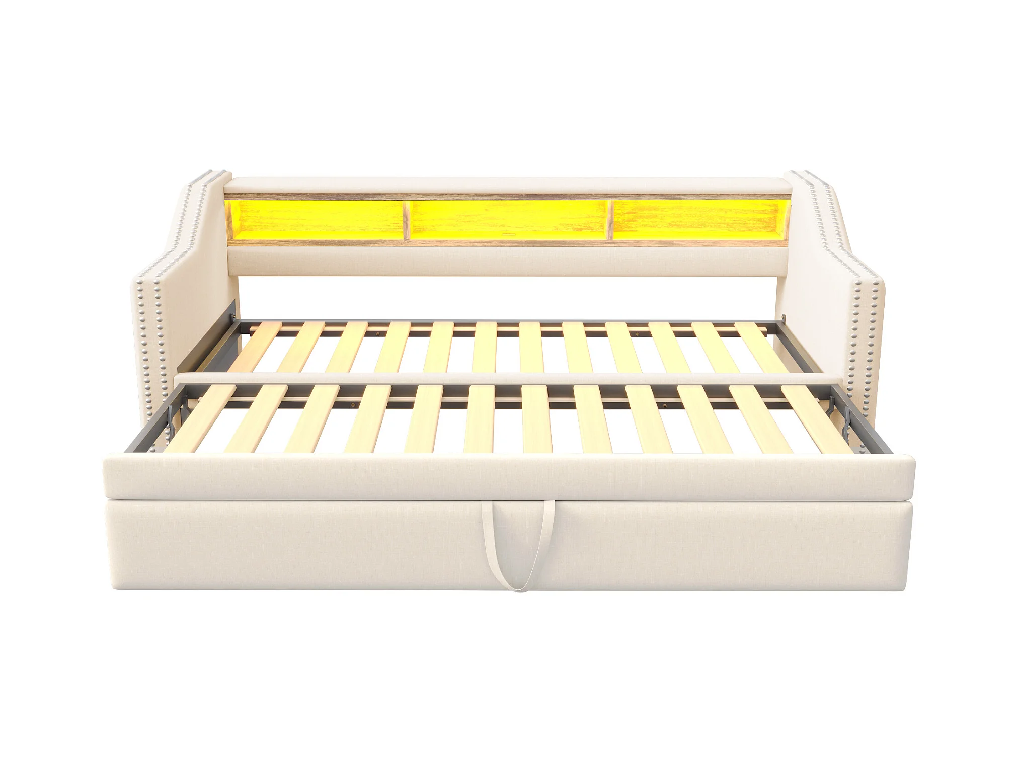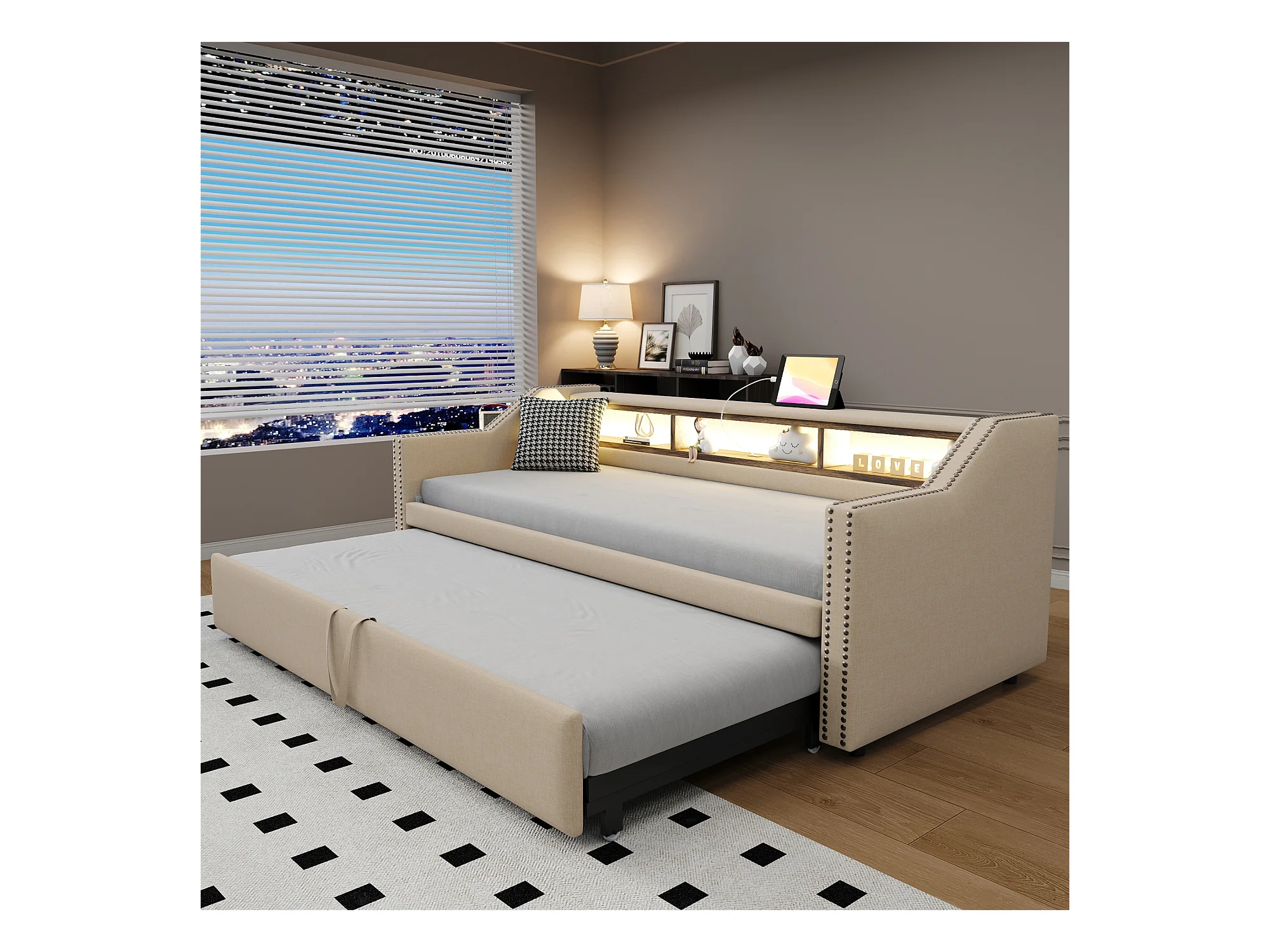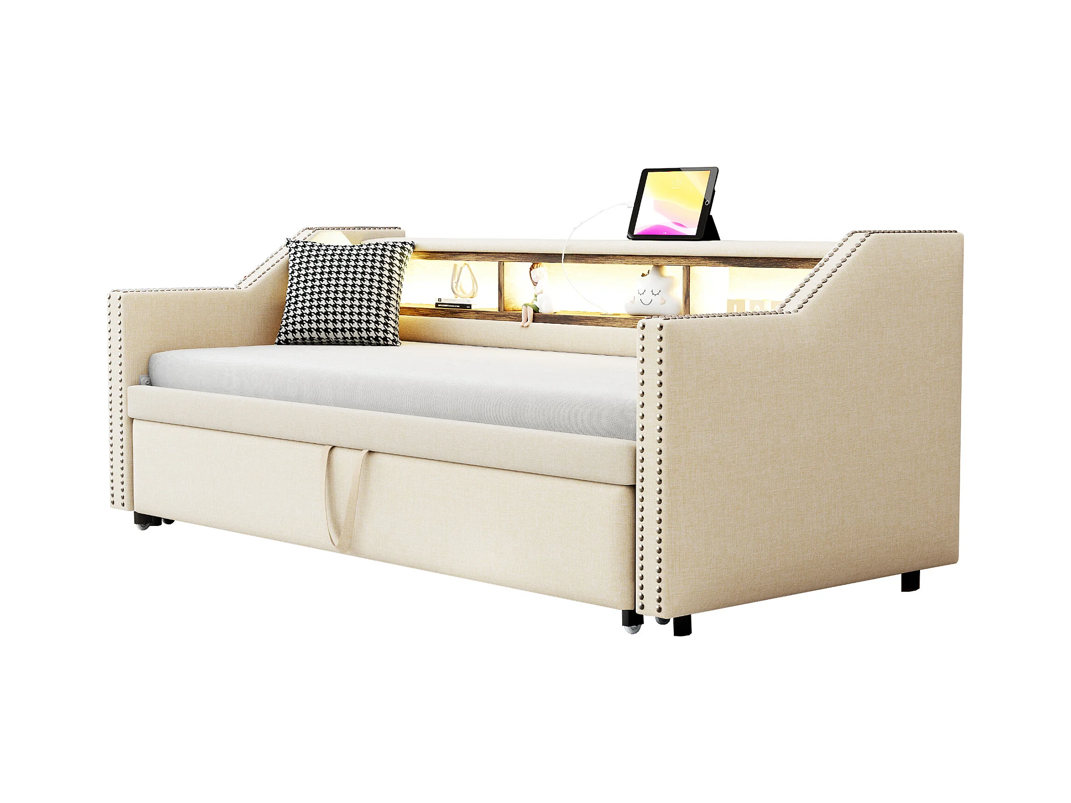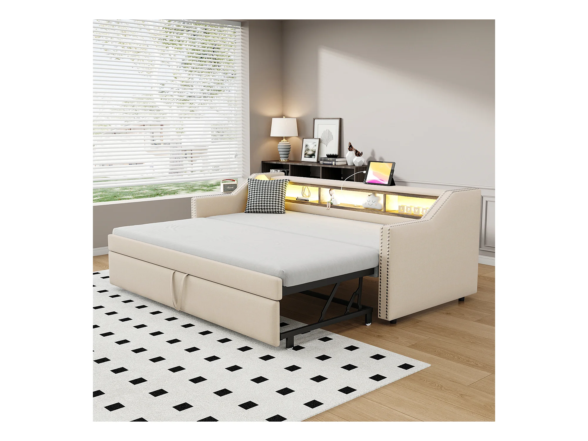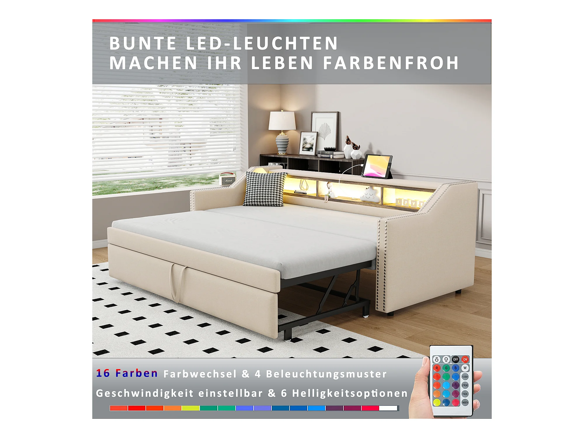 Canapé-lit 90/180 x 190 cm, Lit Extensible, Rangement Multifonctionnel, LED et Prise USB, avec Sommier à Lattes, Lin, Beige (203.5x102x74 cm)