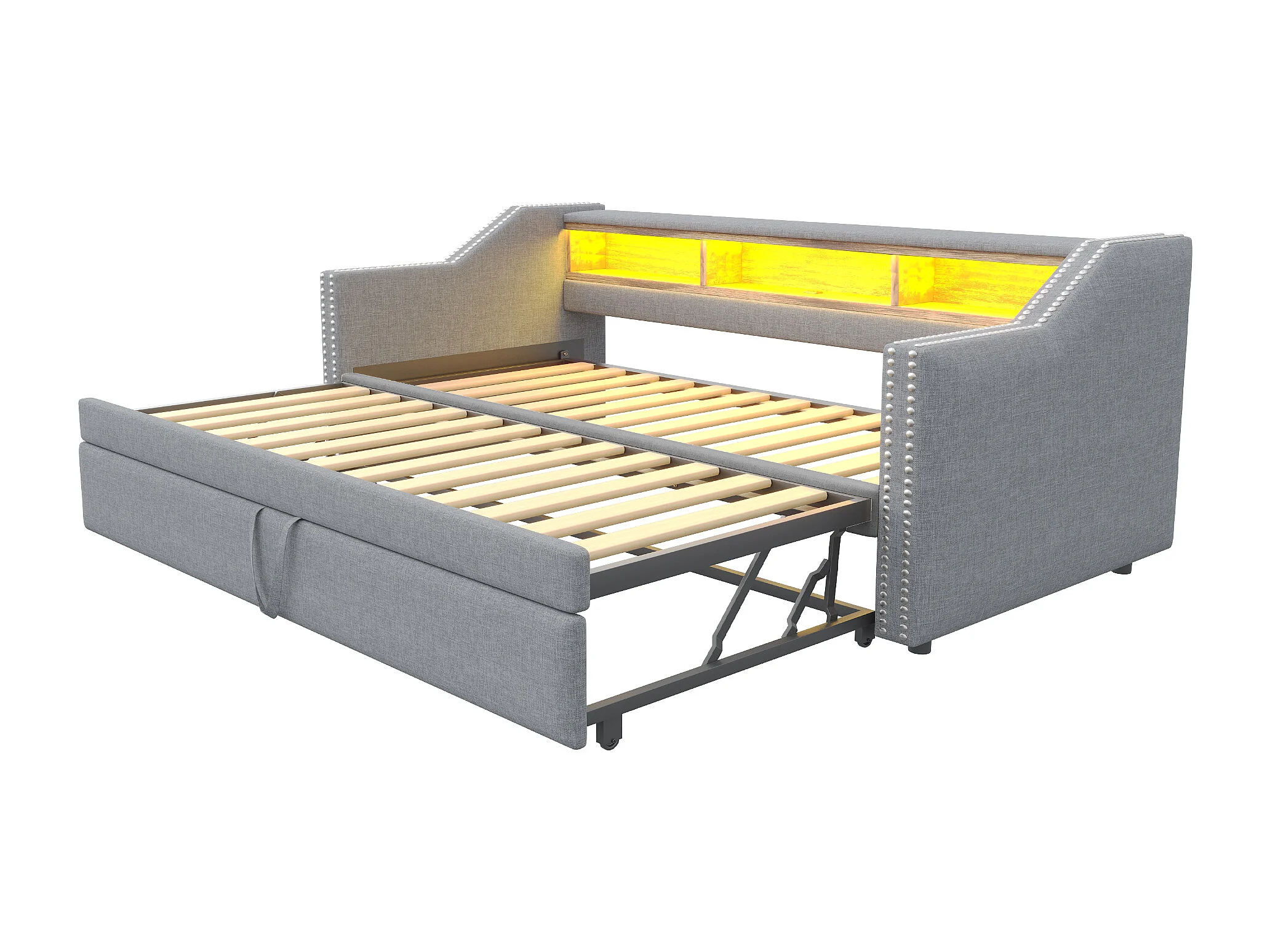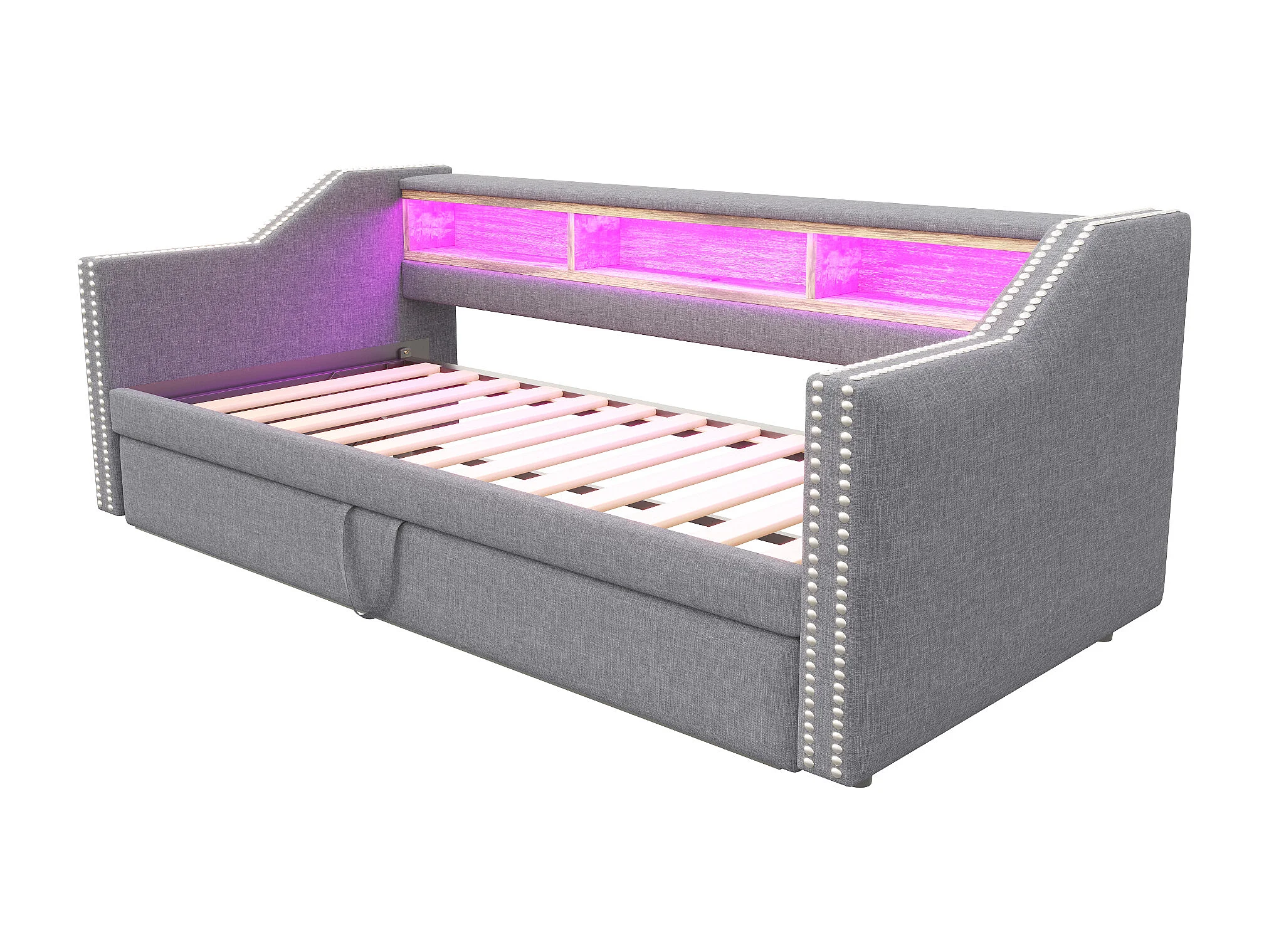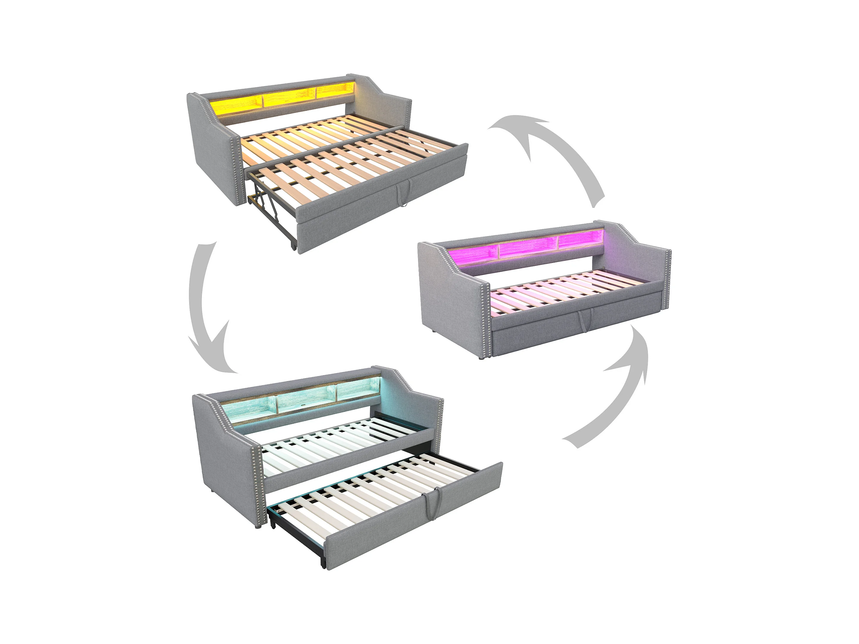 Canapé-lit 90/180 x 190 cm, Lit Extensible, Rangement Multifonctionnel, LED et Prise USB, avec Sommier à Lattes, Lin, Gris Clair (203.5x102x74 cm)