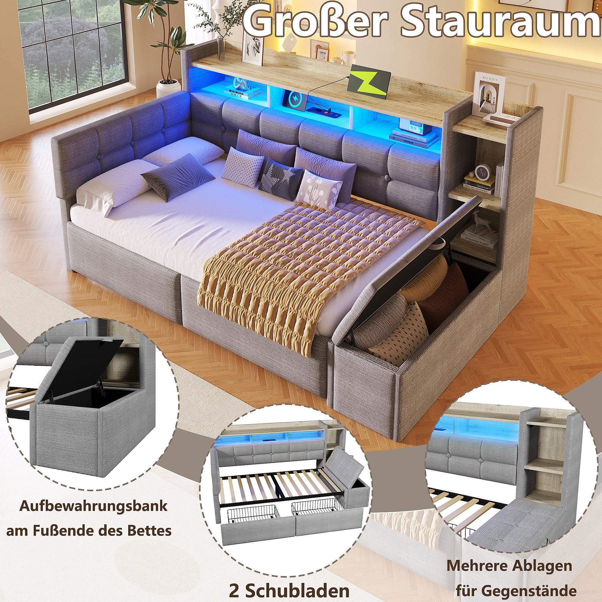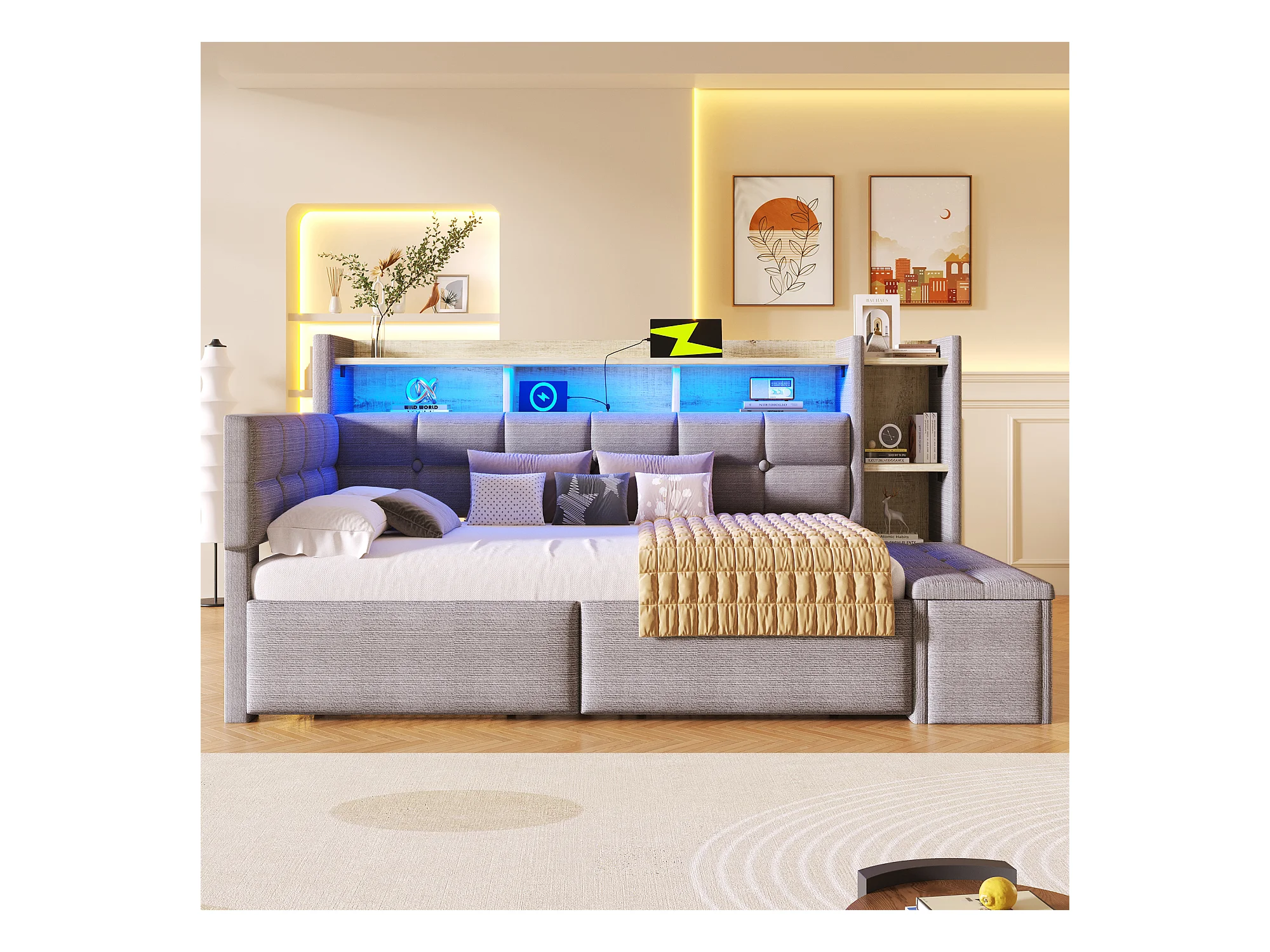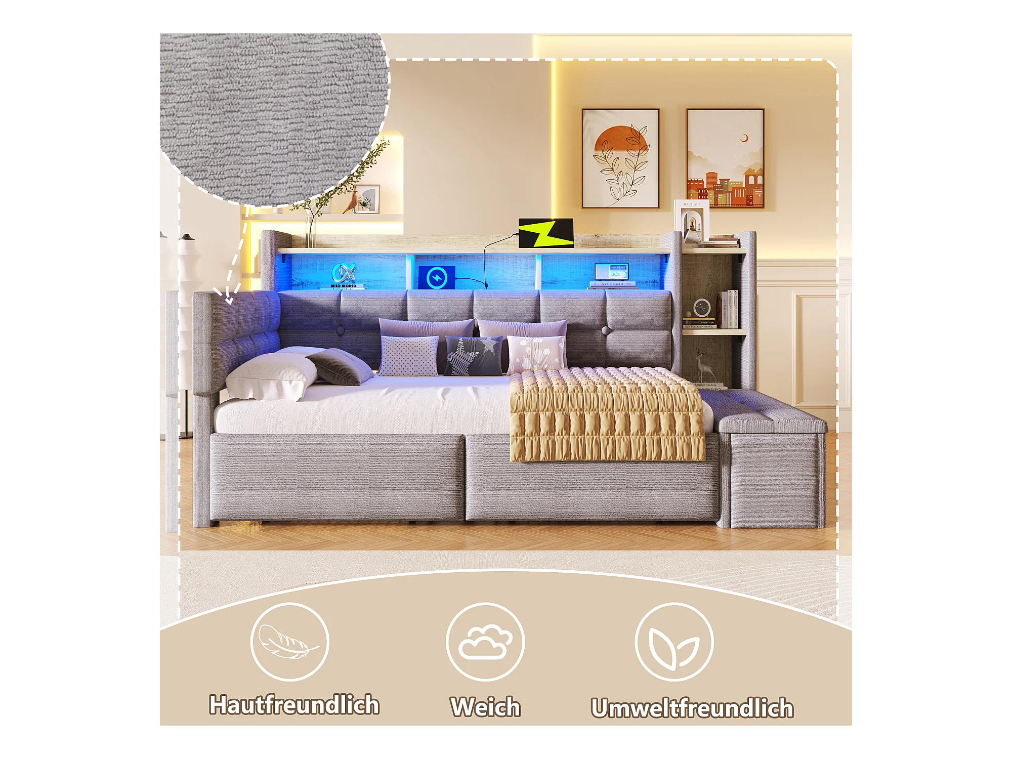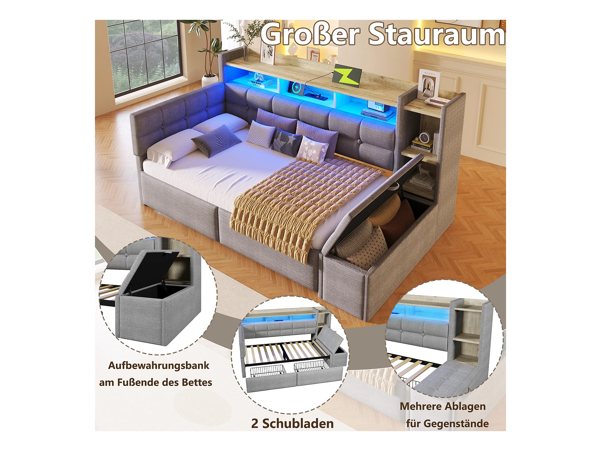 Canapé-lit 90 x 190 cm - avec 2 tiroirs + USB + étagère + banc de rangement + Leds - velours - gris